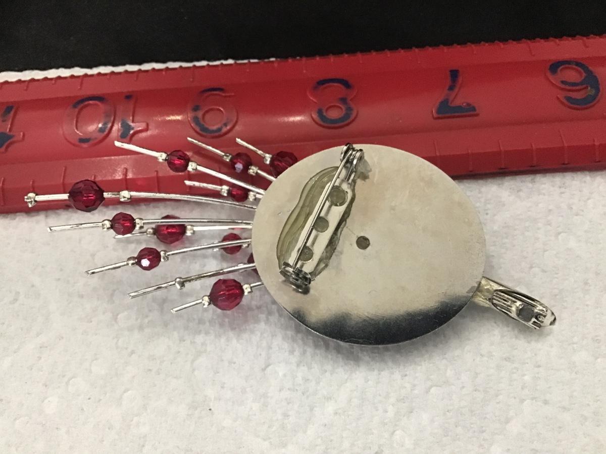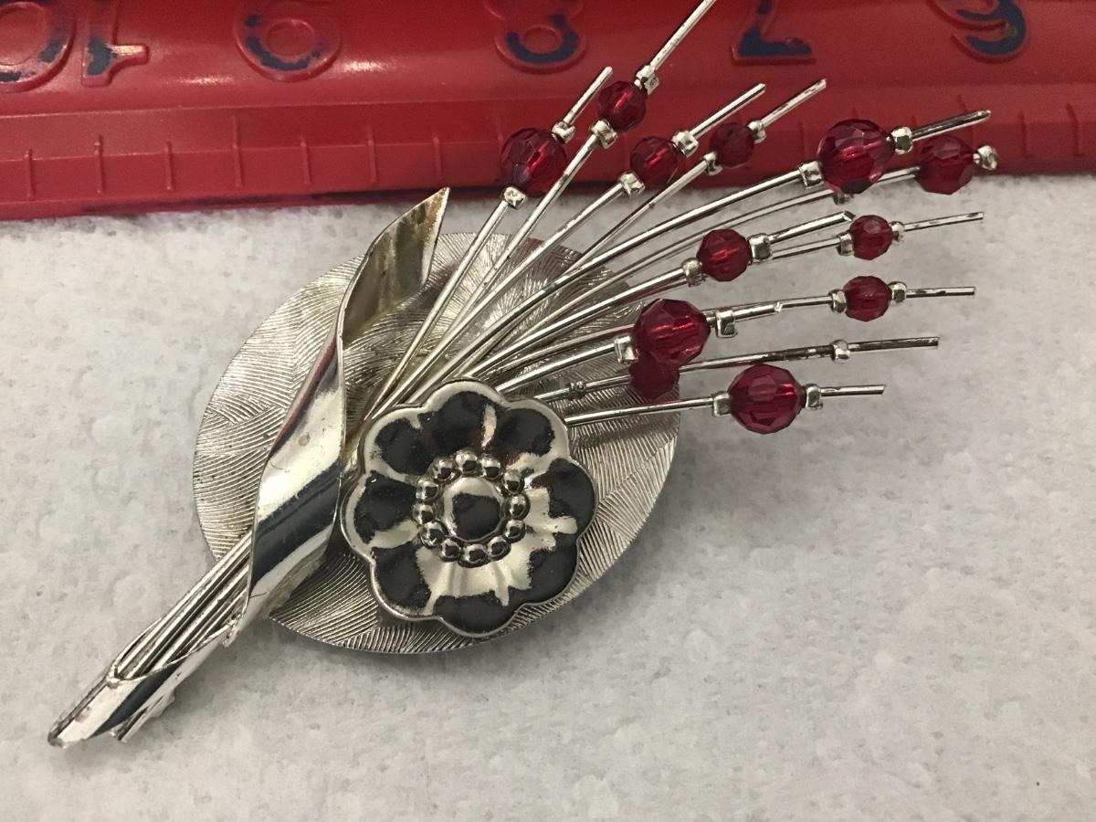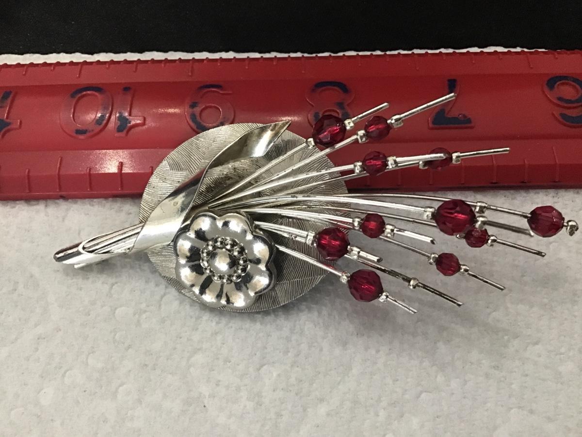 SilverTone Brooch Silver Spray with Pomegranate Color Beads