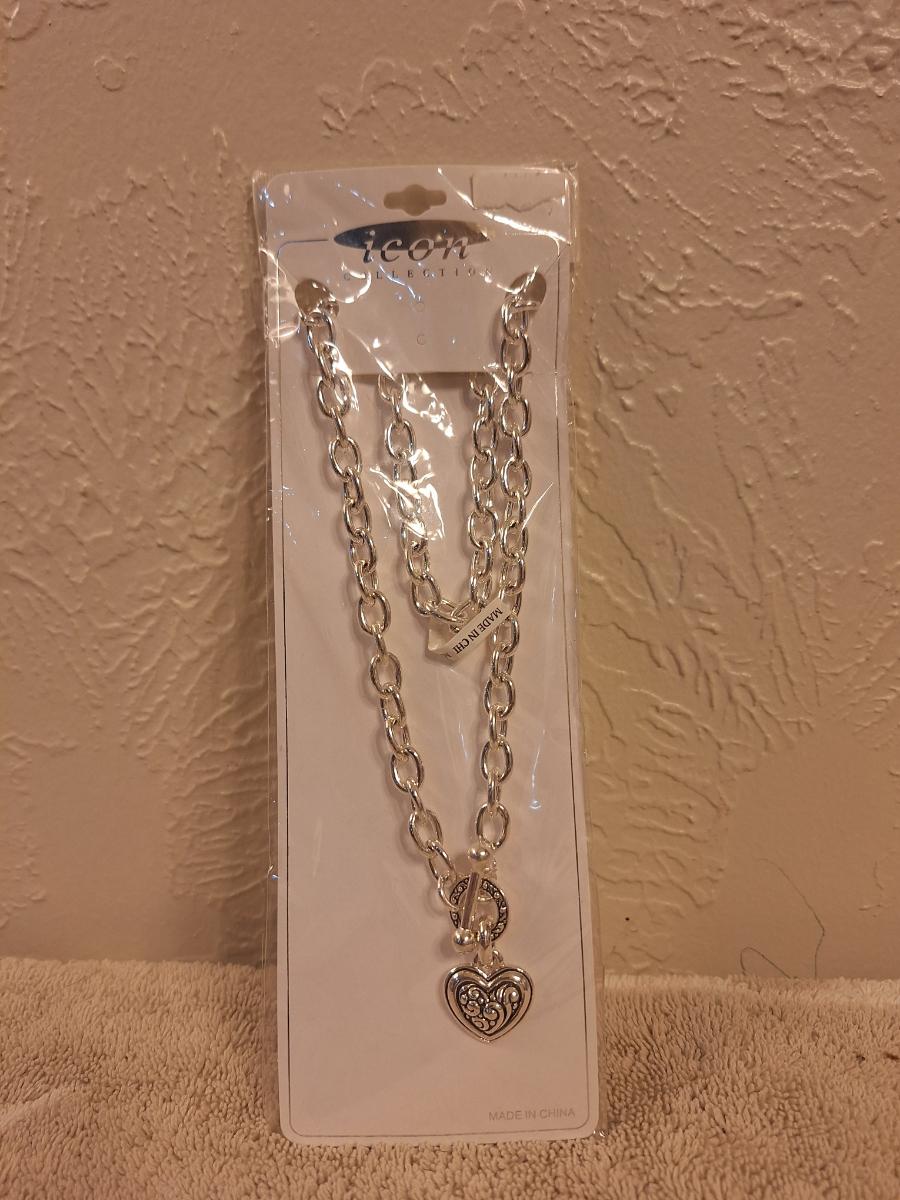silver-tone chunky rolo chain toggle necklace with a heart pendant by the brand Icon.