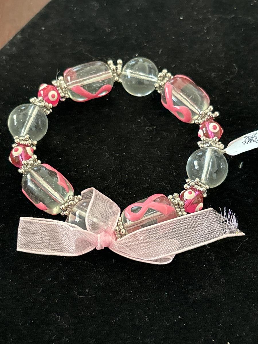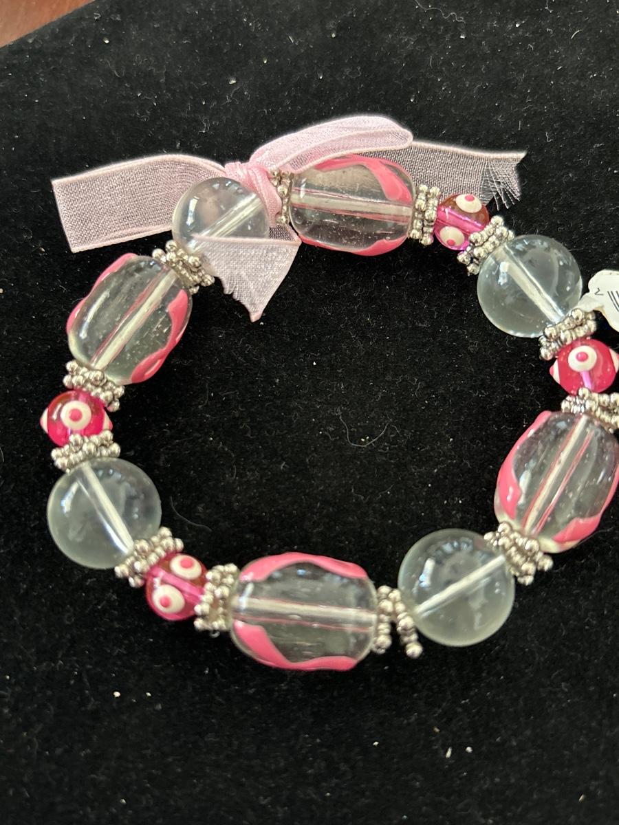 Silver-tone Clear Pink Ribbon Hearts White Women's Fashion Stretch Bracelet NWOT