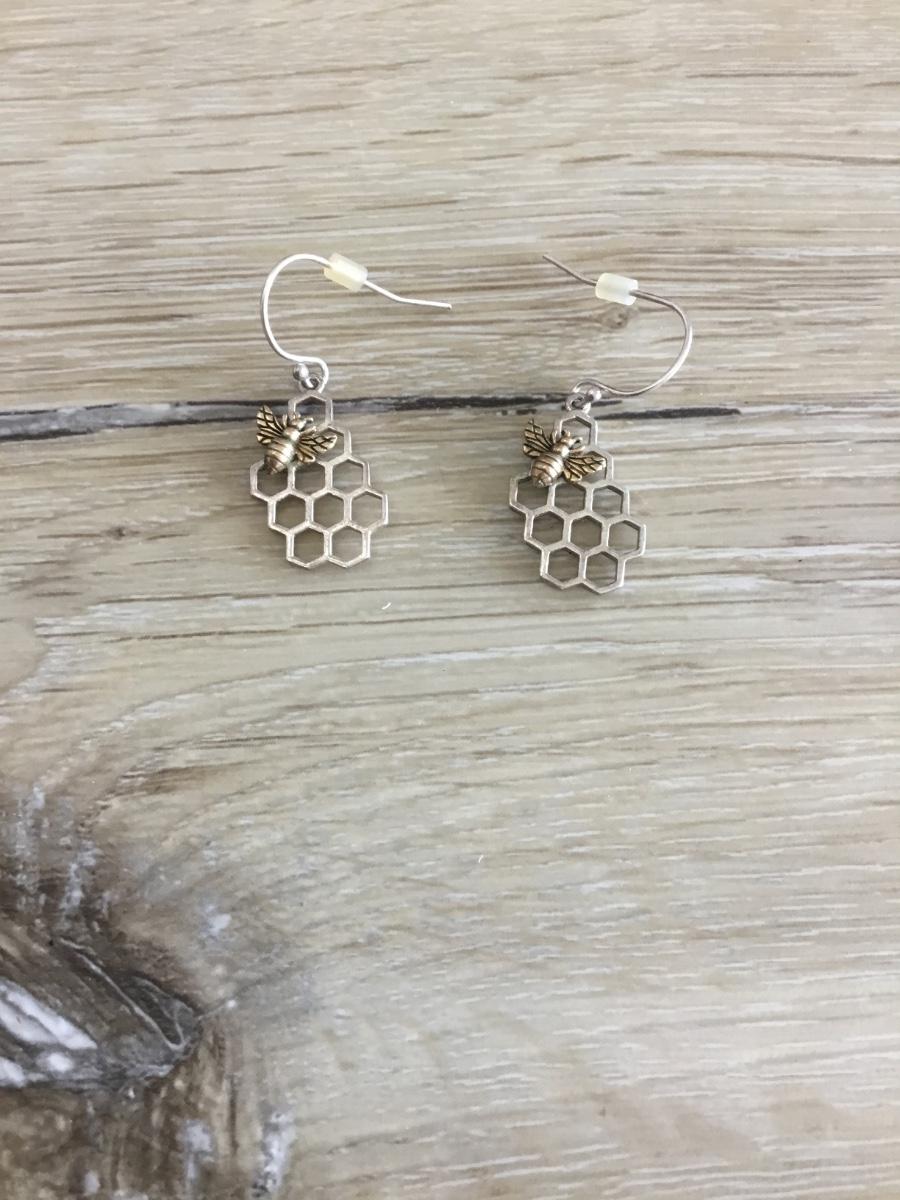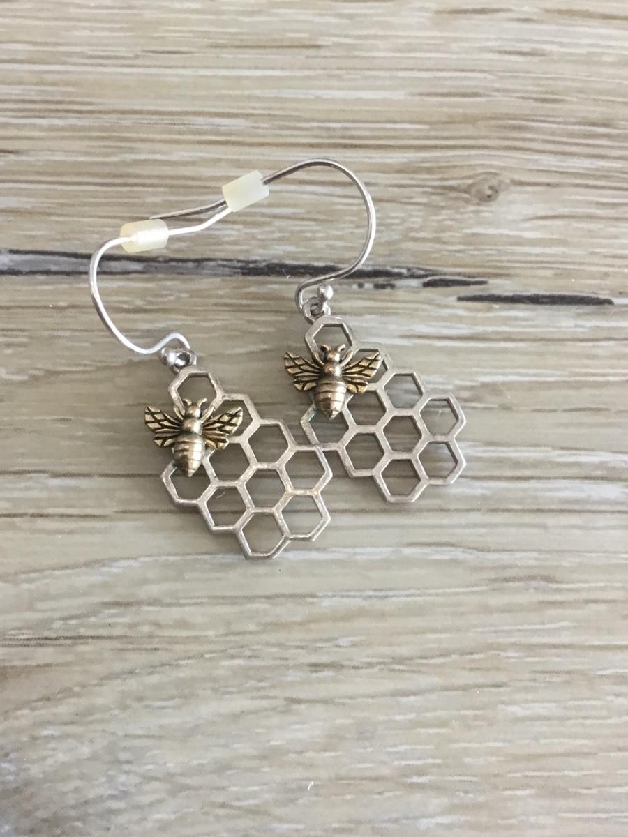 Silvertone honeycomb with gold tone little bee Dangle earrings