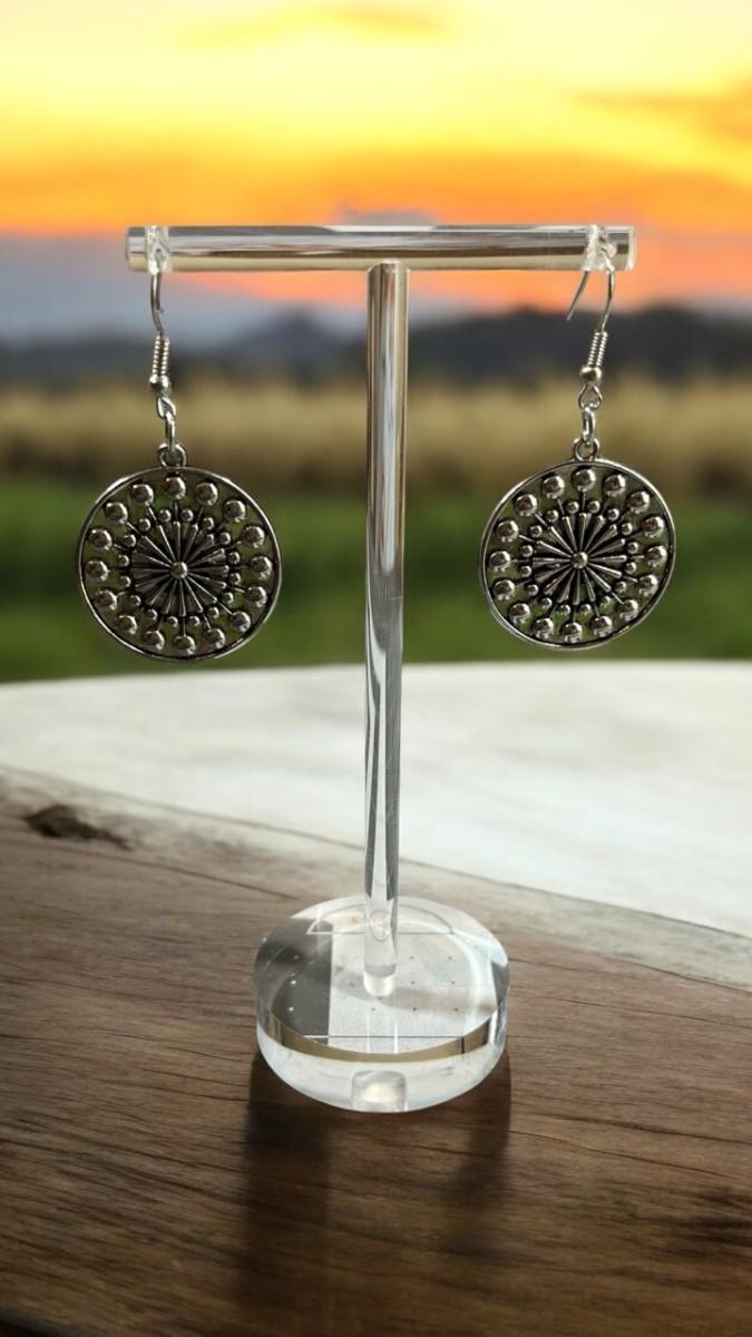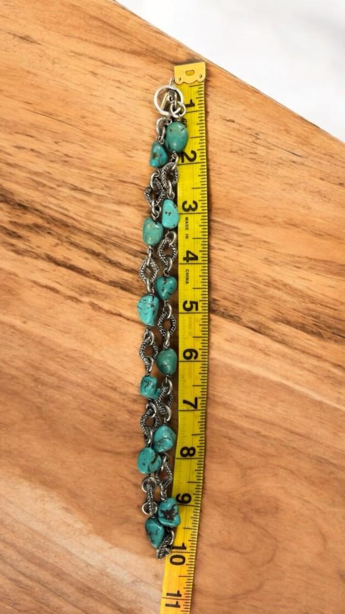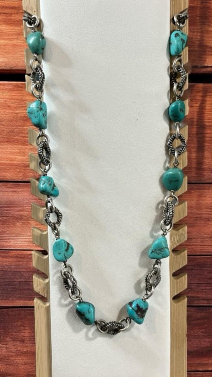Silver-tone necklace with turquoise beads, silvertone drop earrings and a silver-tone cuff bracelet! Necklace is 20" long, earrings are 2", cuff is 6.25" and is adjustable.
