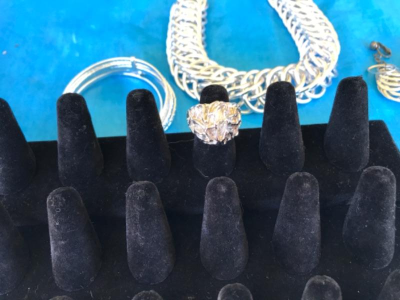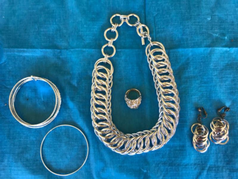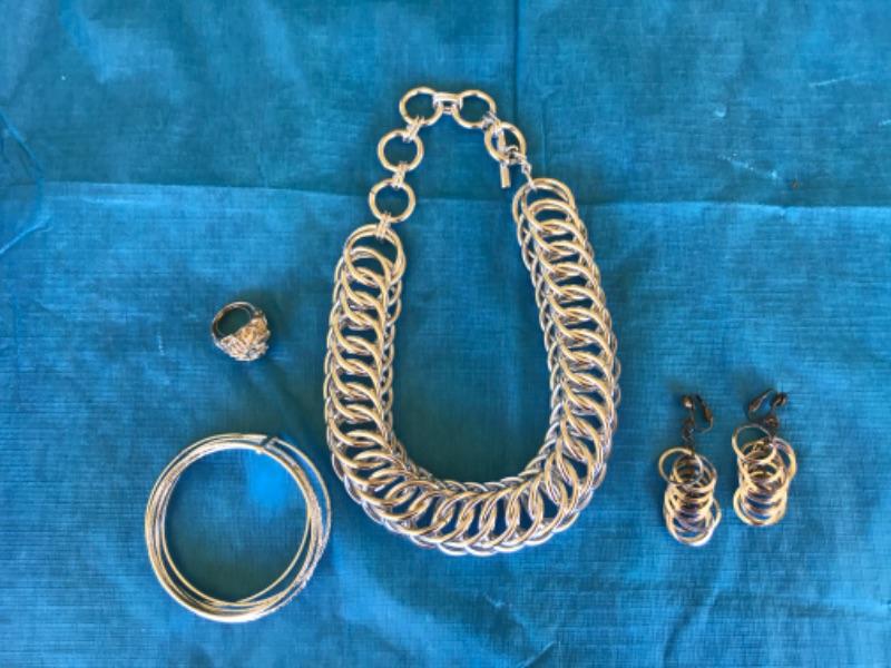 5 piece silvertone jewelry lot. Large link lightweight necklace, adjustable size ring, clip earrings, 1 bangle, and a multi bangle bracelet.