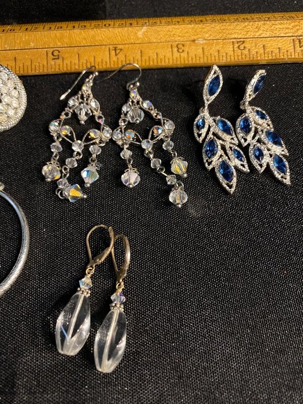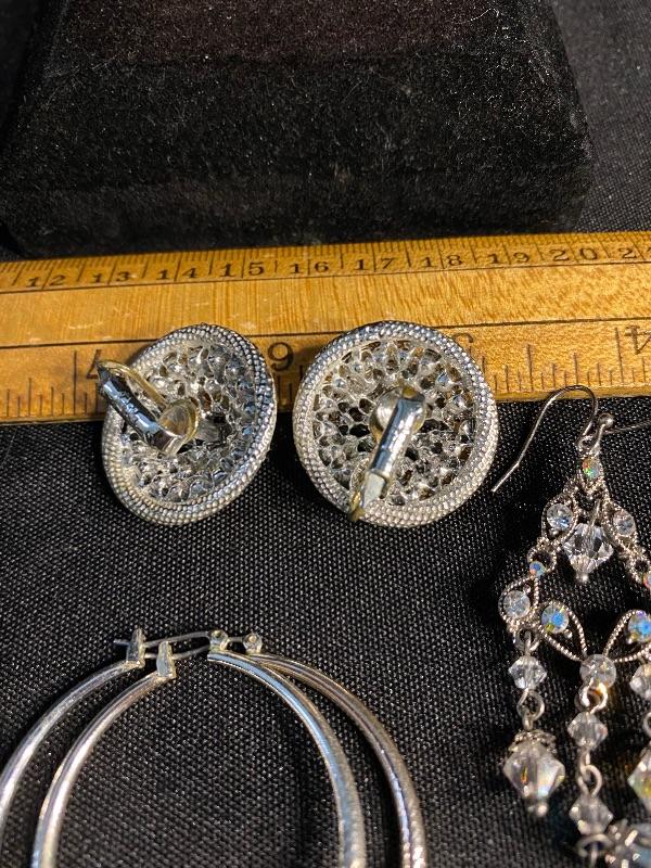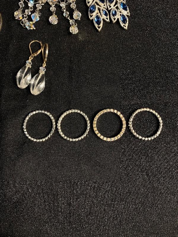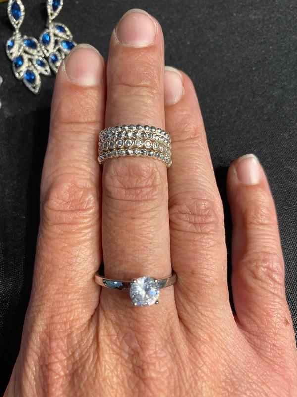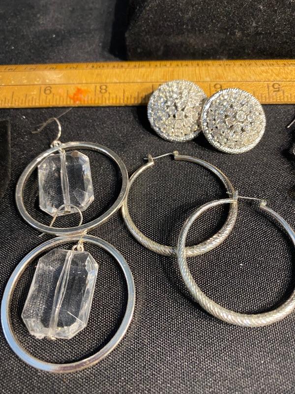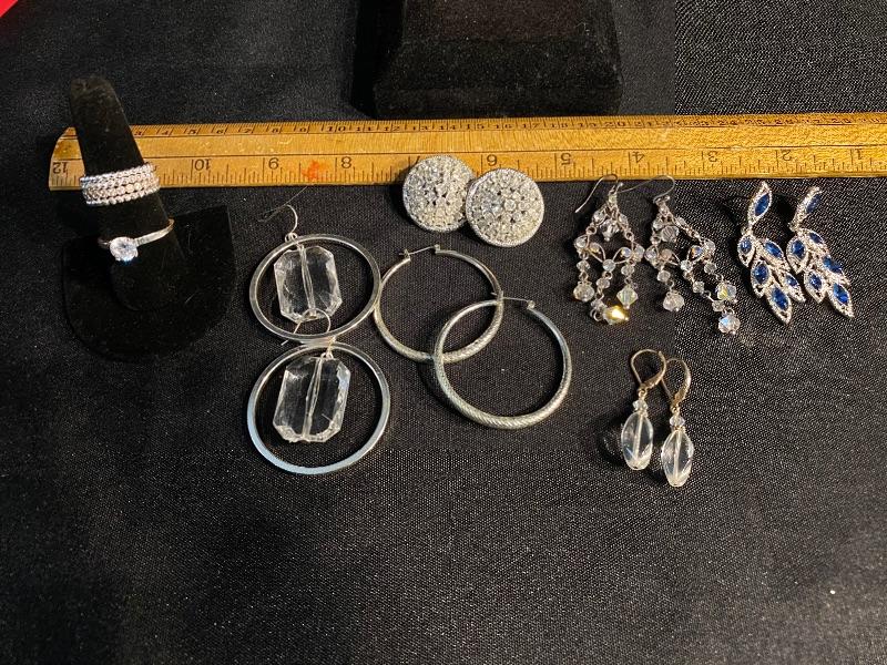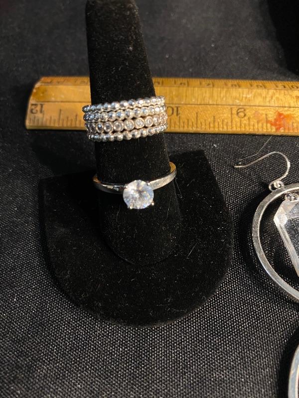 Silvertone Jewelry Lot. 6 pairs of earrings, one pair is clip style. Also included is a solitaire style ring and stacking rings. Previously used.