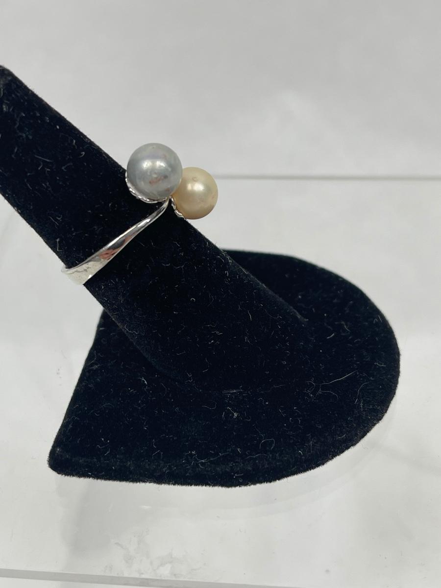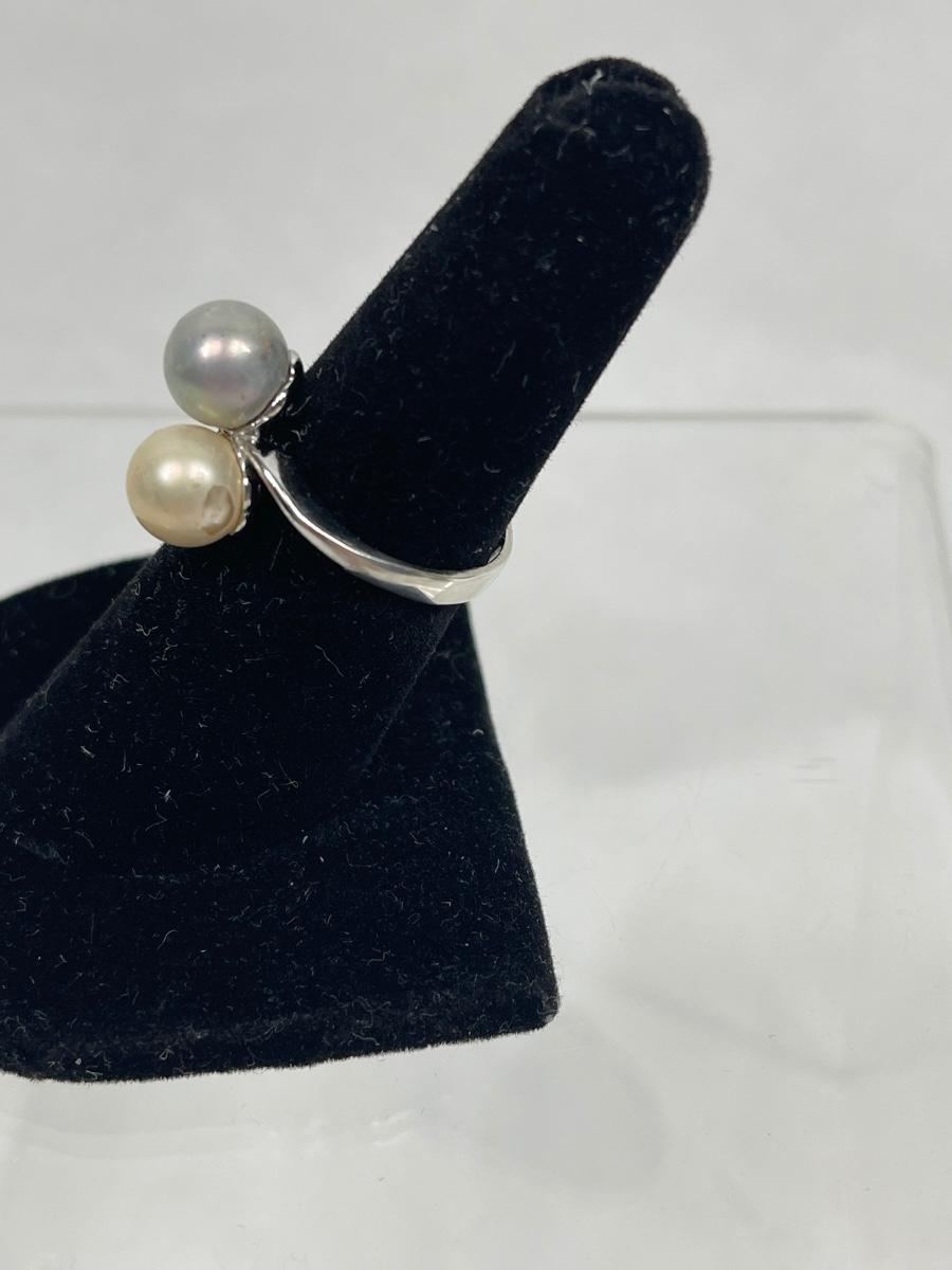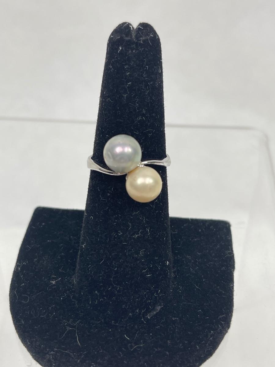 Bright, shiny finish on the ring and the pearls are in 2 different tones: one a typical pearl color, the other is slightly silver toned. In good condition.