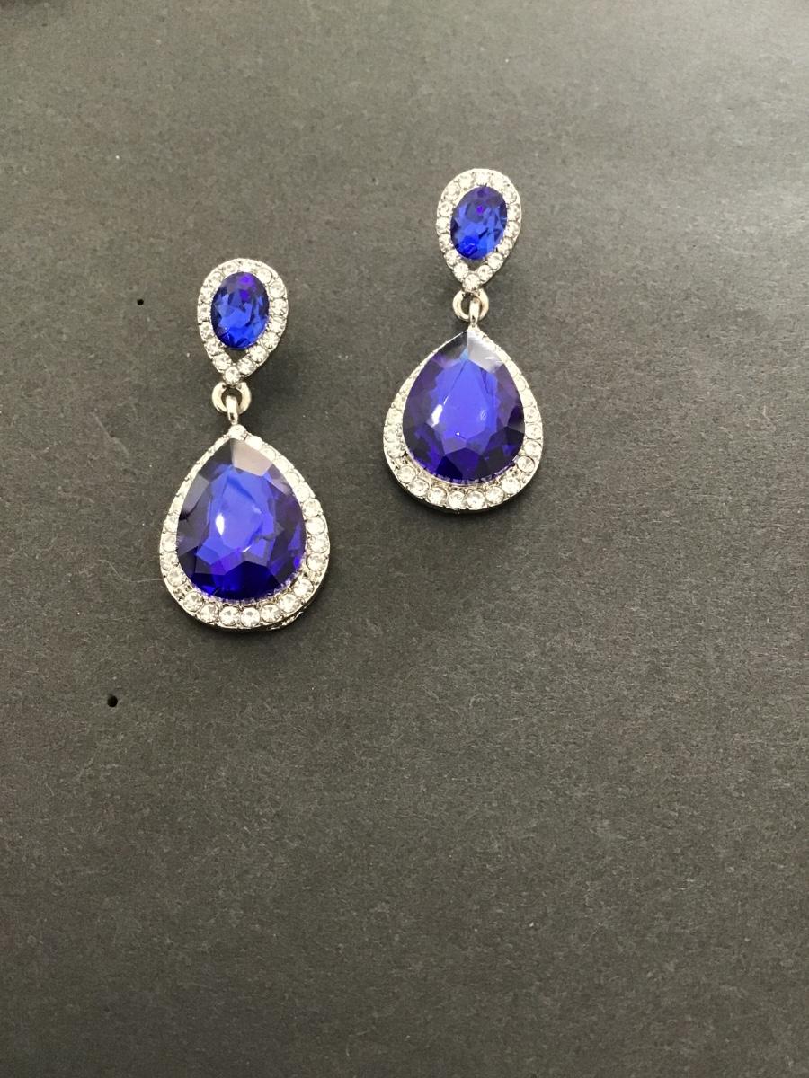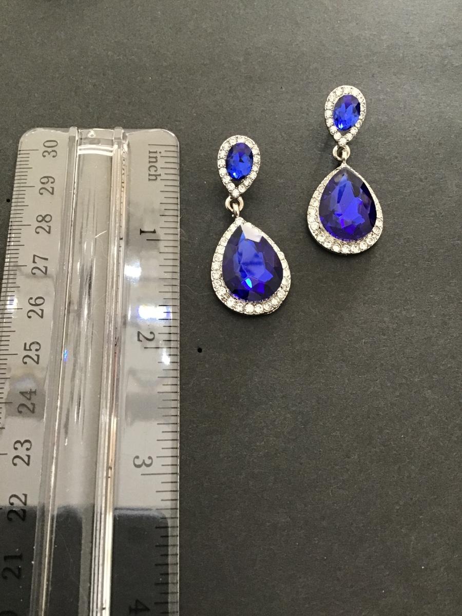 Silver tone with blue rhinestones fashion earrings. Please see attached photos.