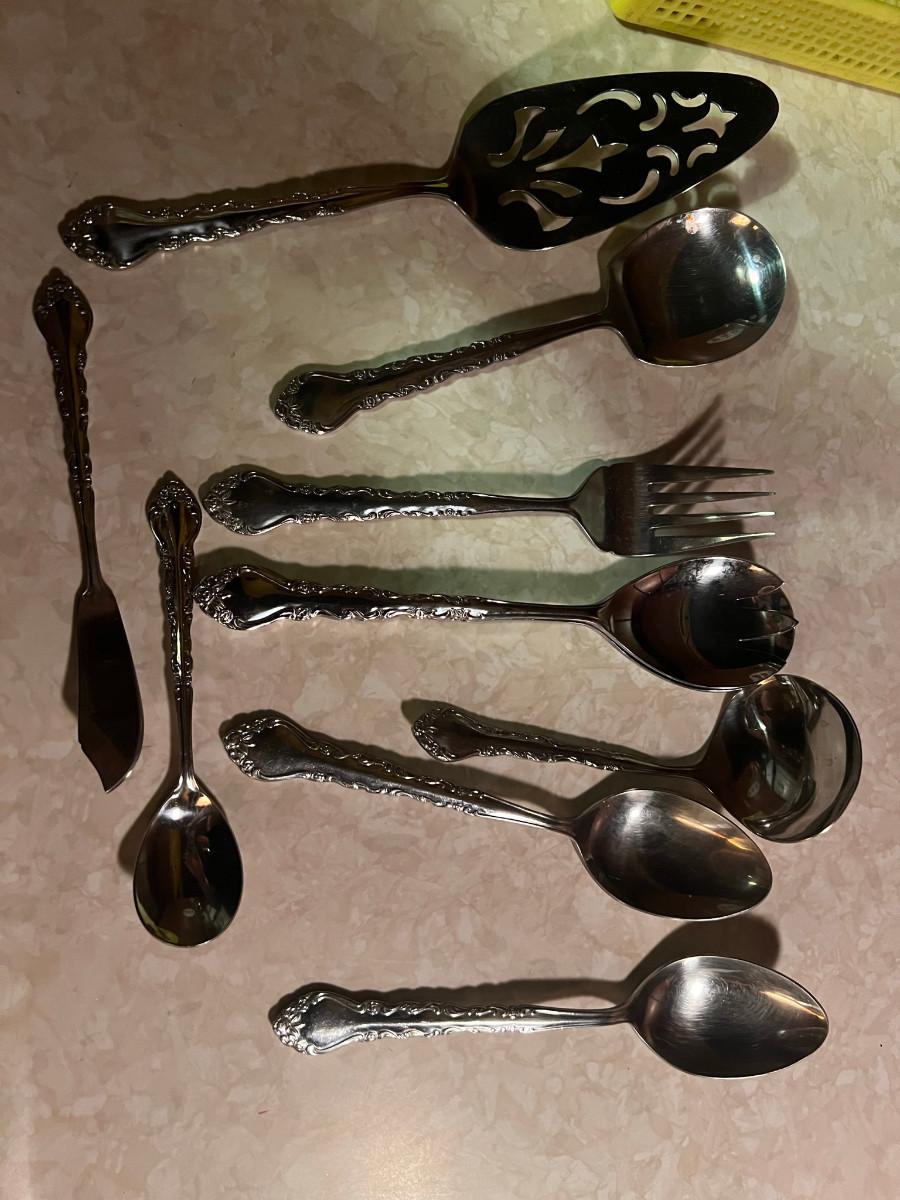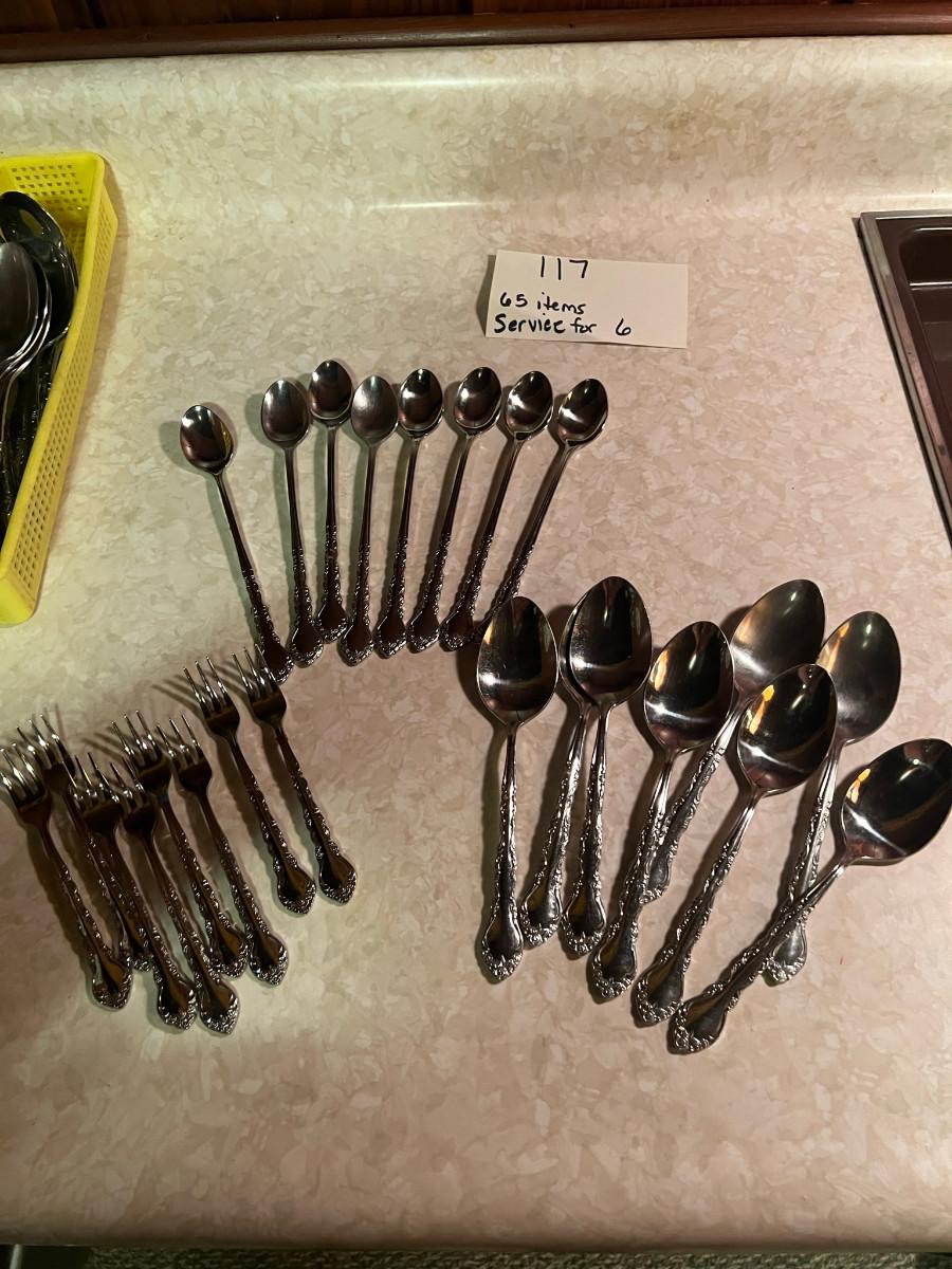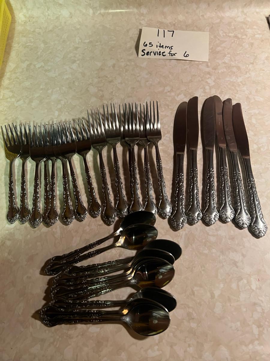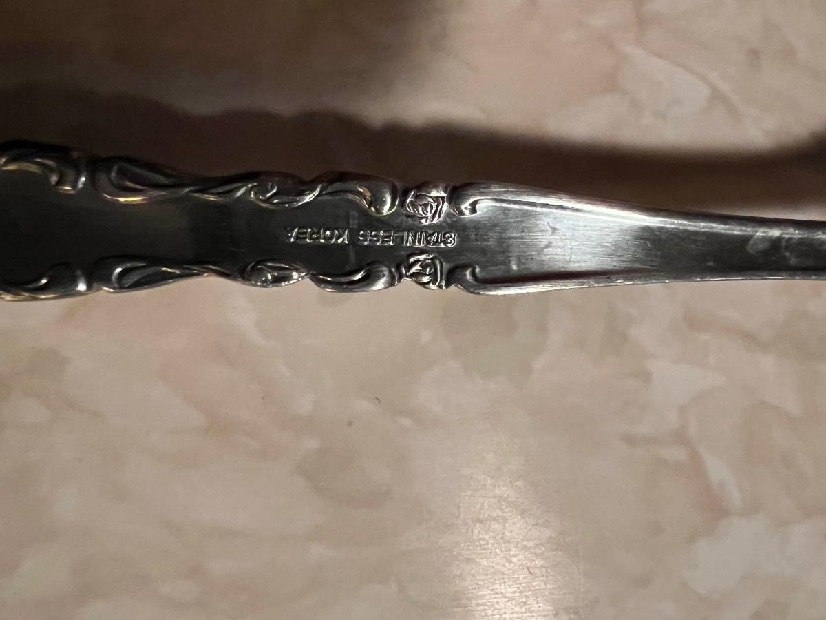 Stainless made in Korea 6 knives, 6 dinner forks, 8 salad forks, 8 cocktail forks, 10 teaspoons, 8 table spoons, 1 pie server, 1 gravey ladel, 4 serving spoons, 1 butter knife, 2 serving forks, 1 sugar spoon, 8 ice tea spoons and silverware holding tray 65 items service for 6