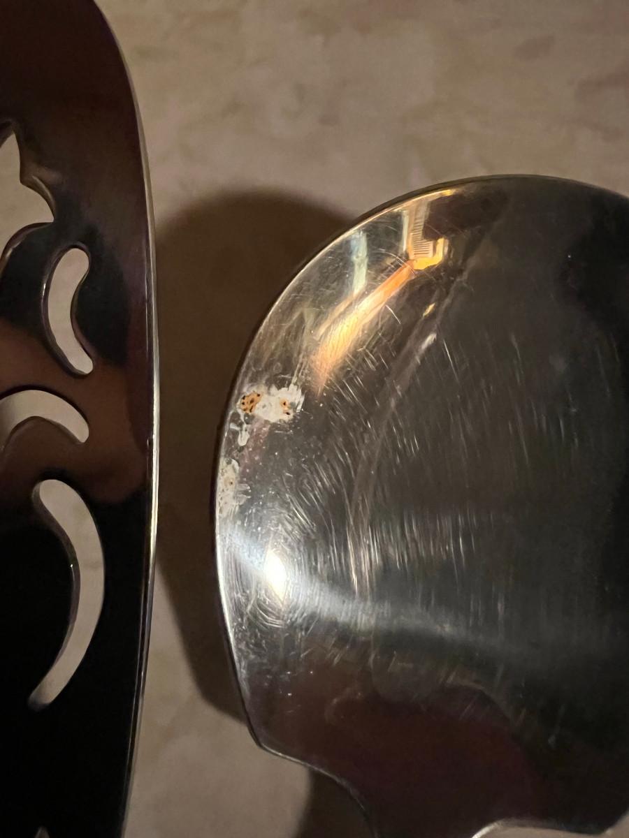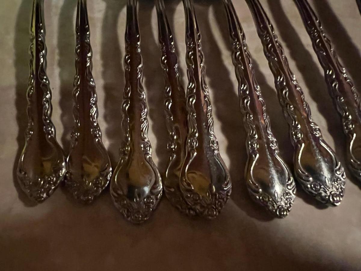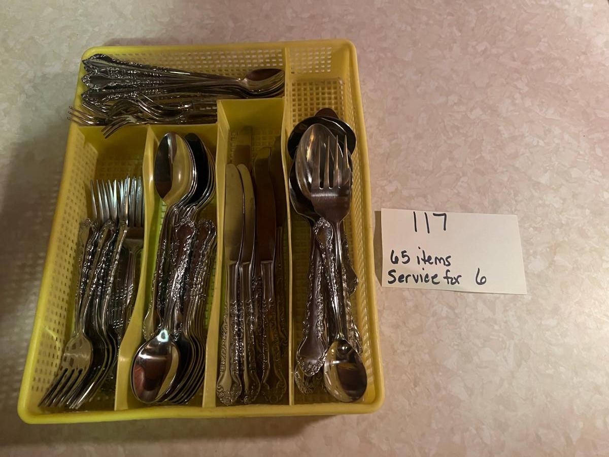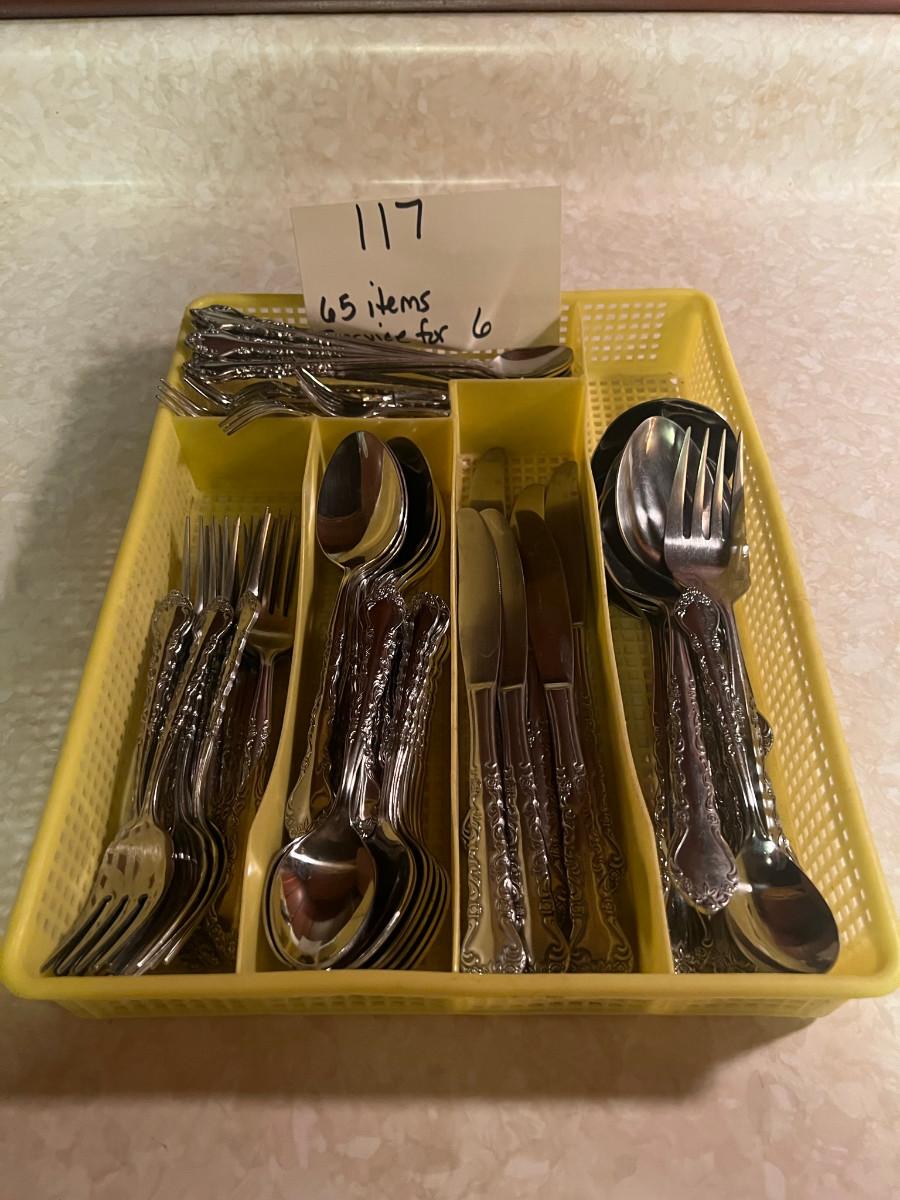 Stainless made in Korea 6 knives, 6 dinner forks, 8 salad forks, 8 cocktail forks, 10 teaspoons, 8 table spoons, 1 pie server, 1 gravey ladel, 4 serving spoons, 1 butter knife, 2 serving forks, 1 sugar spoon, 8 ice tea spoons and silverware holding tray 65 items service for 6