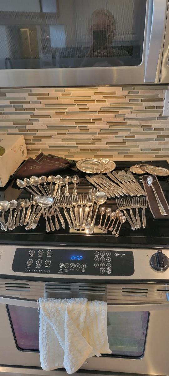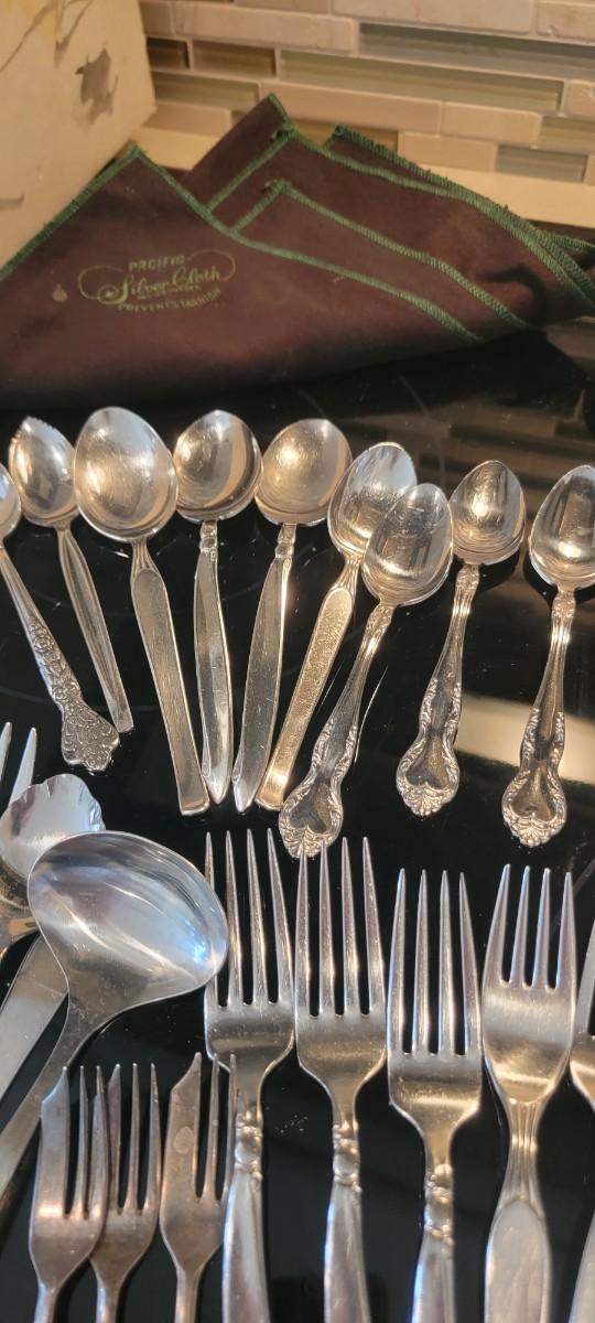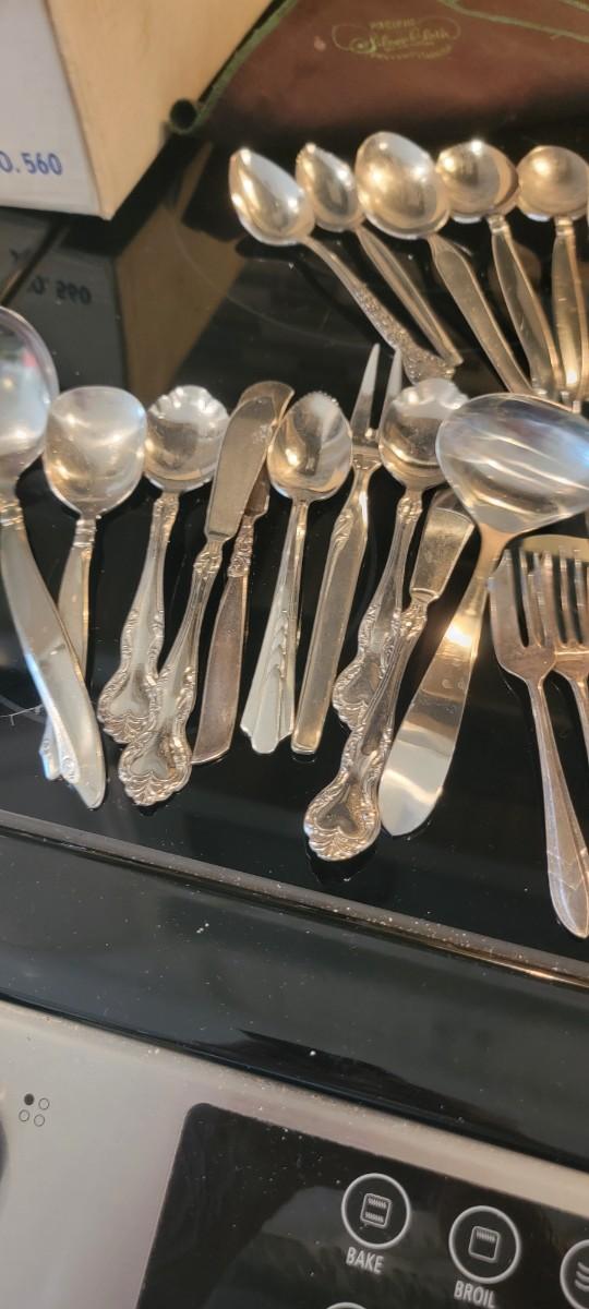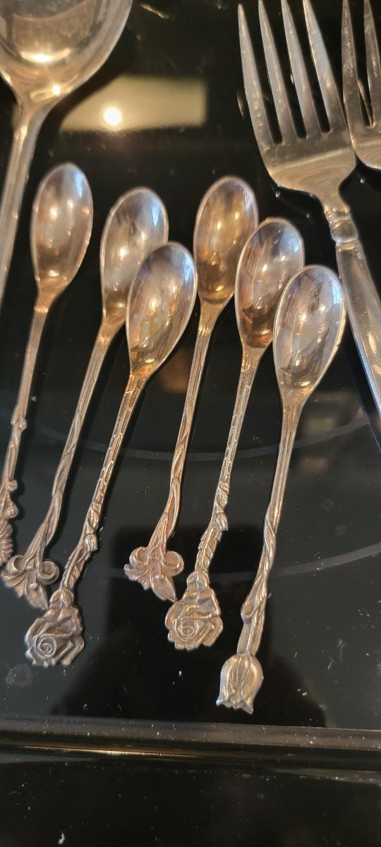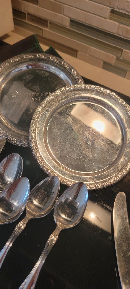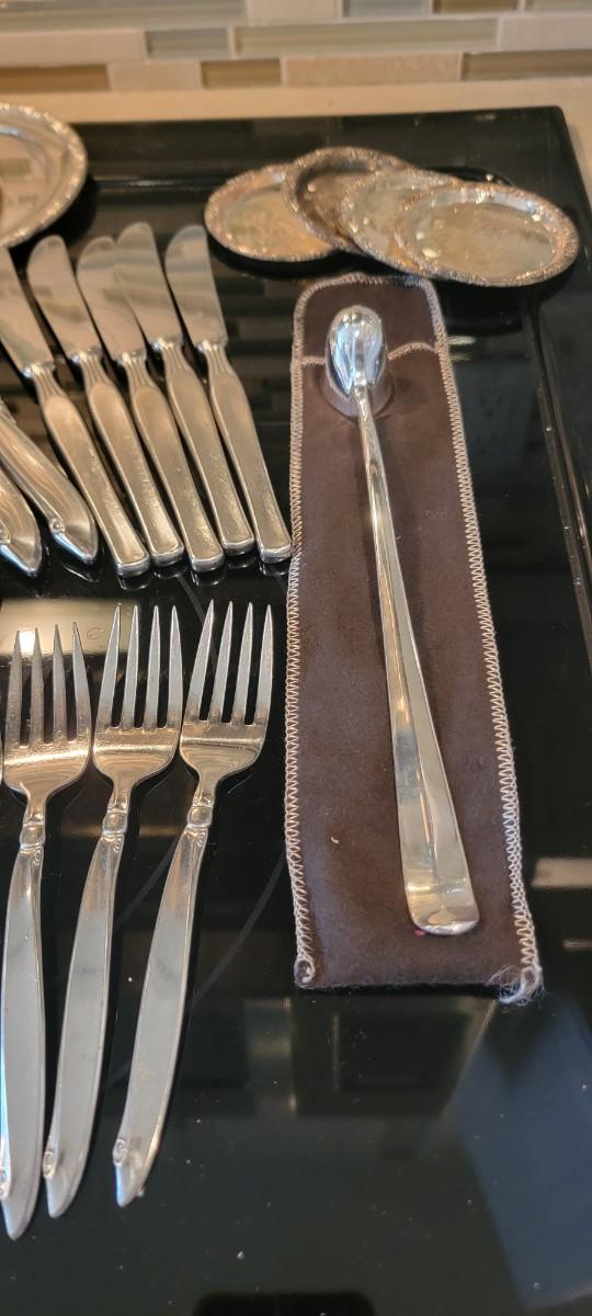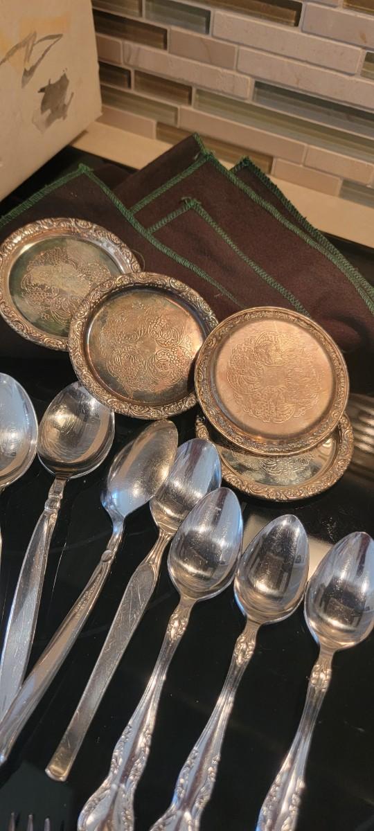 Miscellaneous silverware pieces. Four silver color engraved coasters. Collectible coffee spoons.