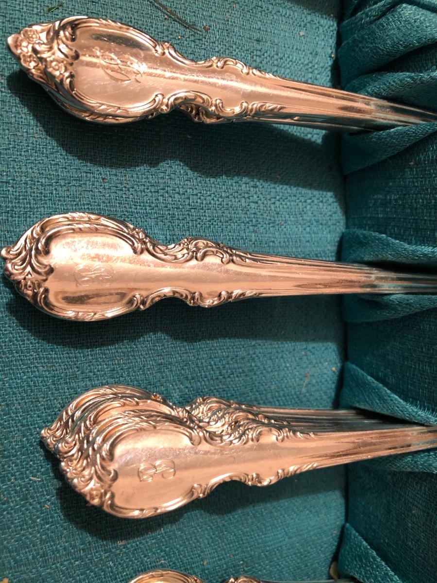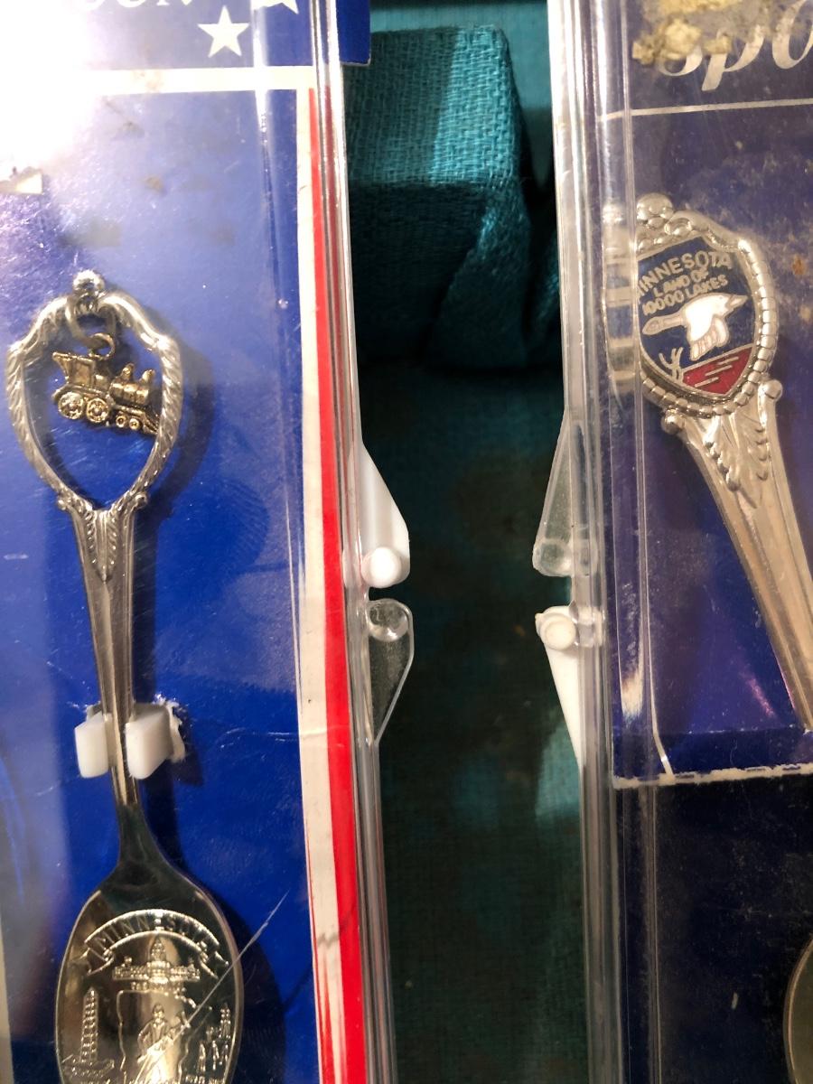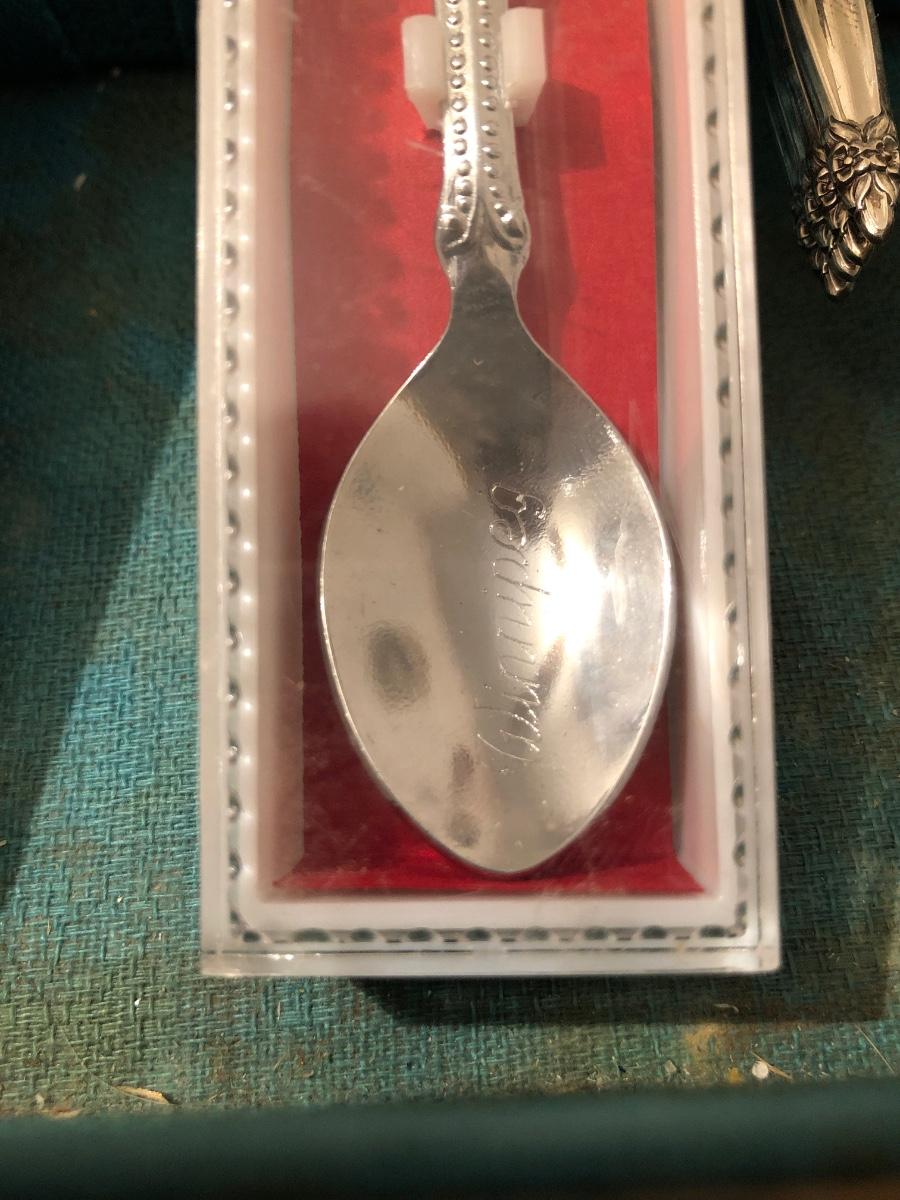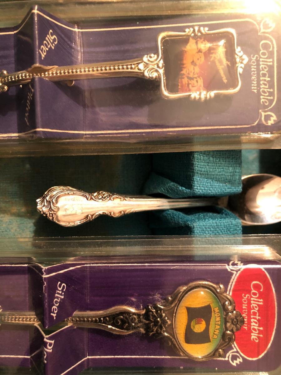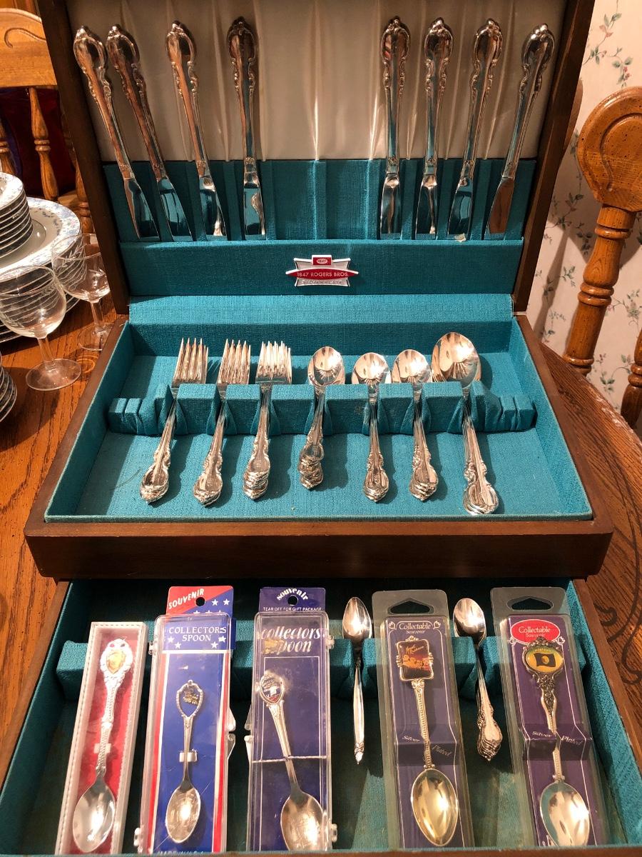 Rogers silverware set embossed w/ a “B” on each. 43 piece set not including the tiny spoons in the drawer. 5 souvenir spoons