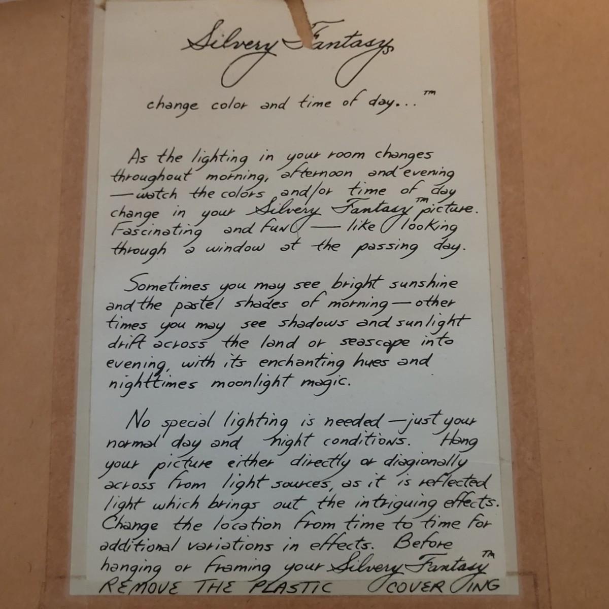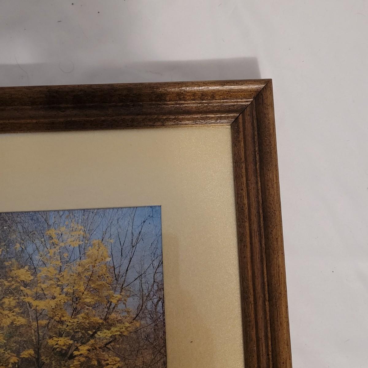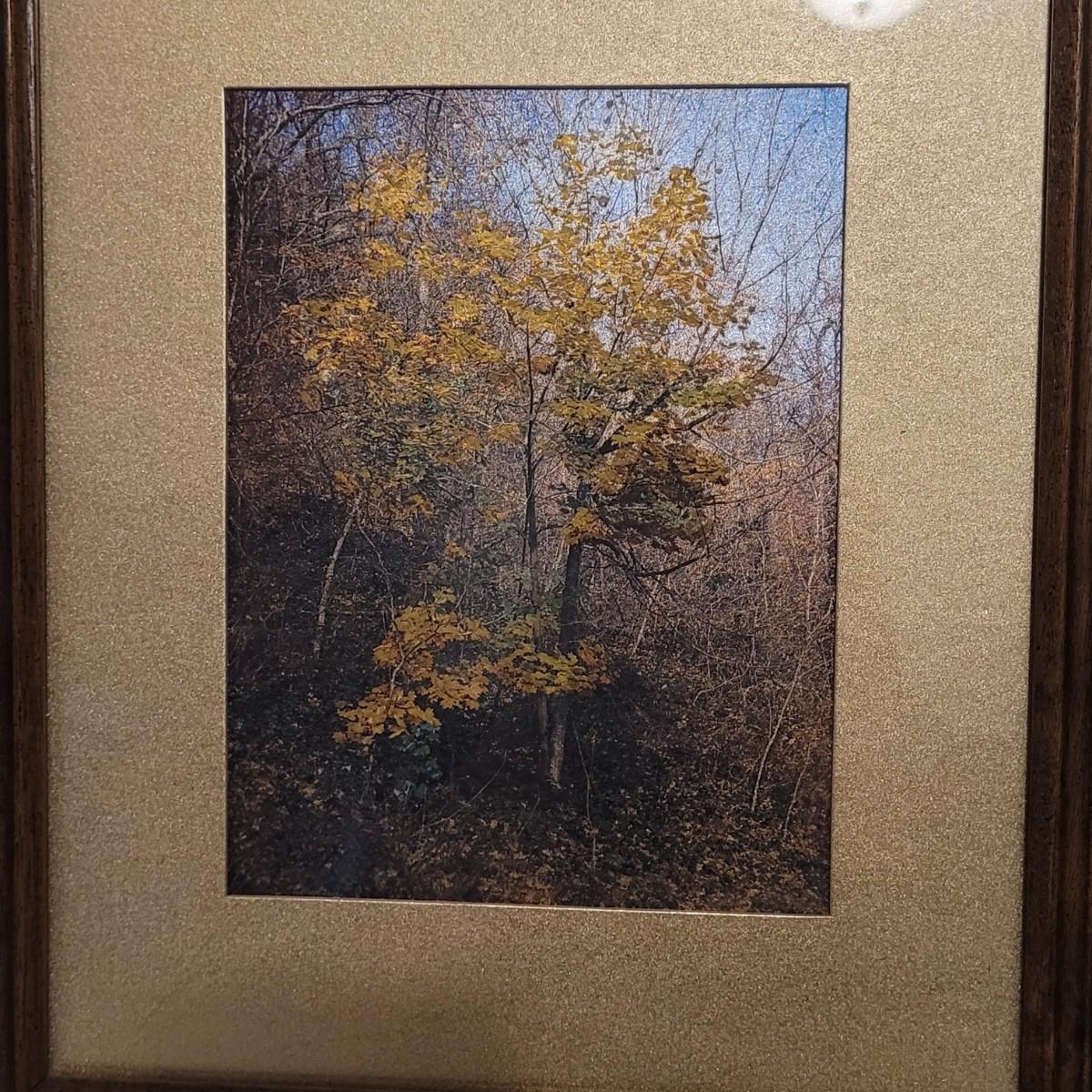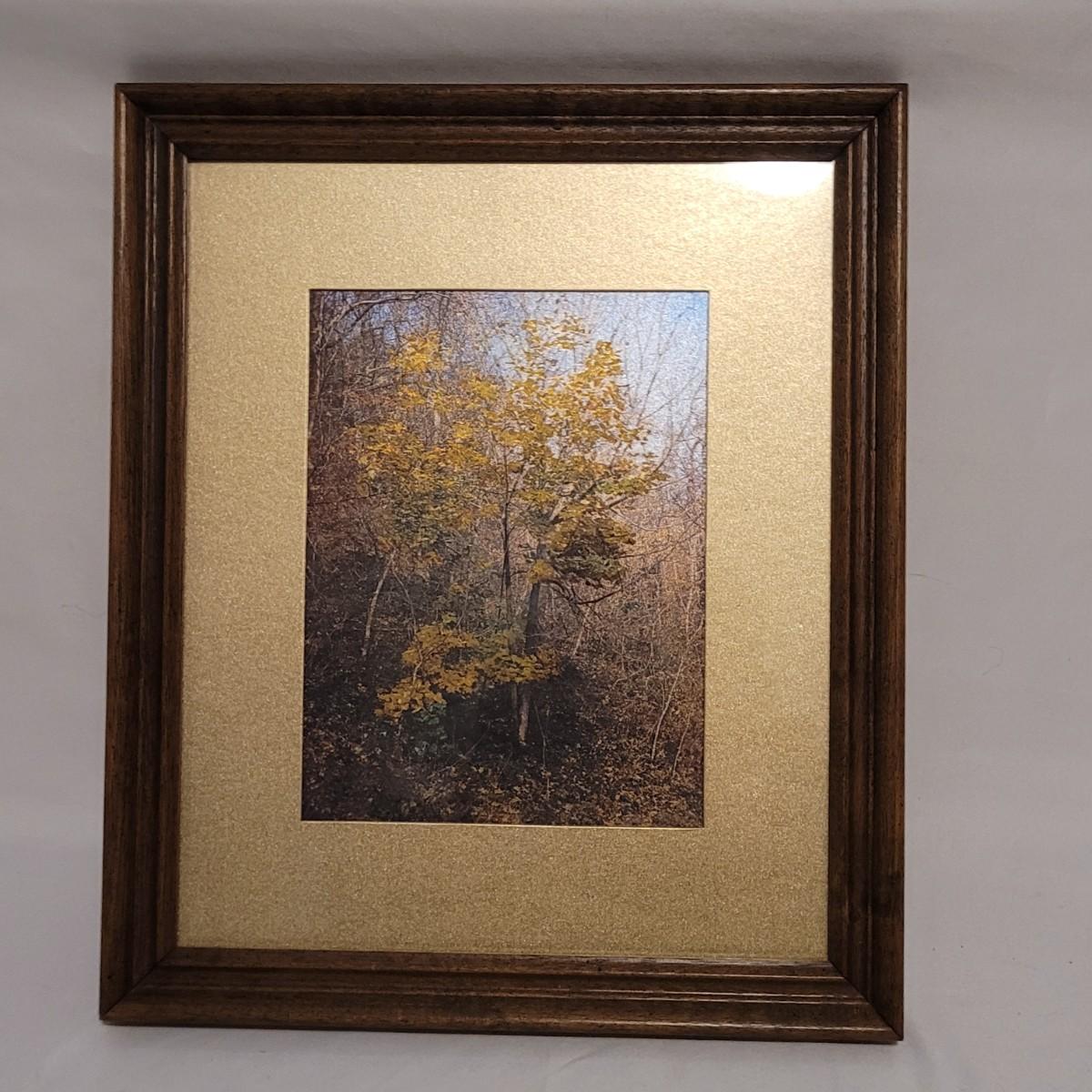 A wood framed matted art piece under glass. Depicts a lone tree in autumn. Paperwork states art changes color and appearance based on time of day "lighting". Measures 11.5" x 13.5" x 1"H. From the "Silvery Fantasy" line of artwork. Includes some mounting hardware.