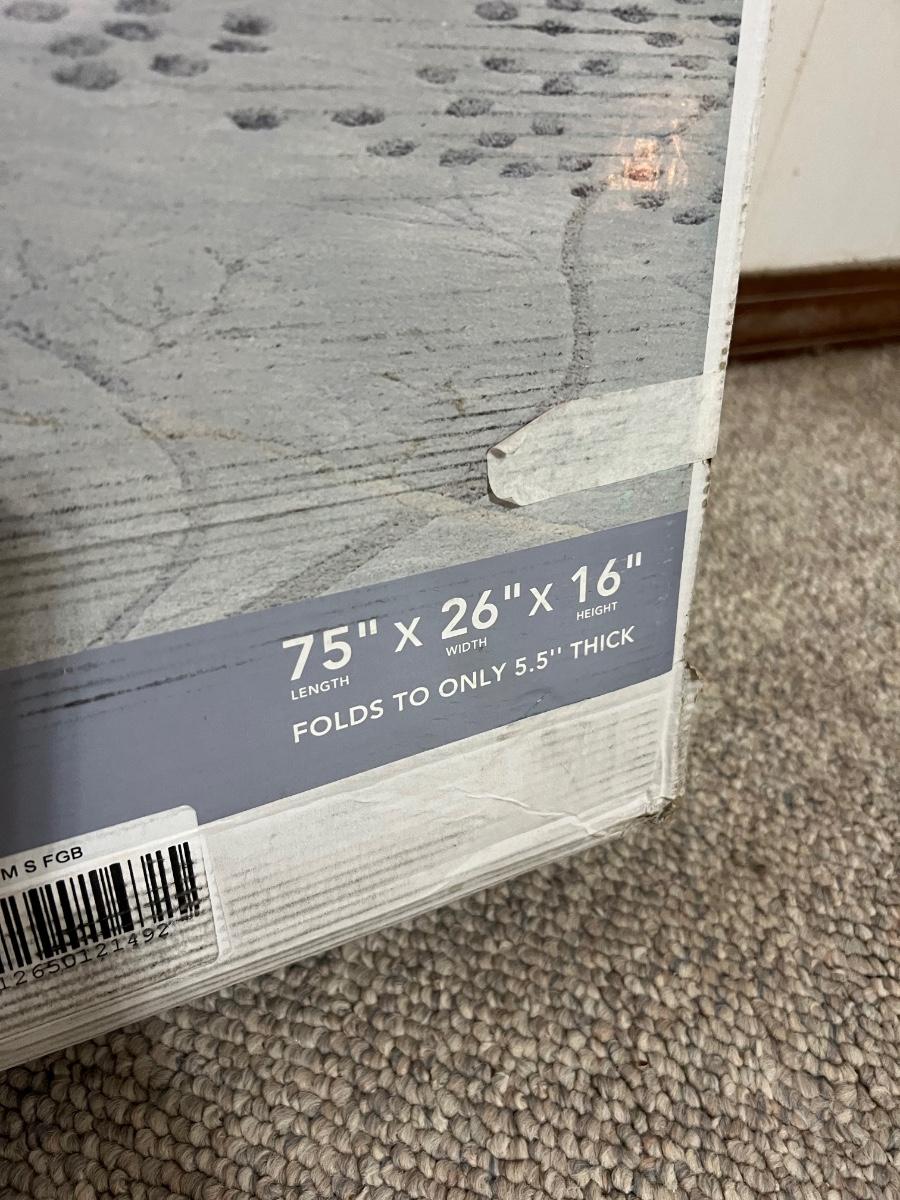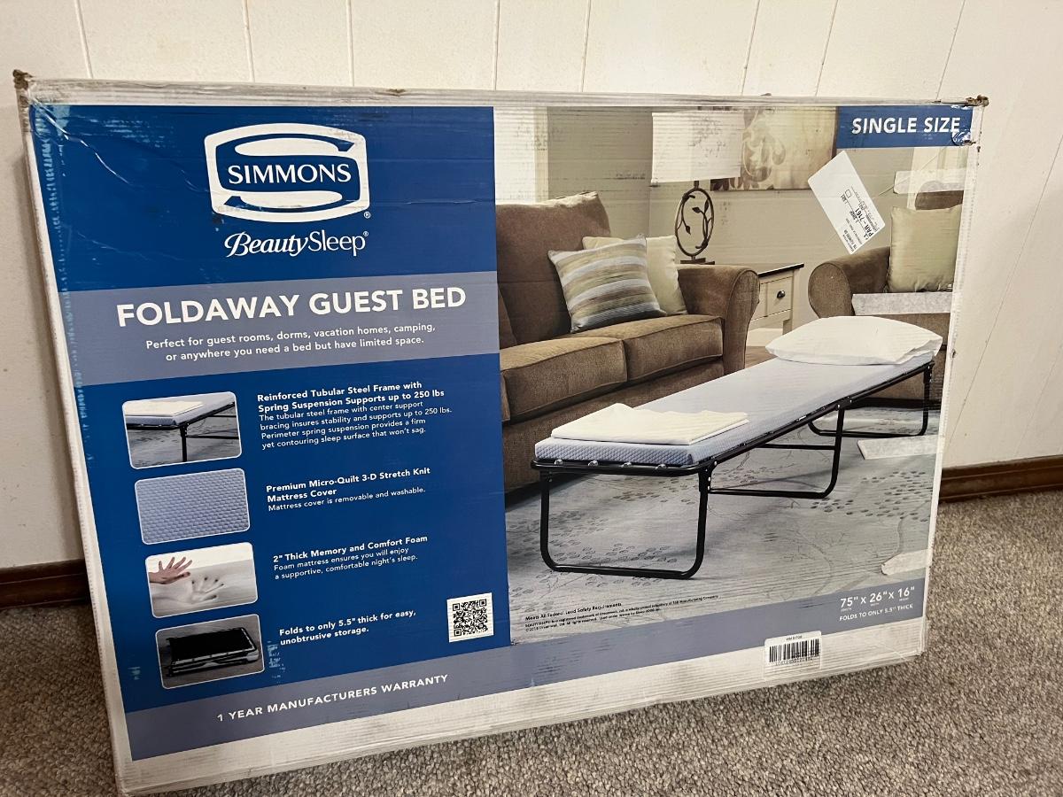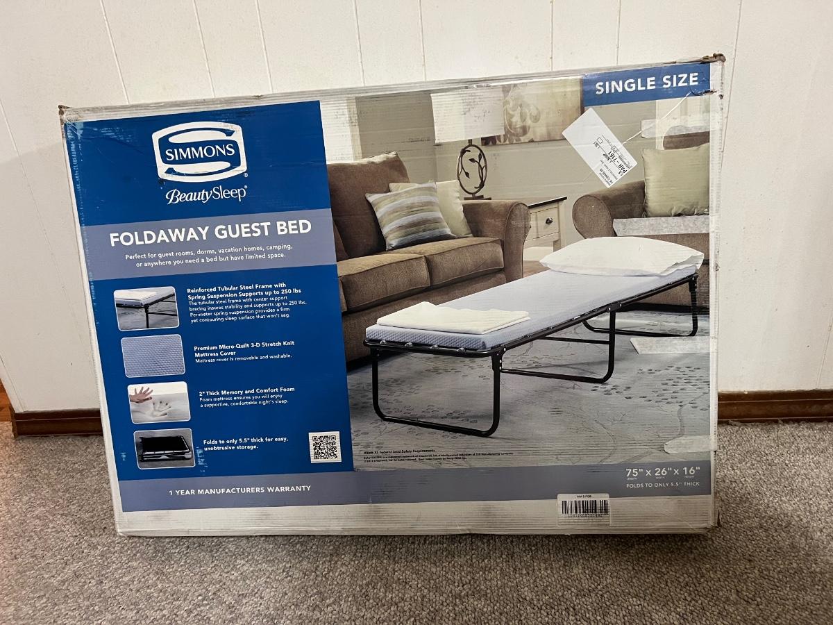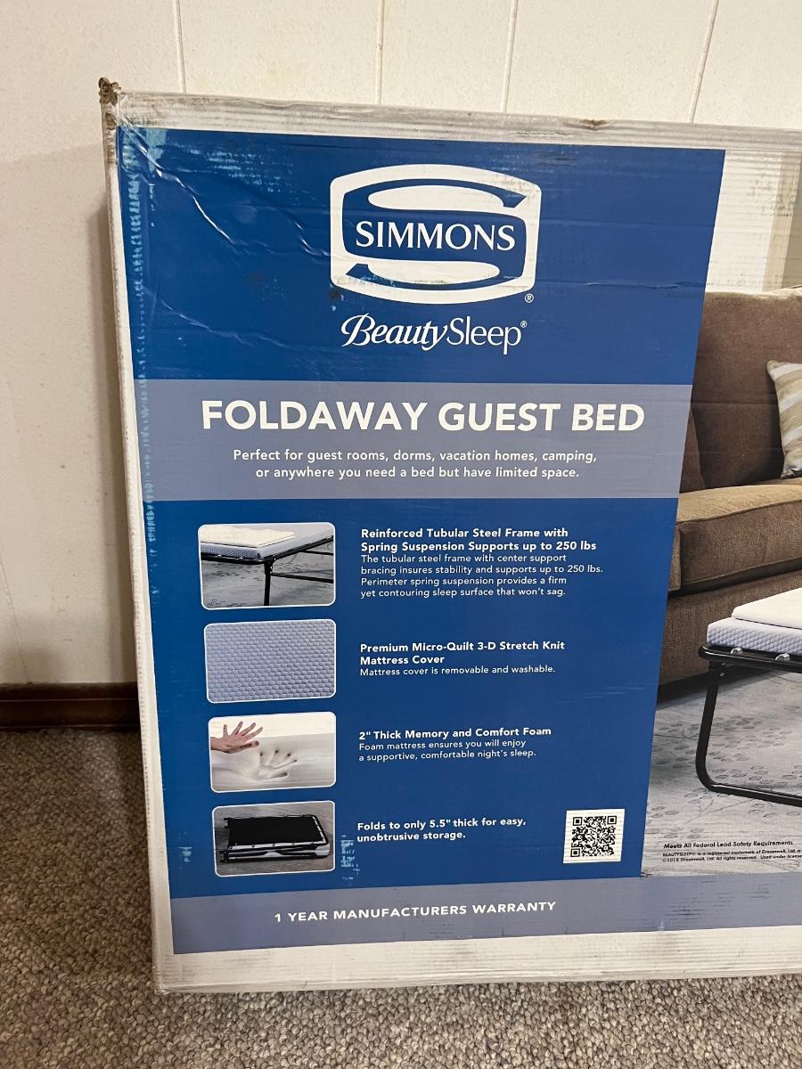 SIMMONS BEAUTY SLEEP Fold Away Guest Bed Single size. Measures 75” x 26” X16 inches. Mattress is still wrapped in plastic.