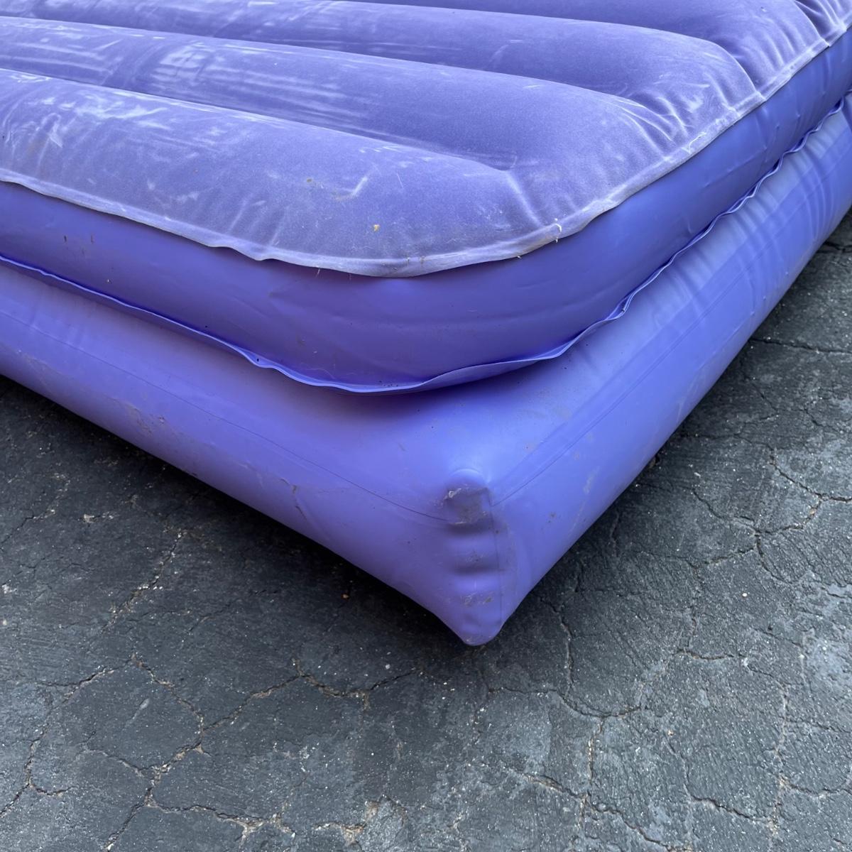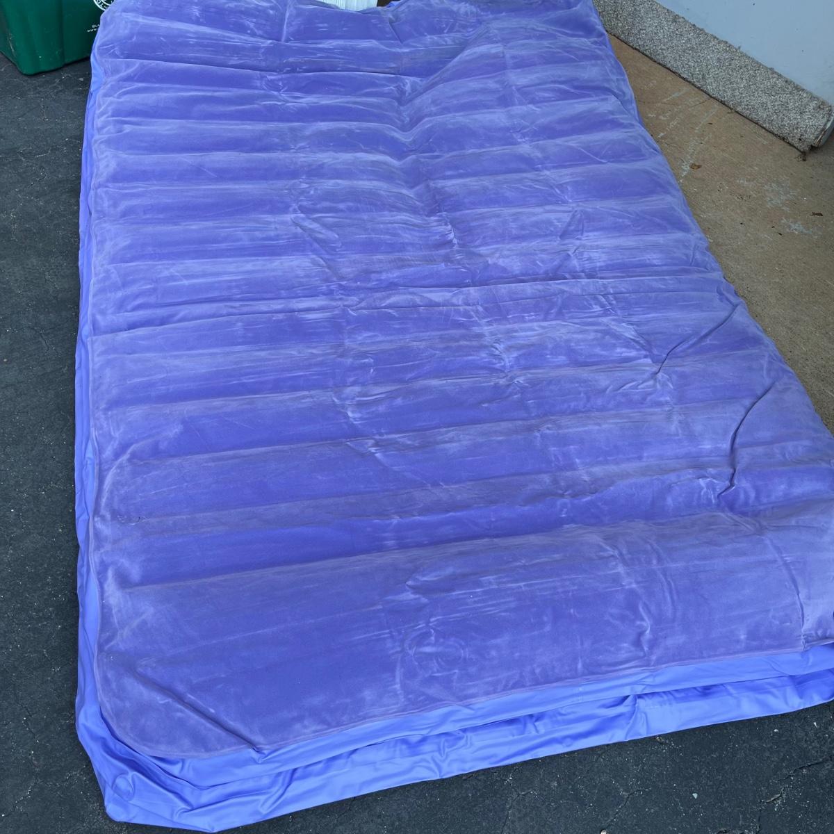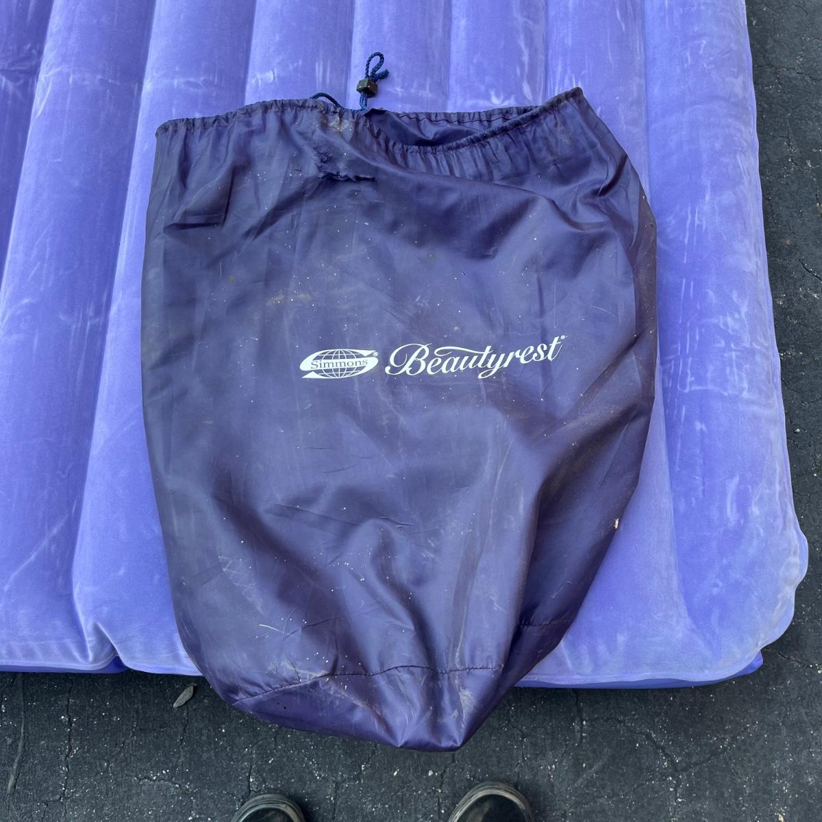Lot includes a Simmons full size air mattress with pump and storage bag. Mattress was patched at some time but held air for the fifteen minutes we had it inflated.