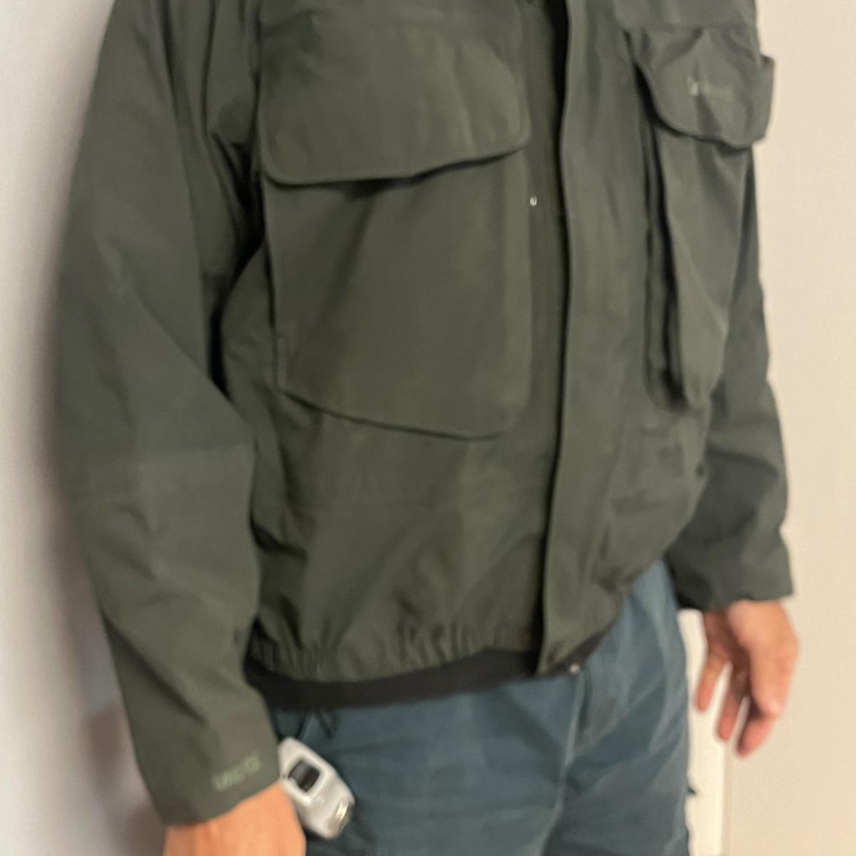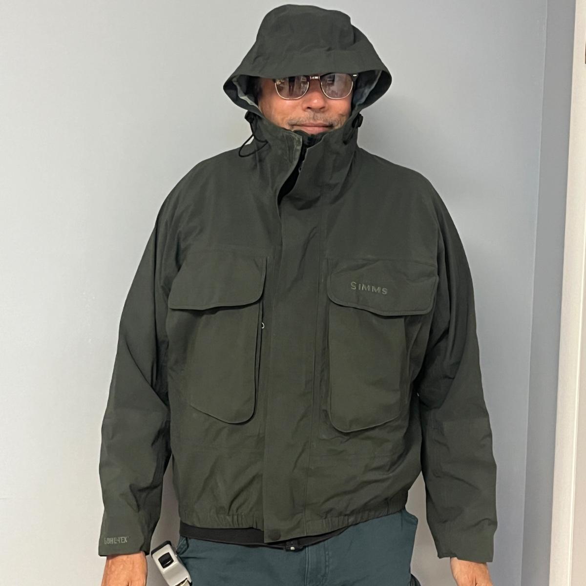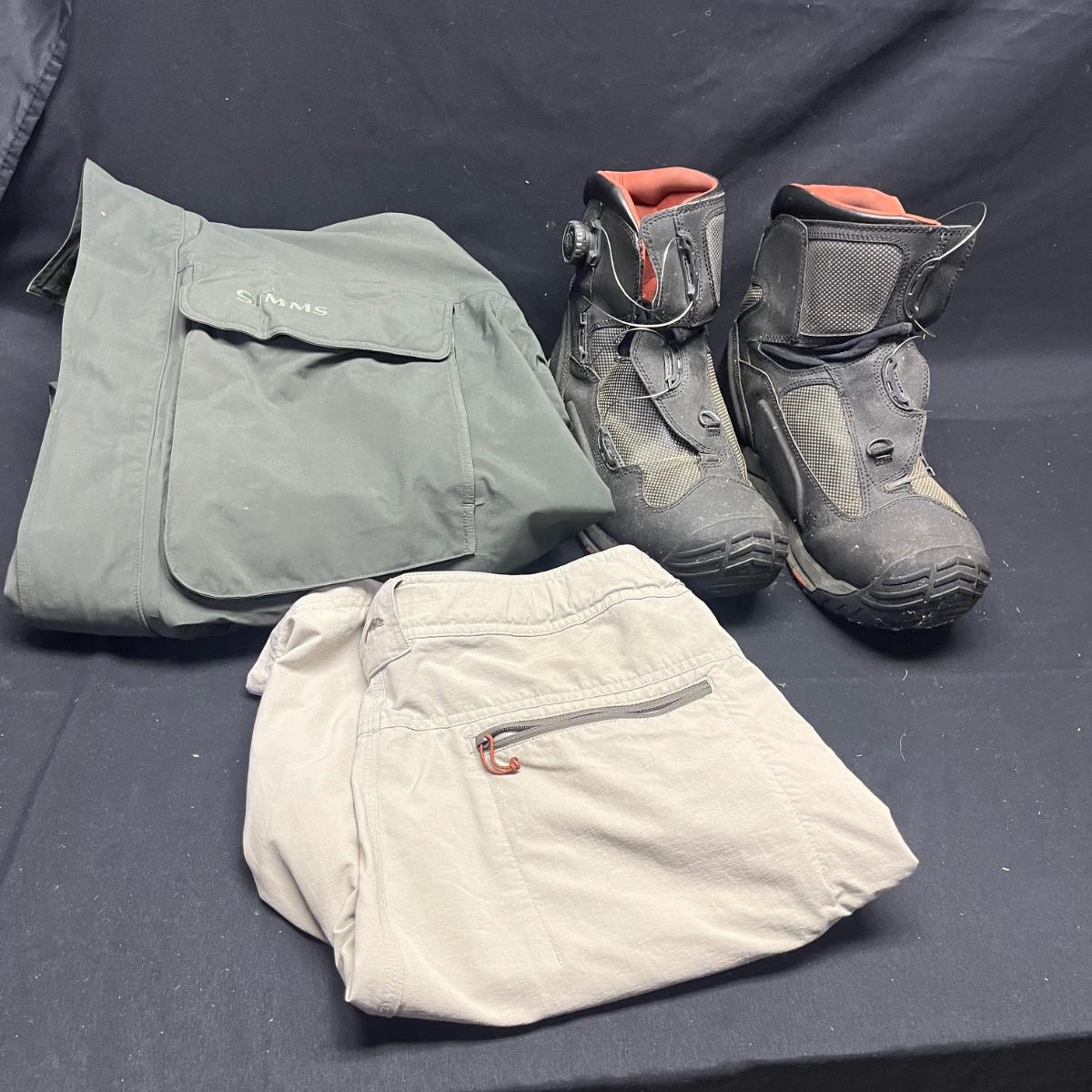 Lot includes a Simms Gore-Tex jacket in size large, Simms Boa fly fishing boots in size 14 and a pair of Simms shorts size large.