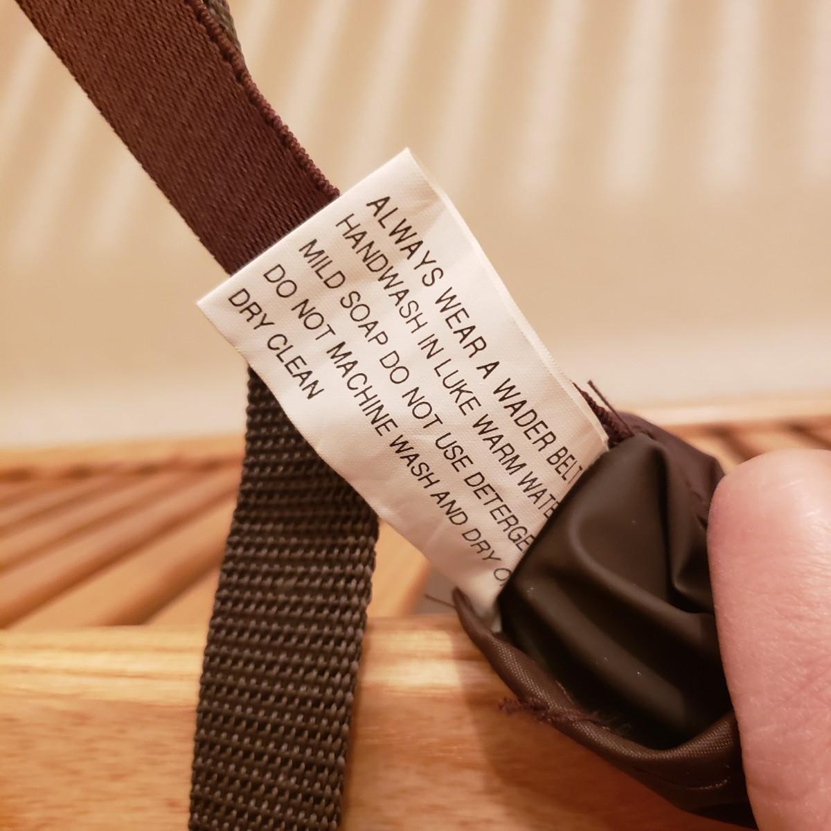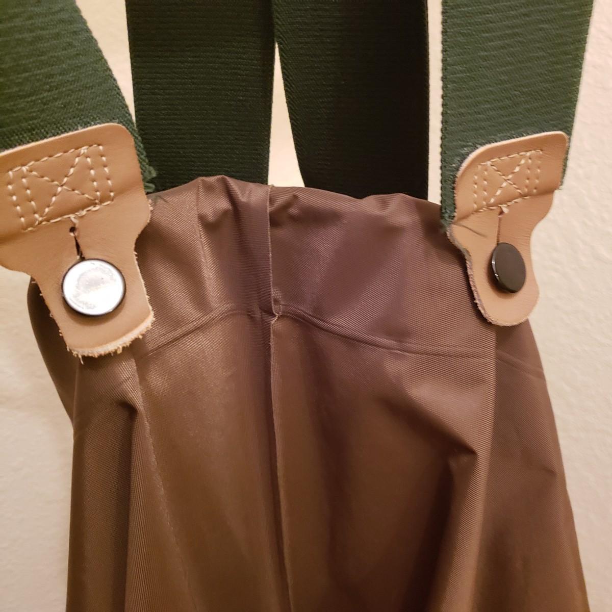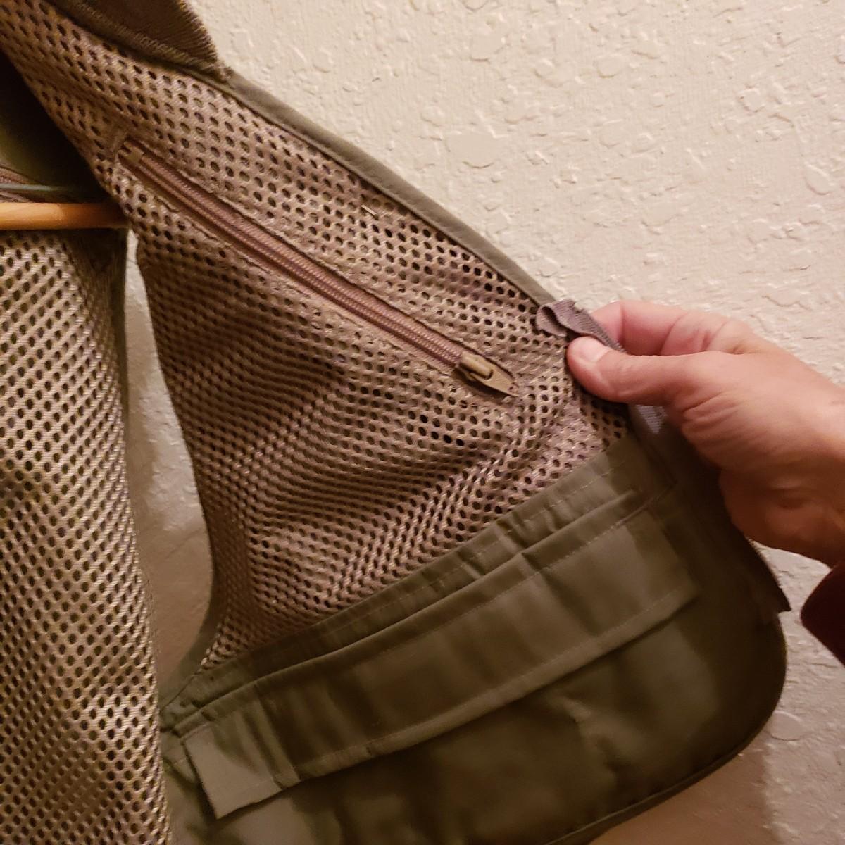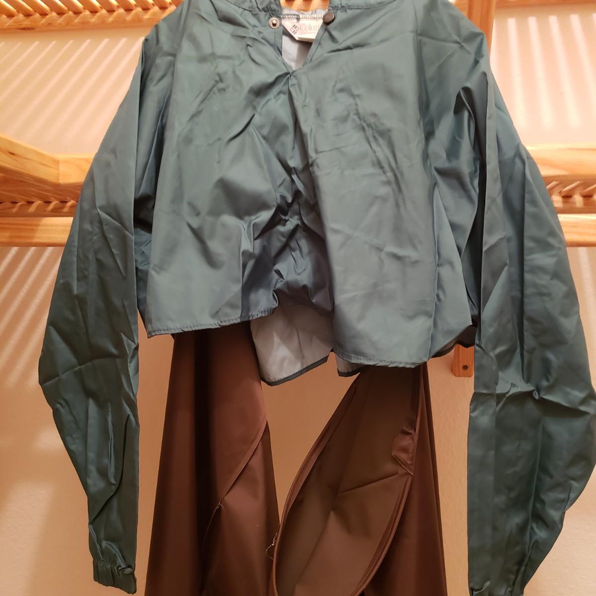 A Simms XL fishing vest with many pockets and accessories, see pictures. There is a Columbia men's medium fly vest also with many pockets. The Red Ball waders with suspenders measure 24"x 54"H. The waist appears to be adjustable. It comes with an extra green strap. The green Columbia size men's medium shell is made out of nylon. The single legged waders do not have a brand name tag, but state a size Large.