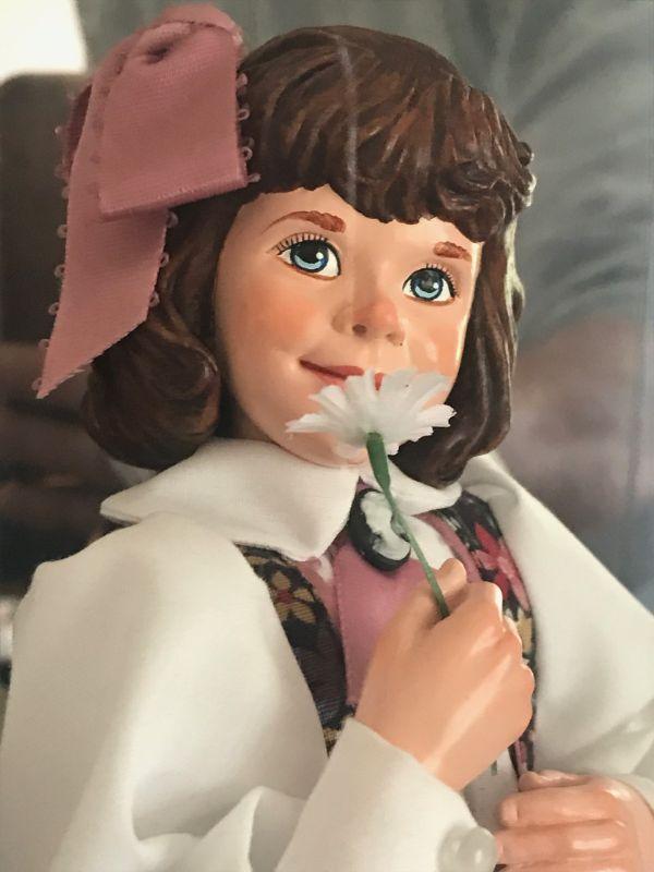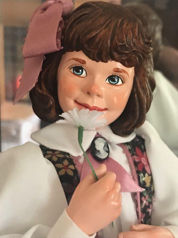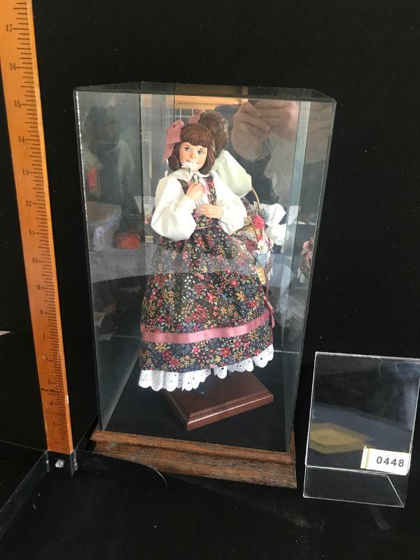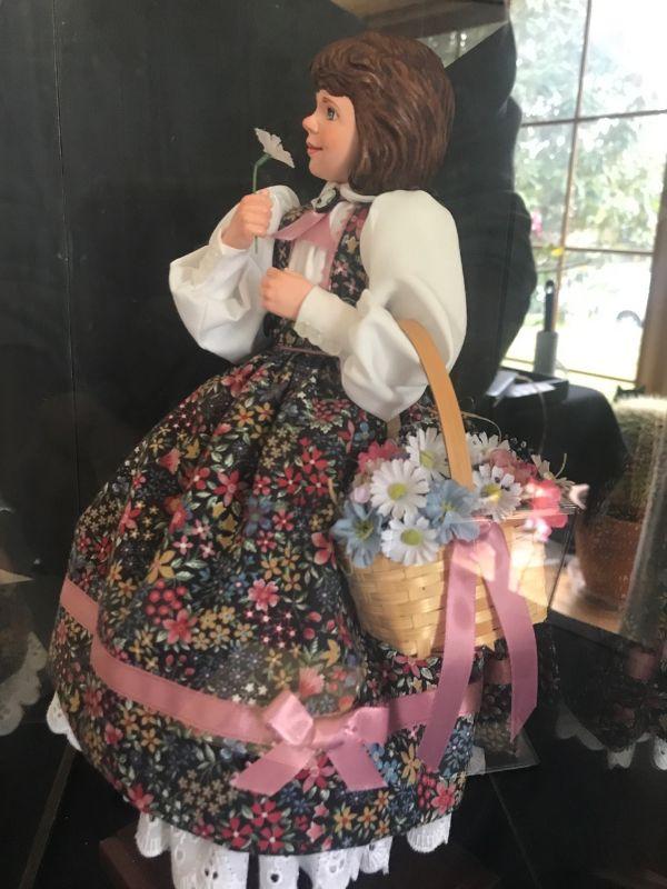 Simpich Doll - Flower Girl - holding a flower to her nose and a basket of flowers in the other. Wearing a cameo necklace. Attention to detail is amazing. She is loose on the wooden base but can be repositioned easily. Case is 3 sides glass, back side mirror.