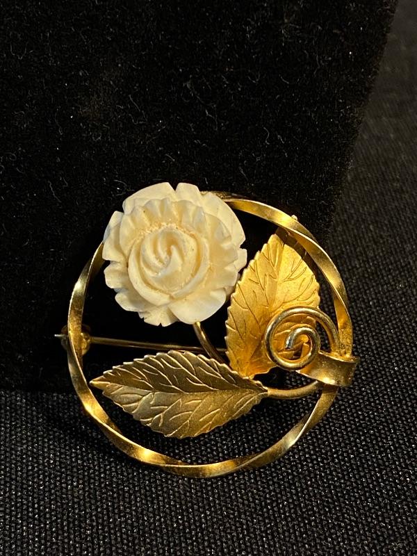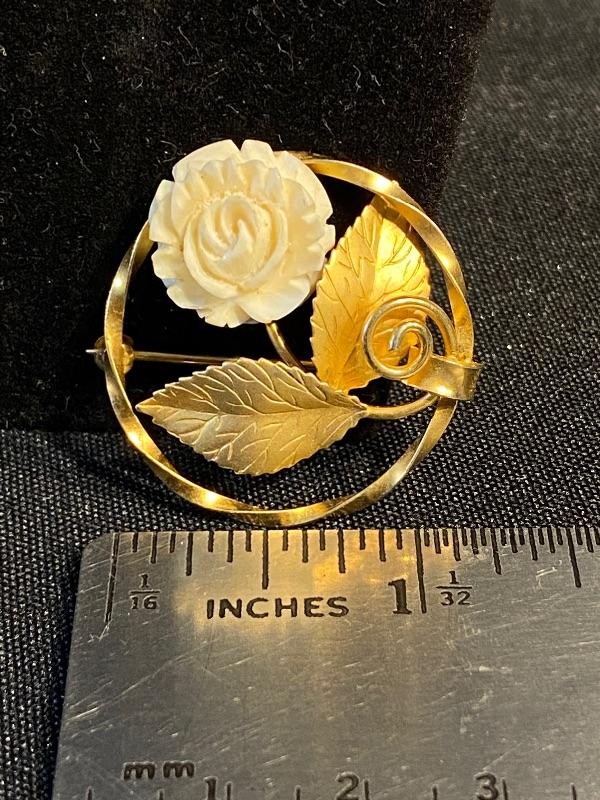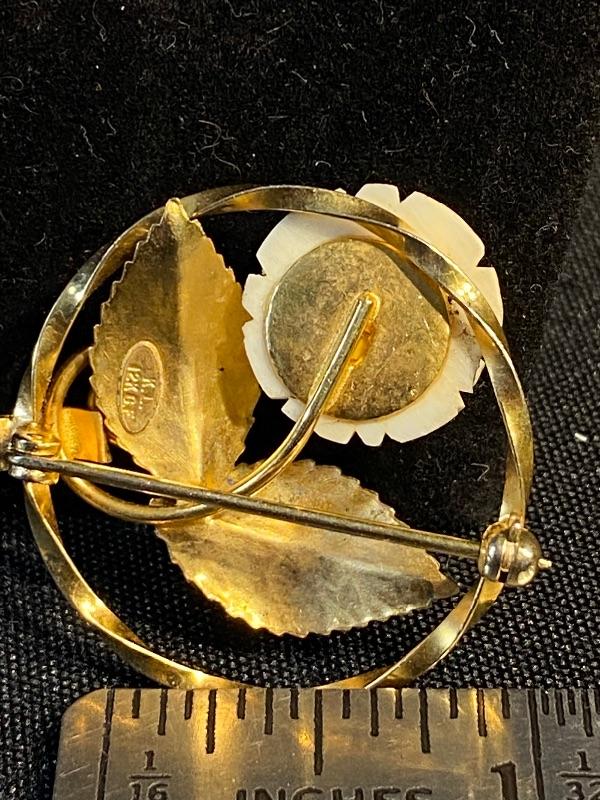 Vintage Flower Brooch. Simple but elegant design, about a 1.25" circle with flower in the center. The flower is a cream color, not sure of material. Stamped back, K.L. 12k G.F.