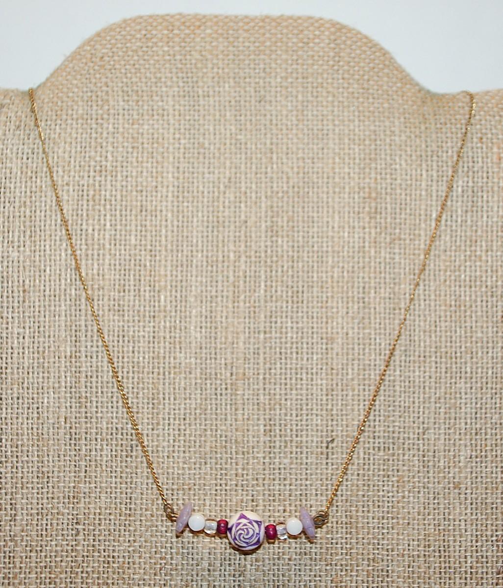 Delicate LAVENDER & WHITE Beaded PENDANT (1") on a Dark Gold Tone Necklace Chain 13" L