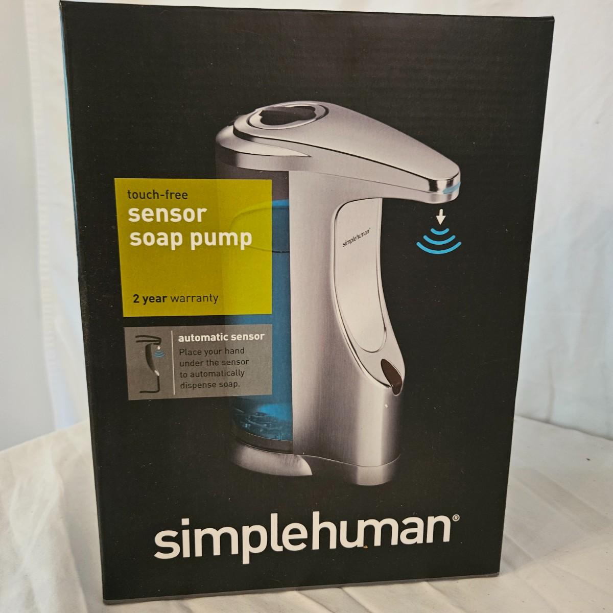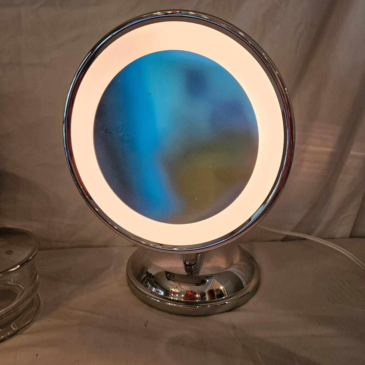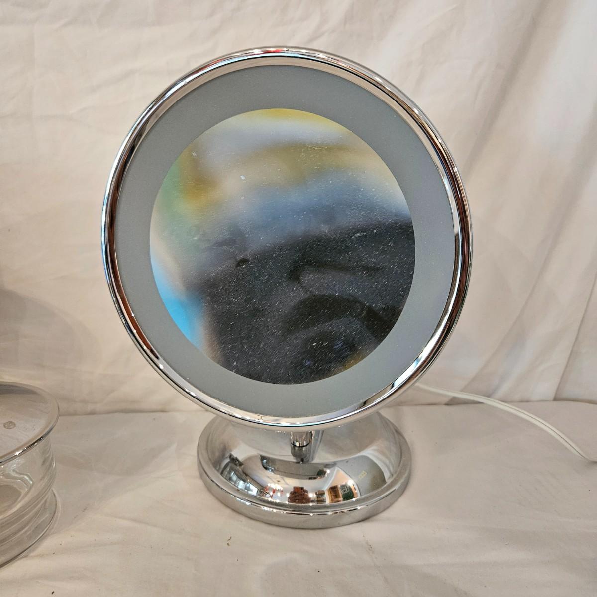 A SimpleHuman sensor soap dispenser that is NiB. Also included is a pivoting, lighted magnifying vanity mirror that has multiple light settings and light colors. The mirror head swivels and measures approximately 9" x 9" x 13". There are also four glass containers with metal lids and the largest container measures approximately 5"D x 7"H. Shipping available