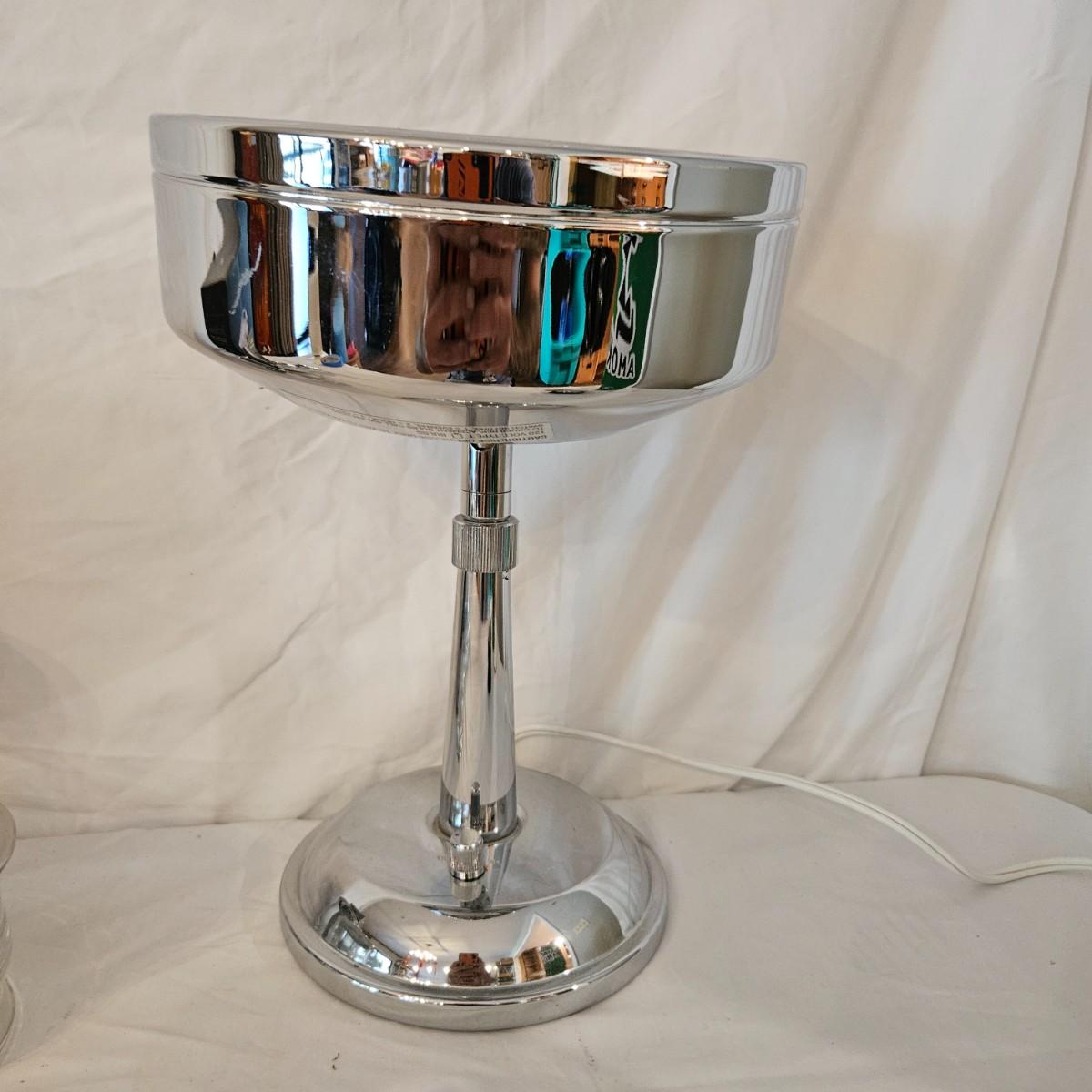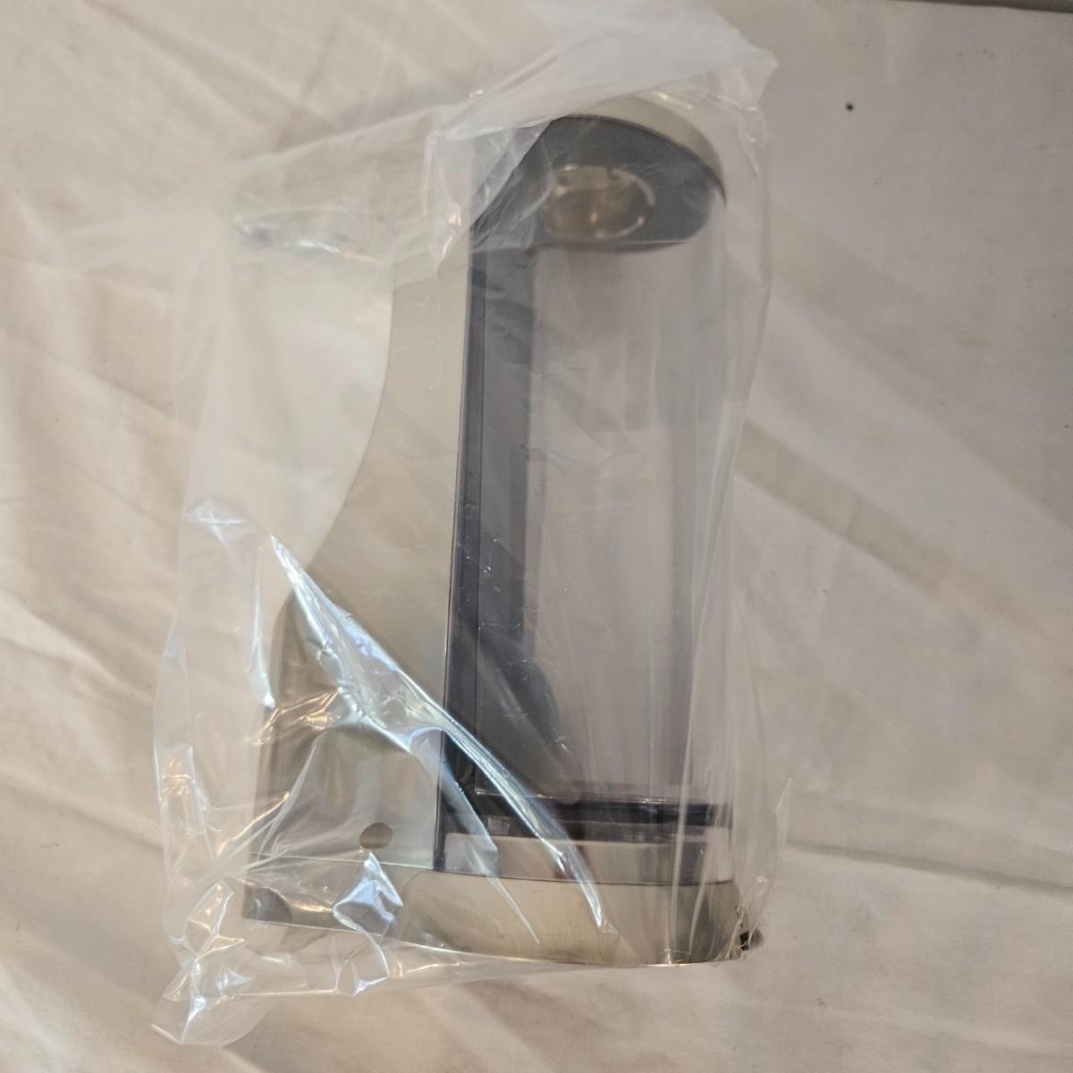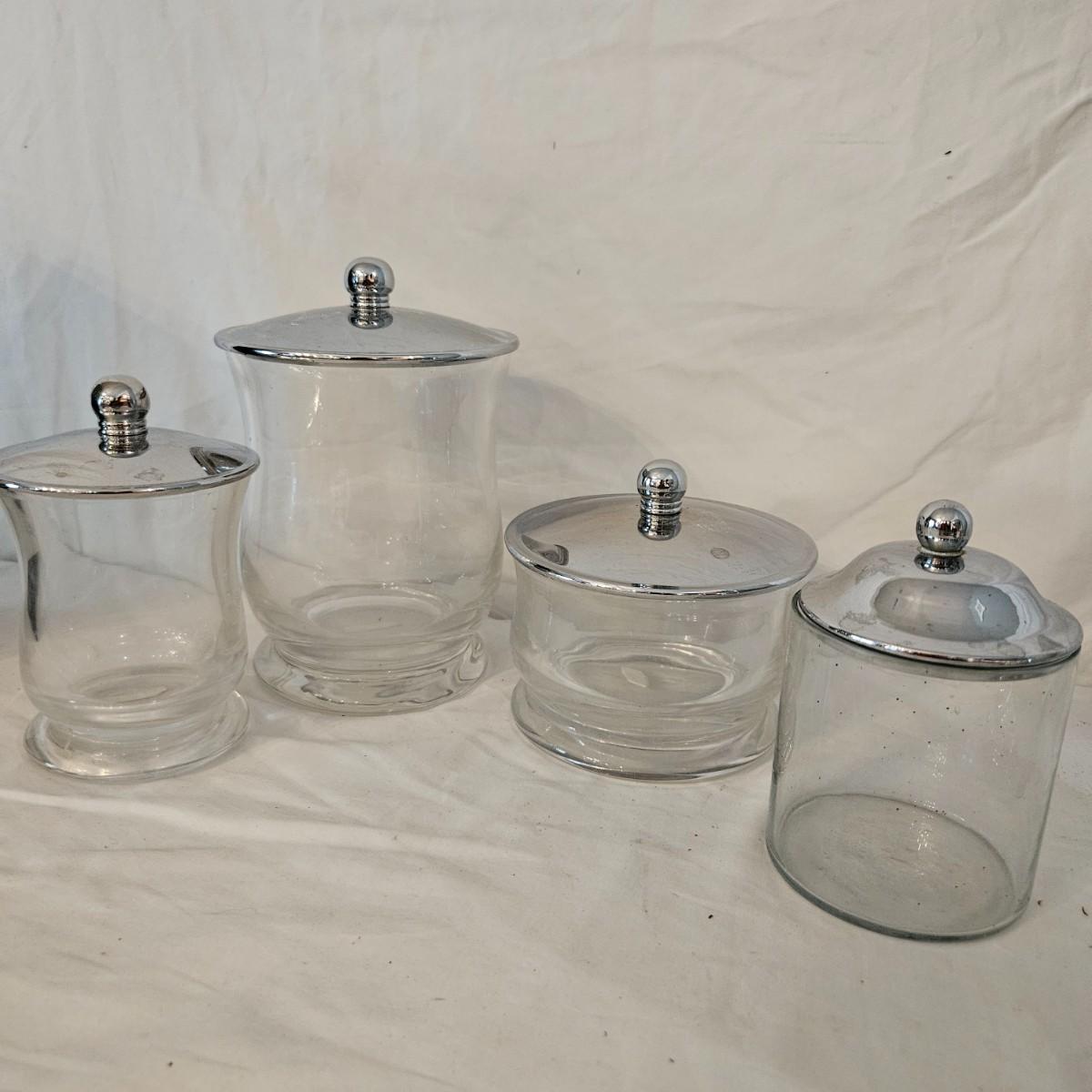 A SimpleHuman sensor soap dispenser that is NiB. Also included is a pivoting, lighted magnifying vanity mirror that has multiple light settings and light colors. The mirror head swivels and measures approximately 9" x 9" x 13". There are also four glass containers with metal lids and the largest container measures approximately 5"D x 7"H. Shipping available
