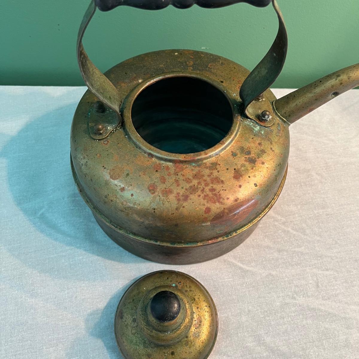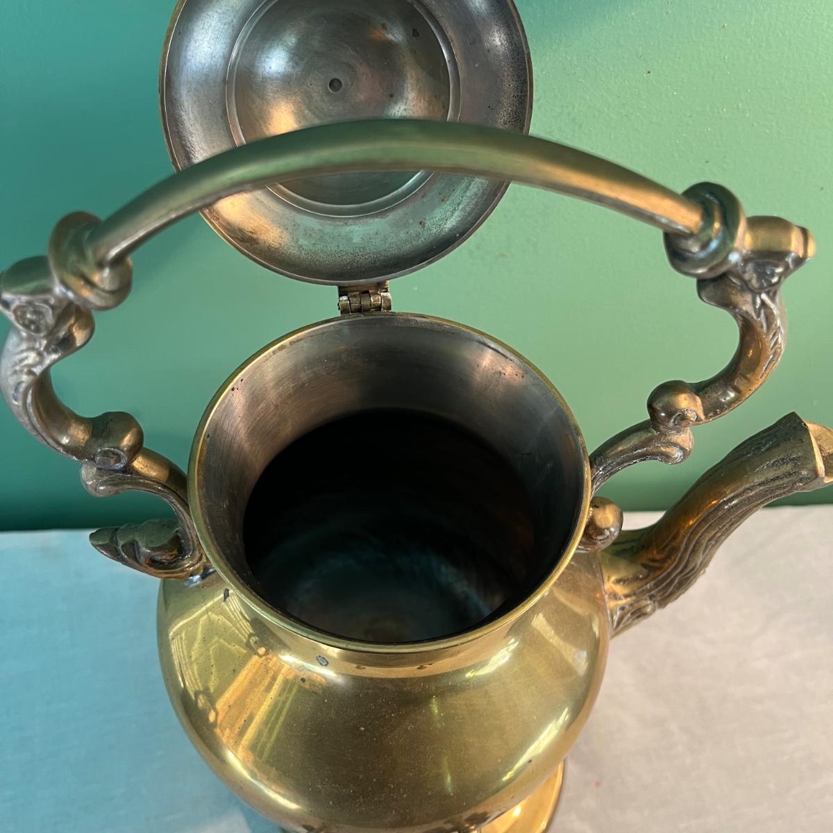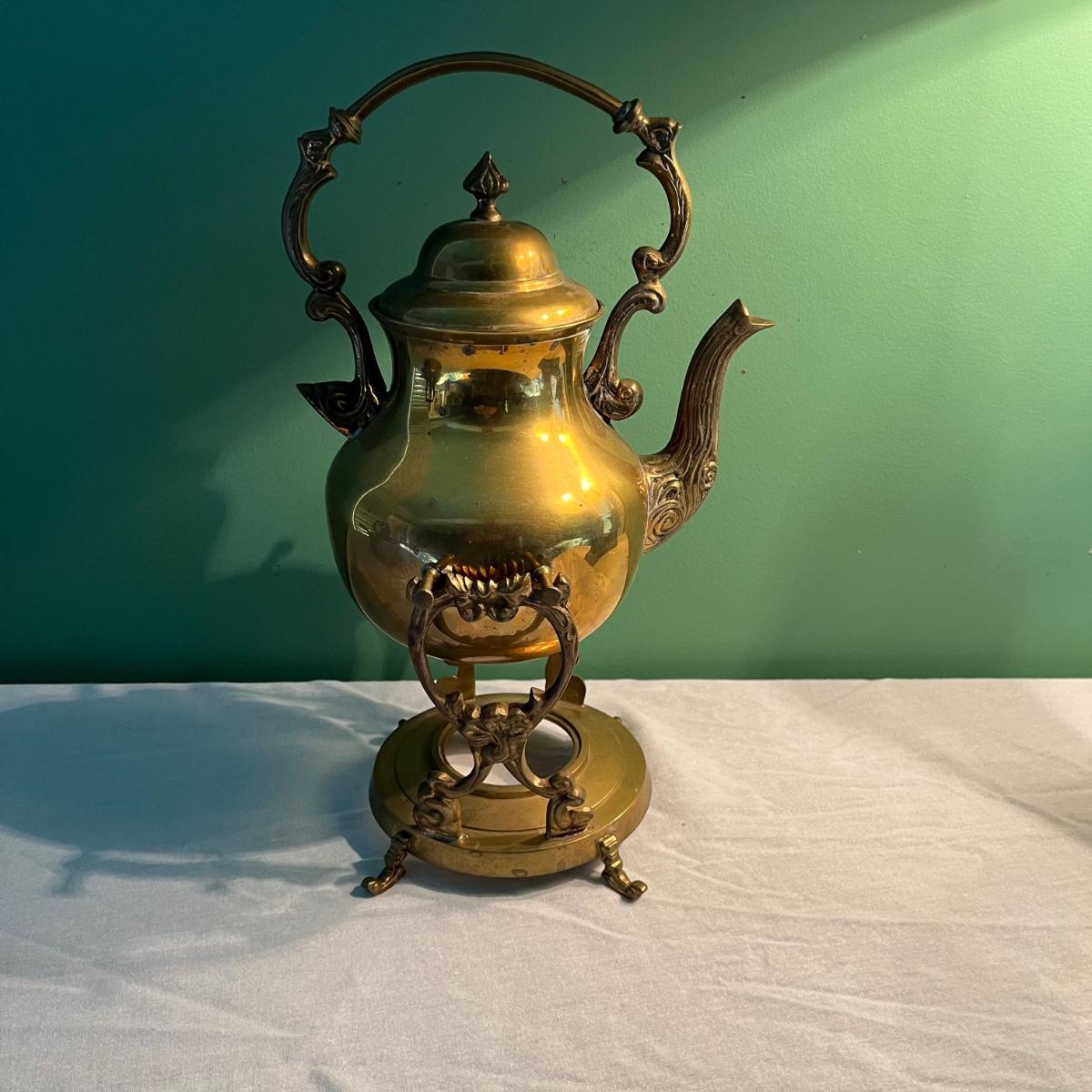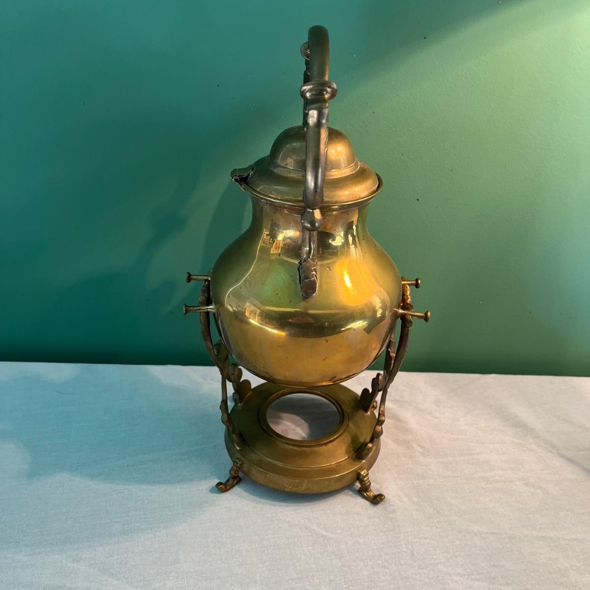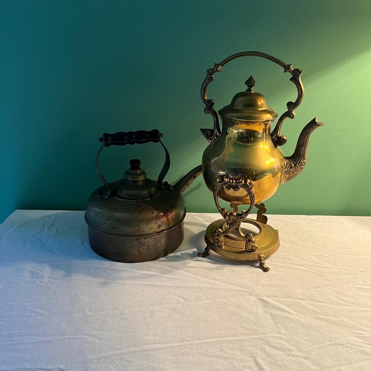 Lot includes a Simplex copper teapot and a brass teapot with stand. Teapot with stand measures 8” x 8” x 15”.