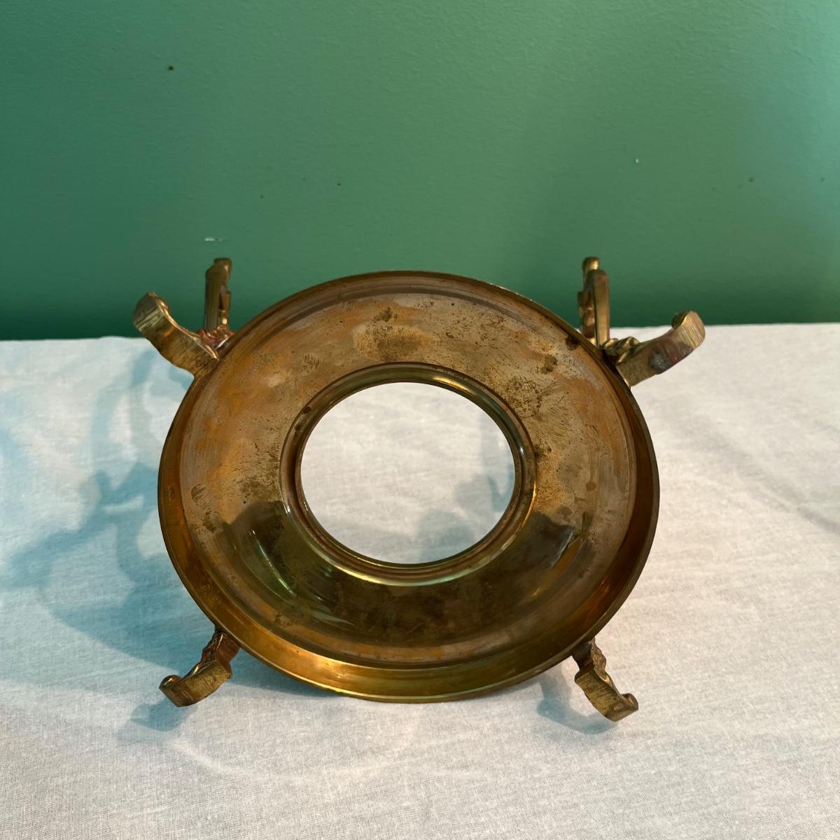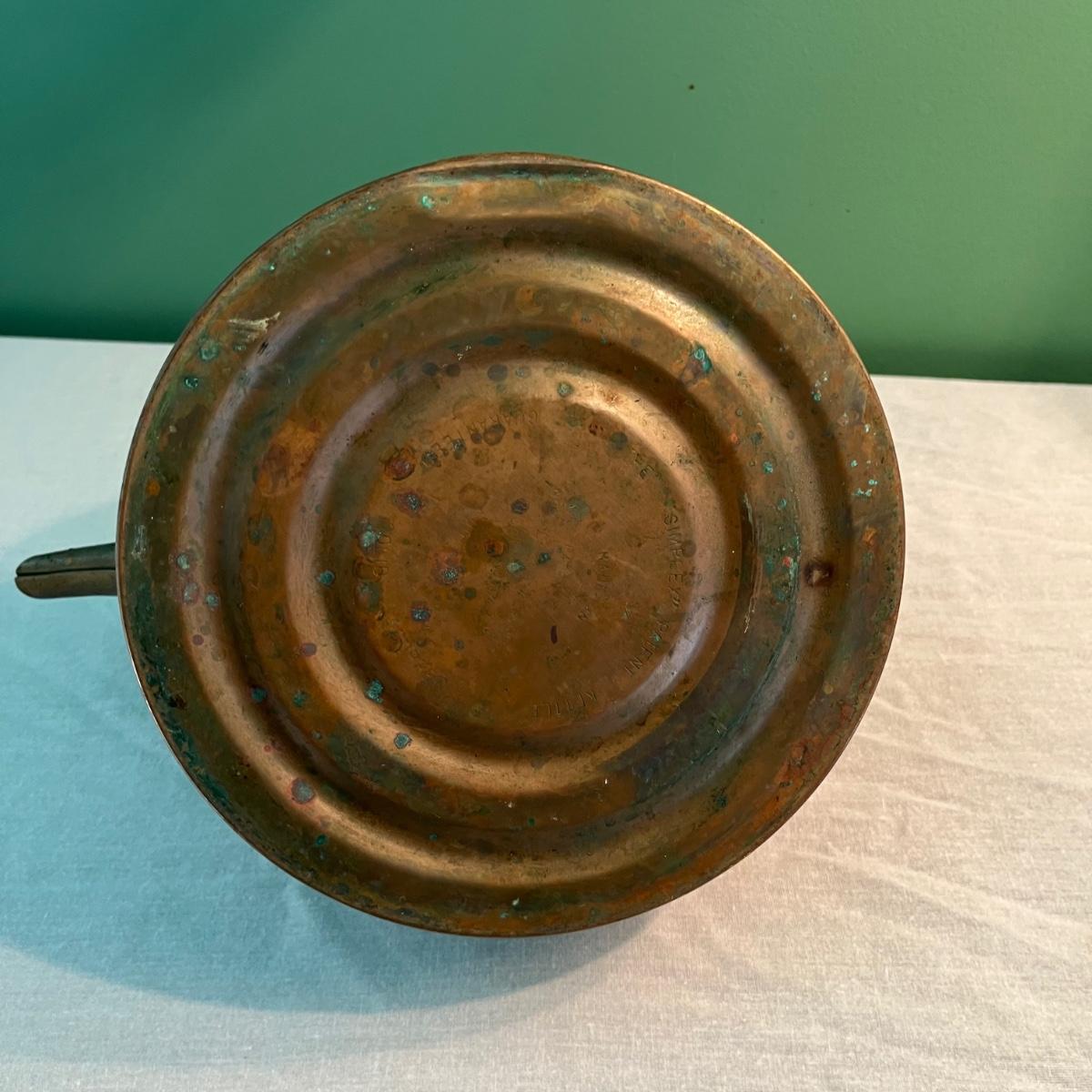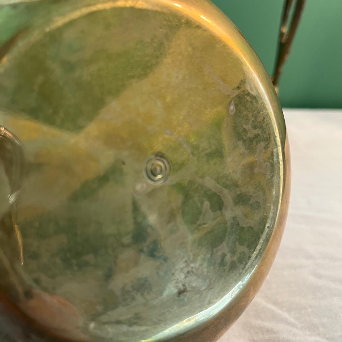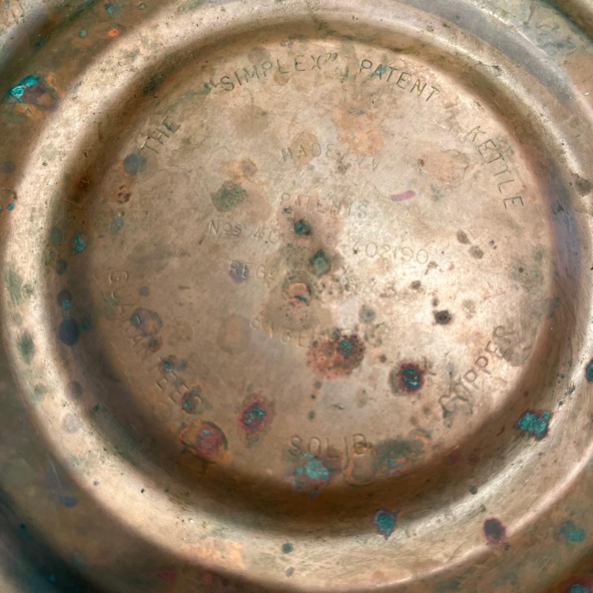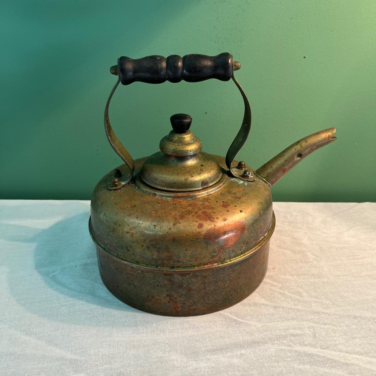 Lot includes a Simplex copper teapot and a brass teapot with stand. Teapot with stand measures 8” x 8” x 15”.
