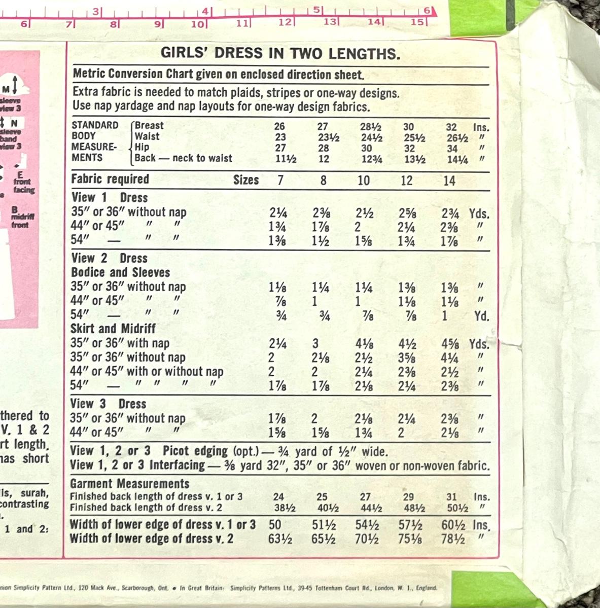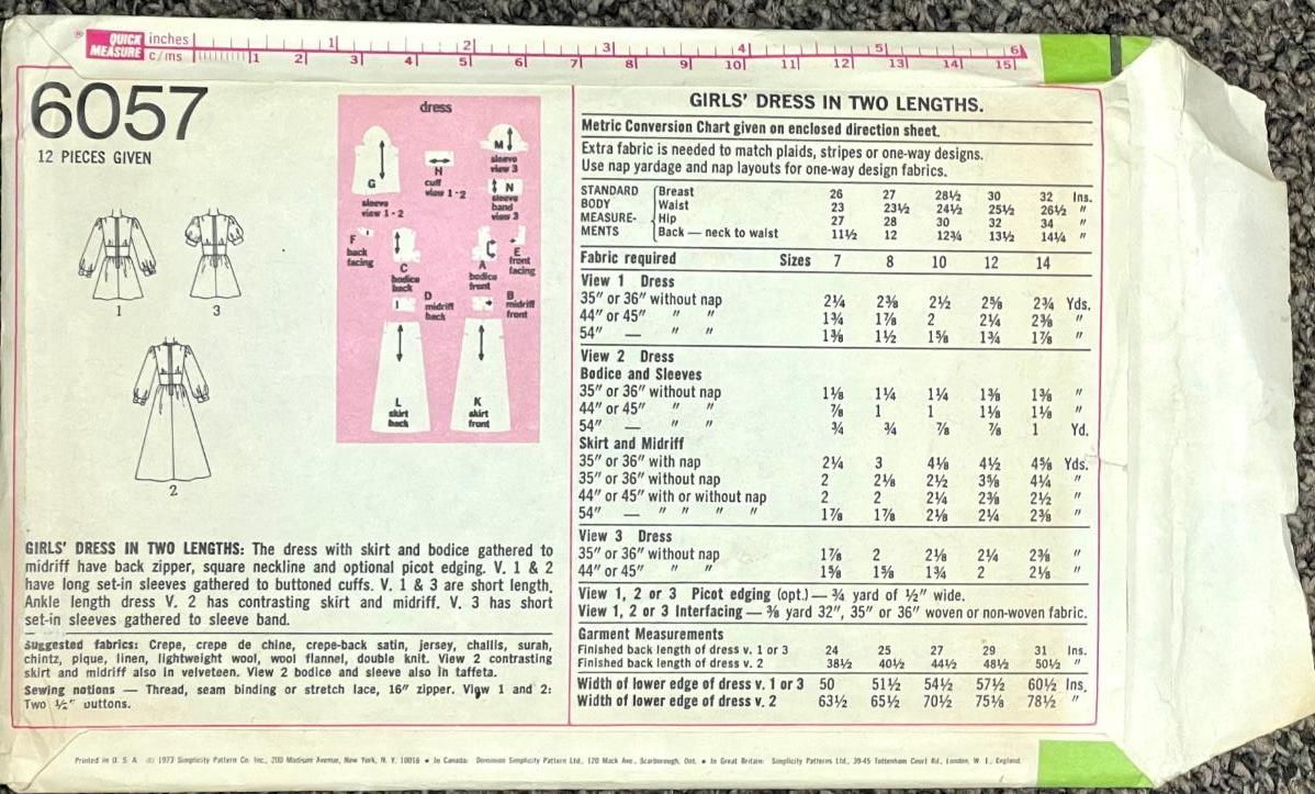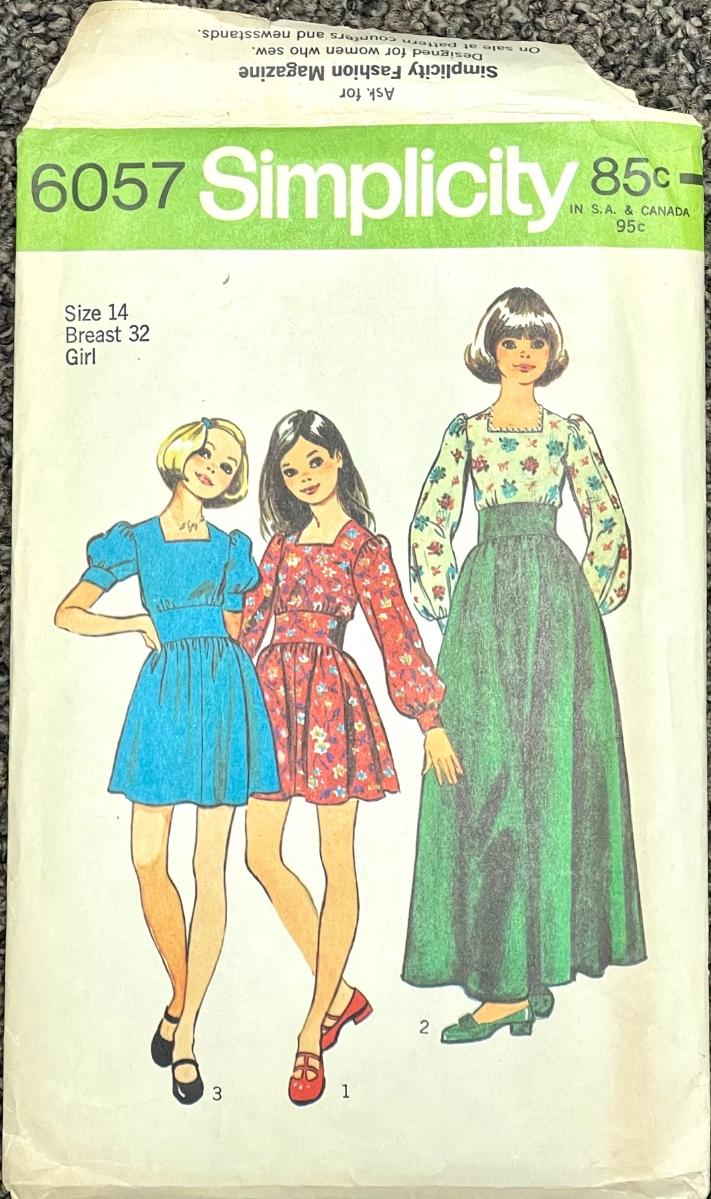 Simplicity Fashion Magazine Pattern No. 6057 Girls’ Dress in Two Lengths size 14 breast 32 girl 1973. All pieces verified.