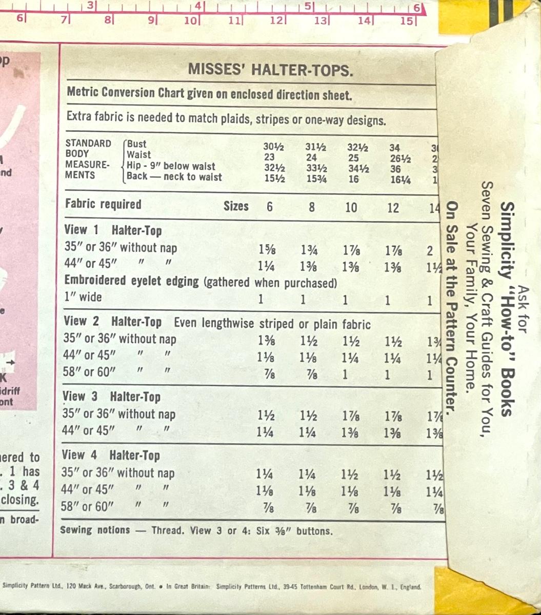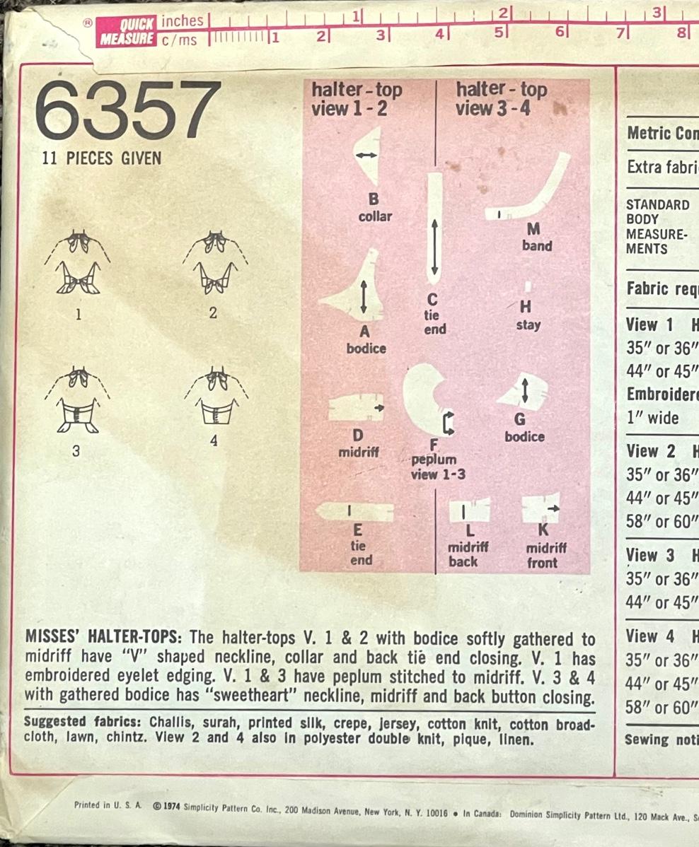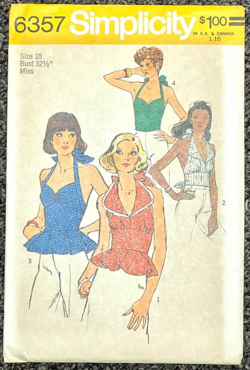 Simplicity Fashion Magazine Pattern No. 6357 Misses’ Halter Tops size 10 bust 32 1/2 miss 1974. All pieces verified.