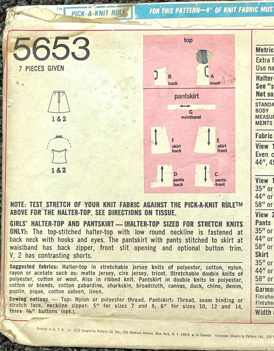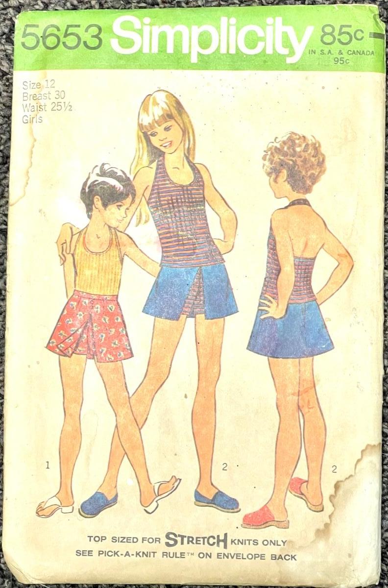 Simplicity No. 5653 girls size 12 breast 30 waist 25 1/2 top sized for stretch knits only 1973. All pieces verified.