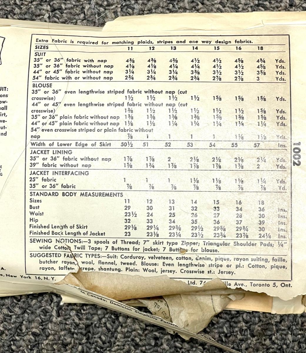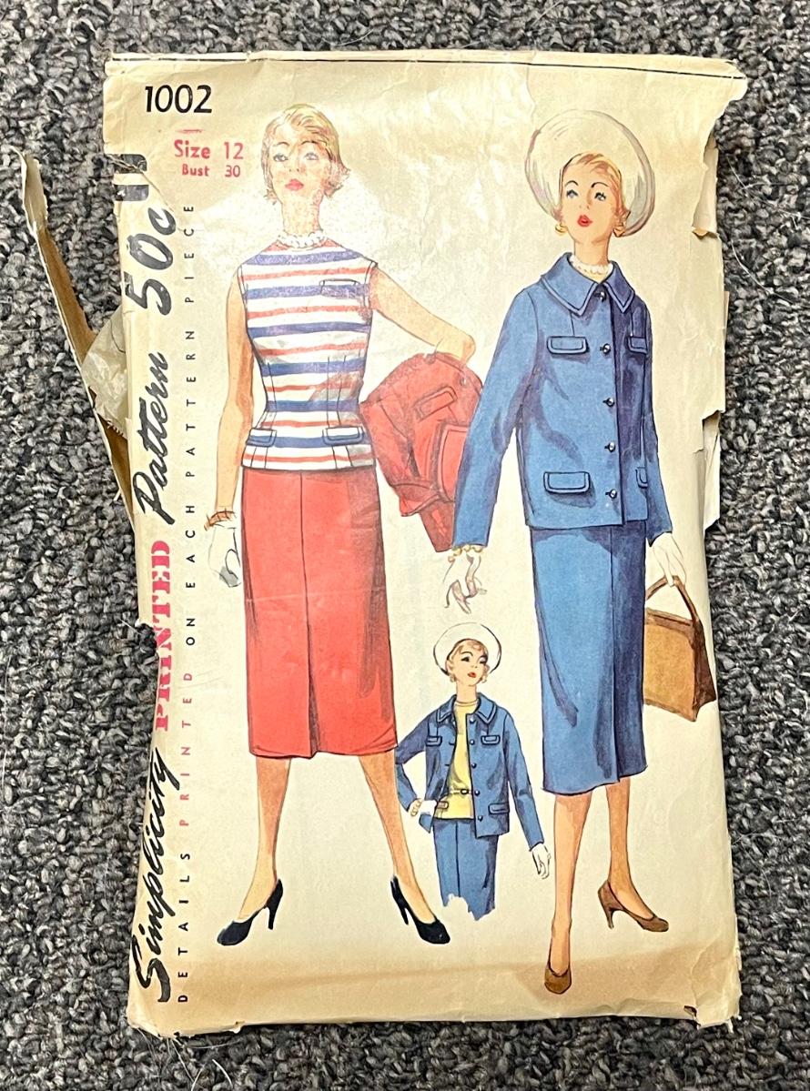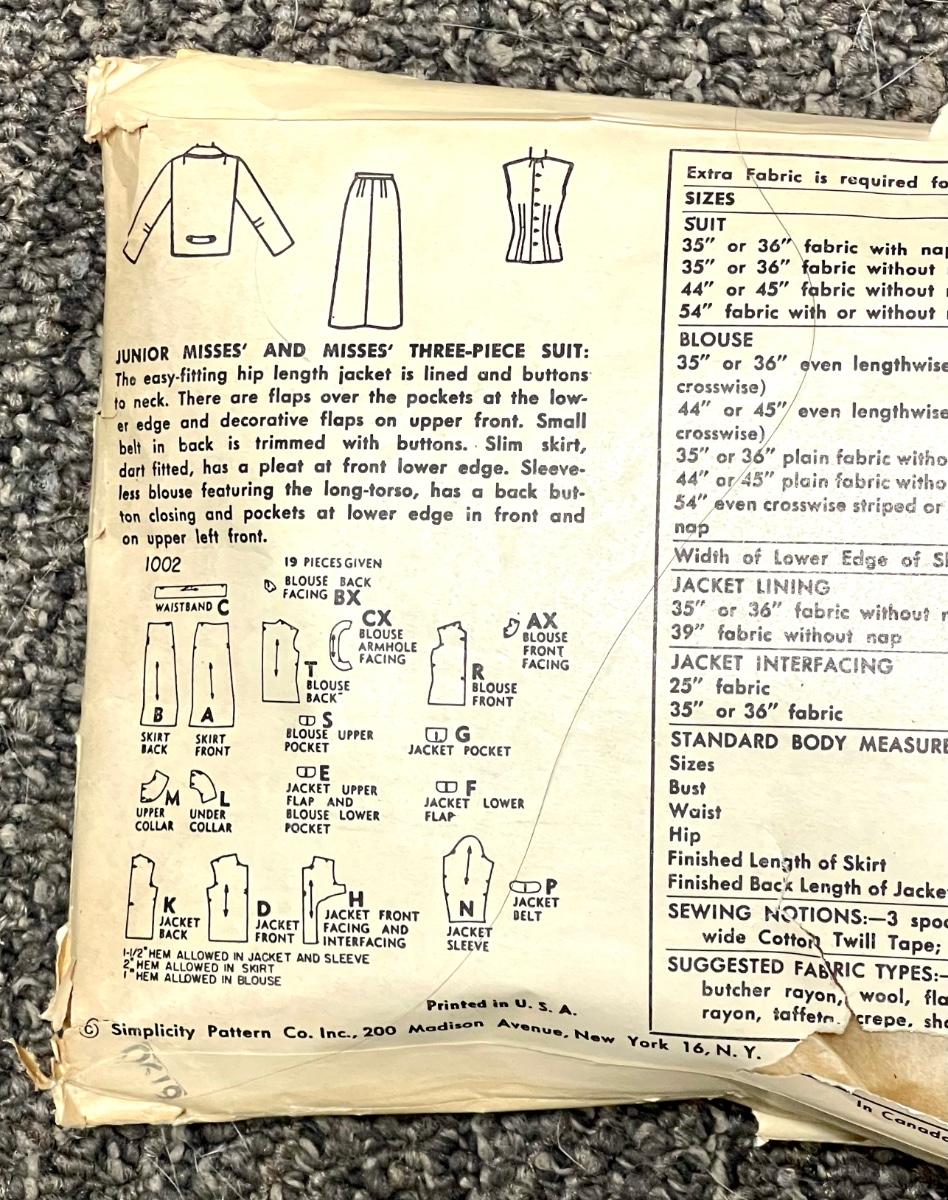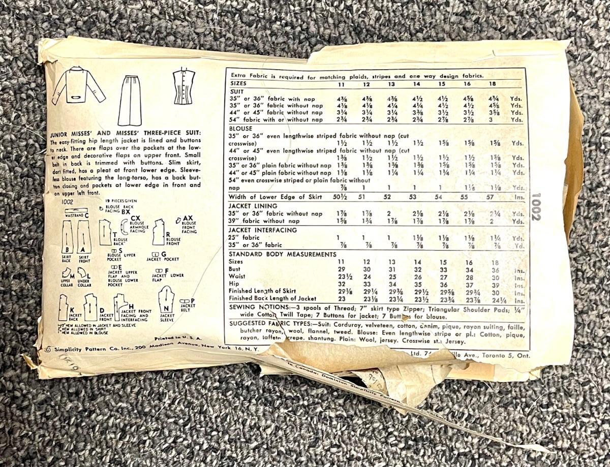 Simplicity Printed Pattern Junior Misses’ and Misses’ Three-Piece Suit No. 1002 size 12 bust 30
