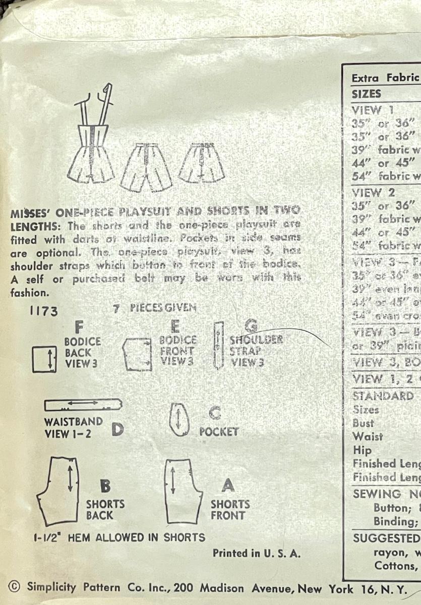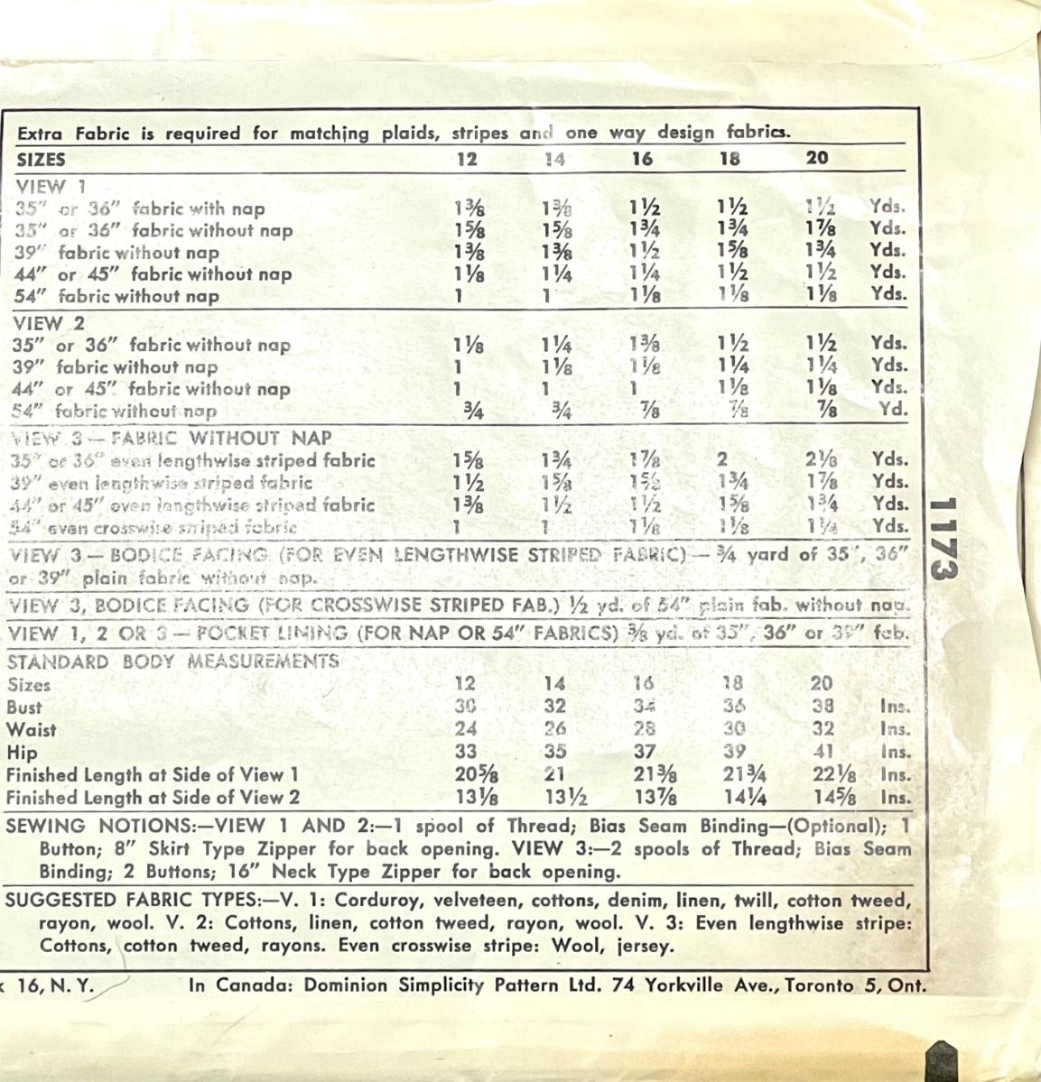 Simplicity Printed Pattern No. 1173 size 12 bust 30