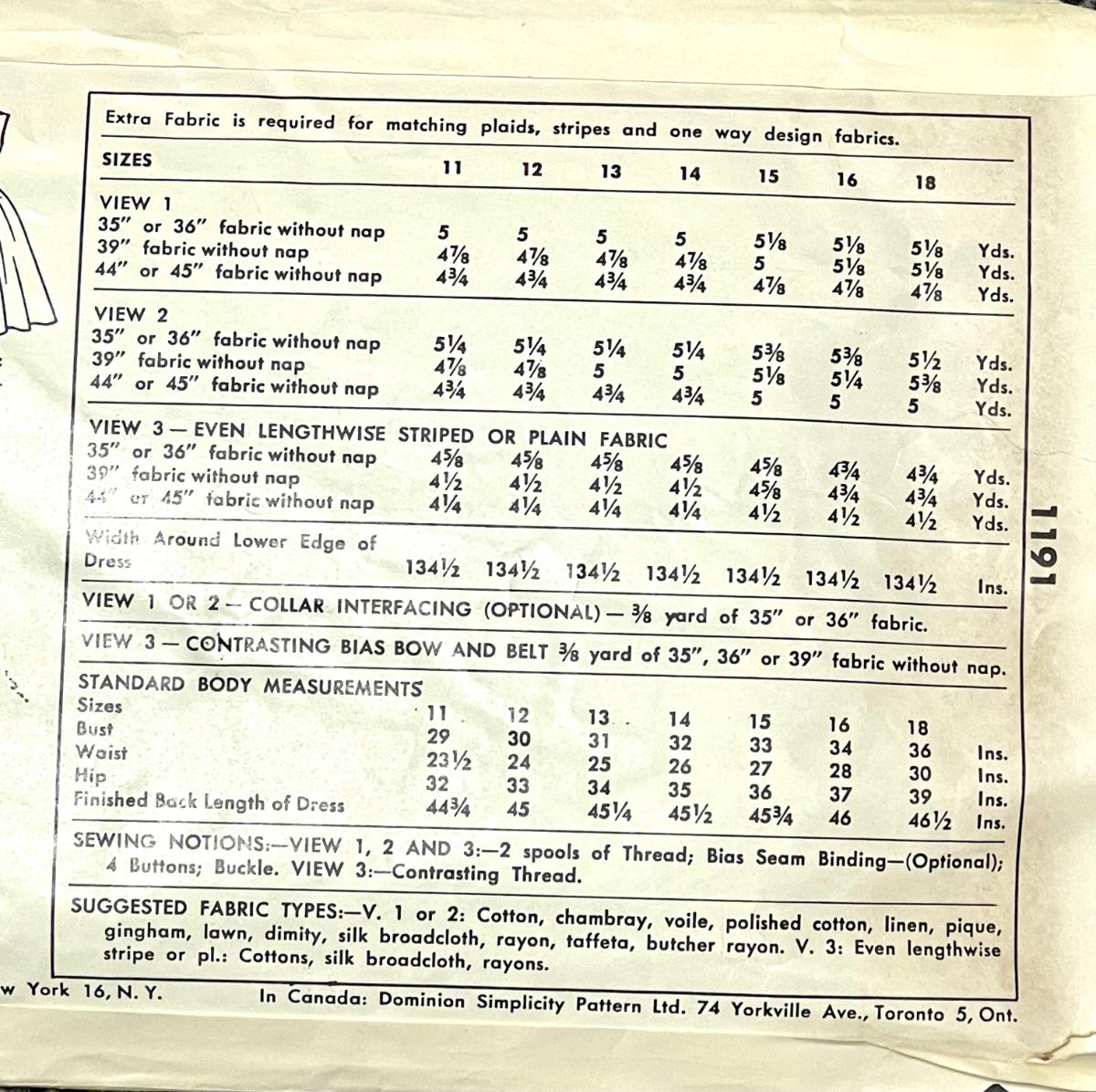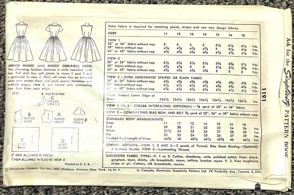 Simplicity Printed Pattern No. 1191 size 12 bust 30