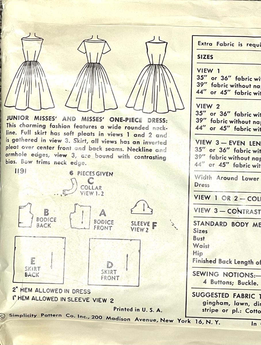 Simplicity Printed Pattern No. 1191 size 12 bust 30. All pieces verified.