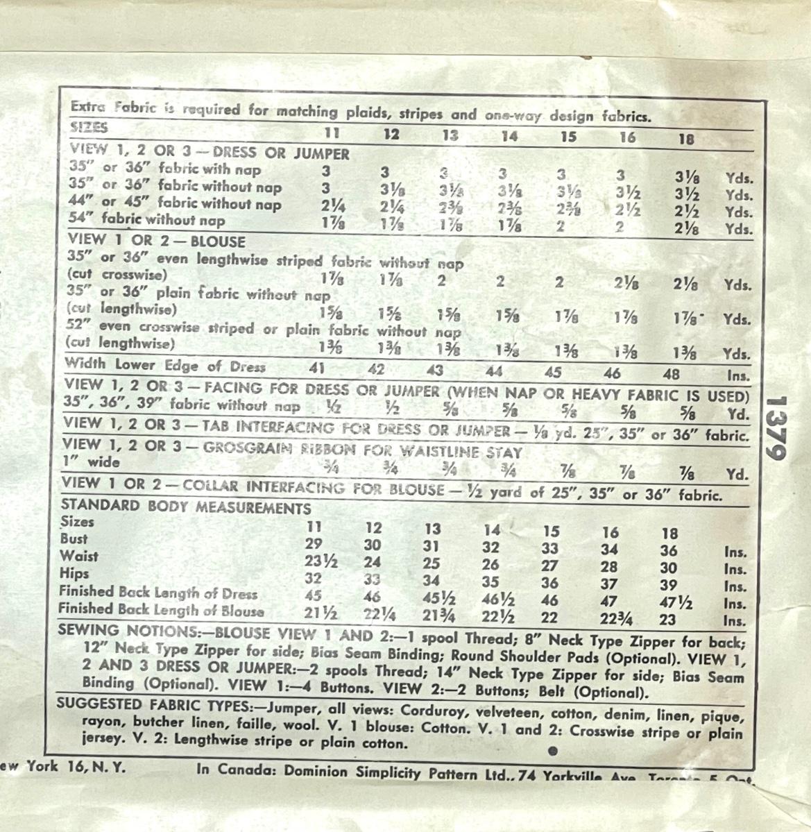 Simplicity Printed Pattern No. 1379 size 12 bust 30. All pieces verified.