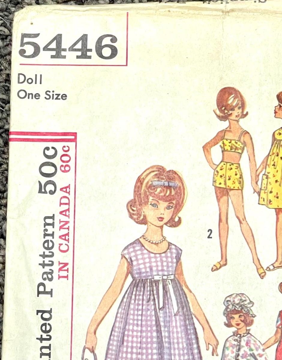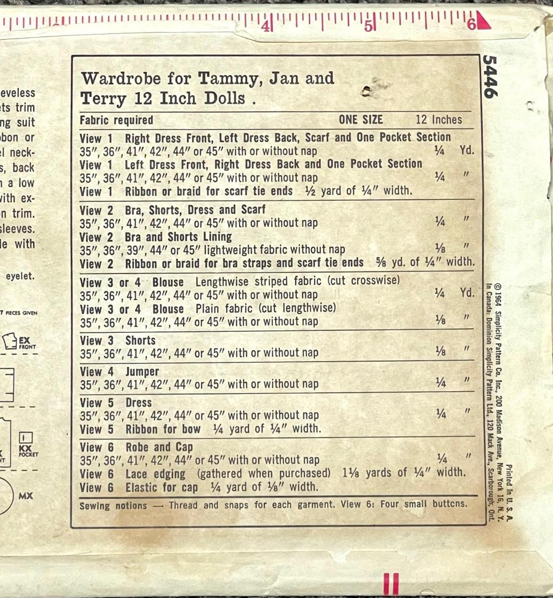Simplicity Printed Pattern Tammy wardrobe No. 5446 doll one size 1962. All pieces verified.