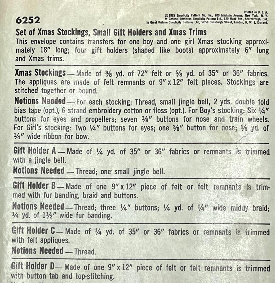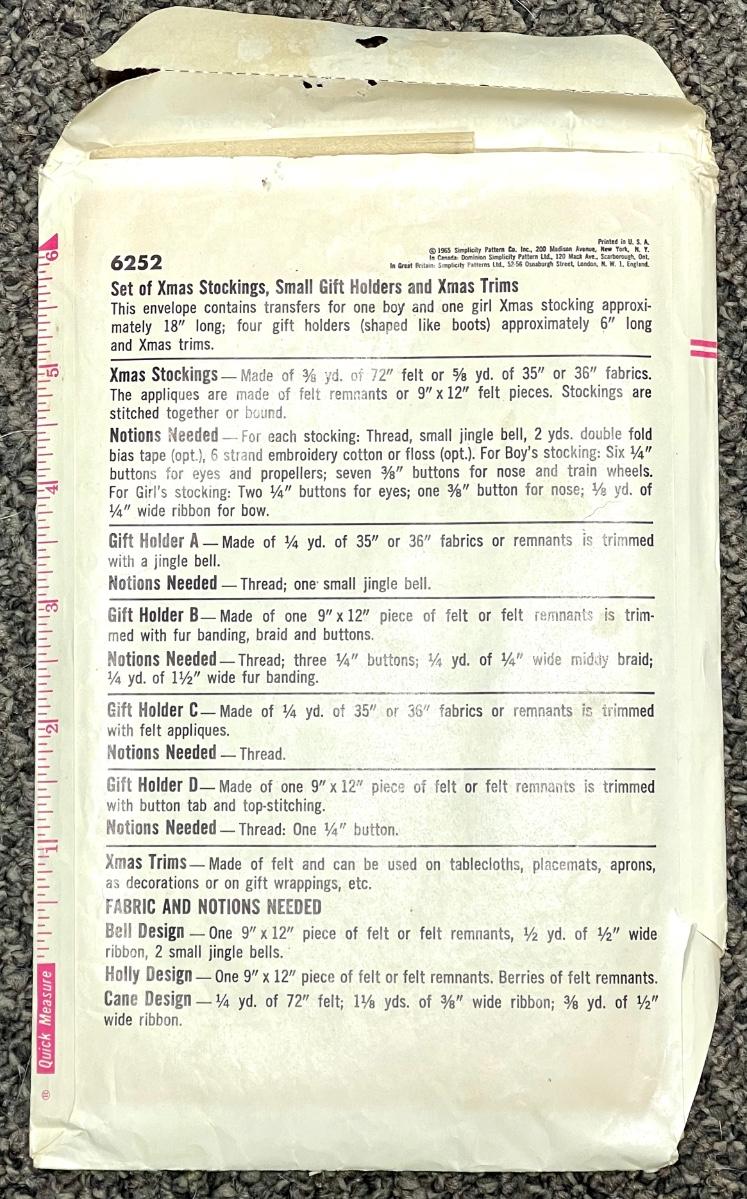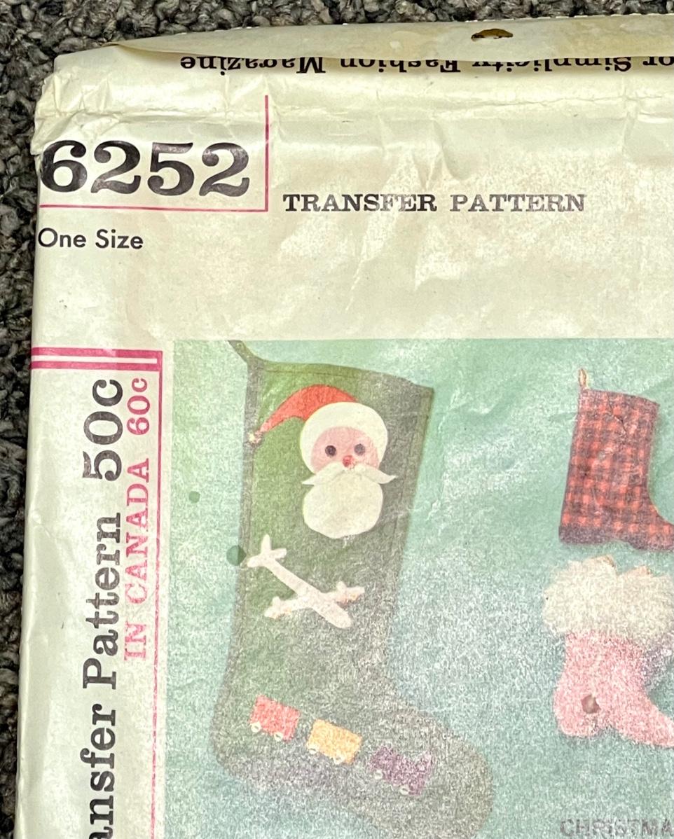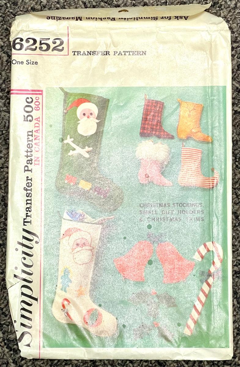 Simplicity Transfer Pattern No. 6252 one size Christmas Stockings, small gift holders & Christmas trims 1965. All pieces verified.
