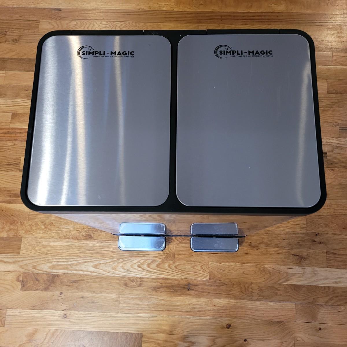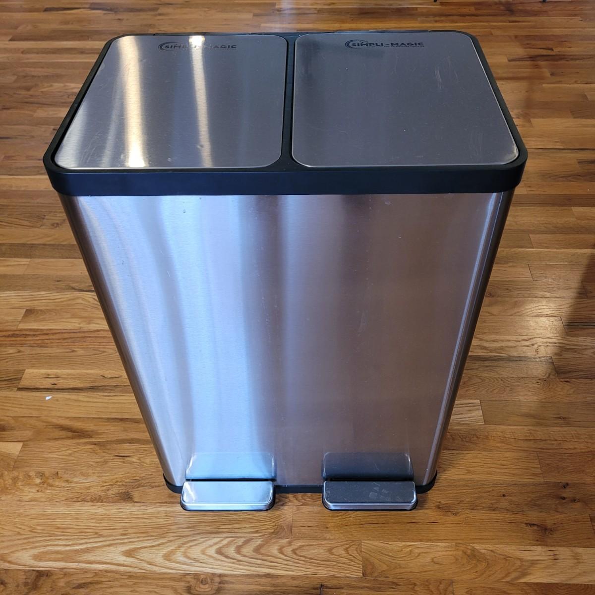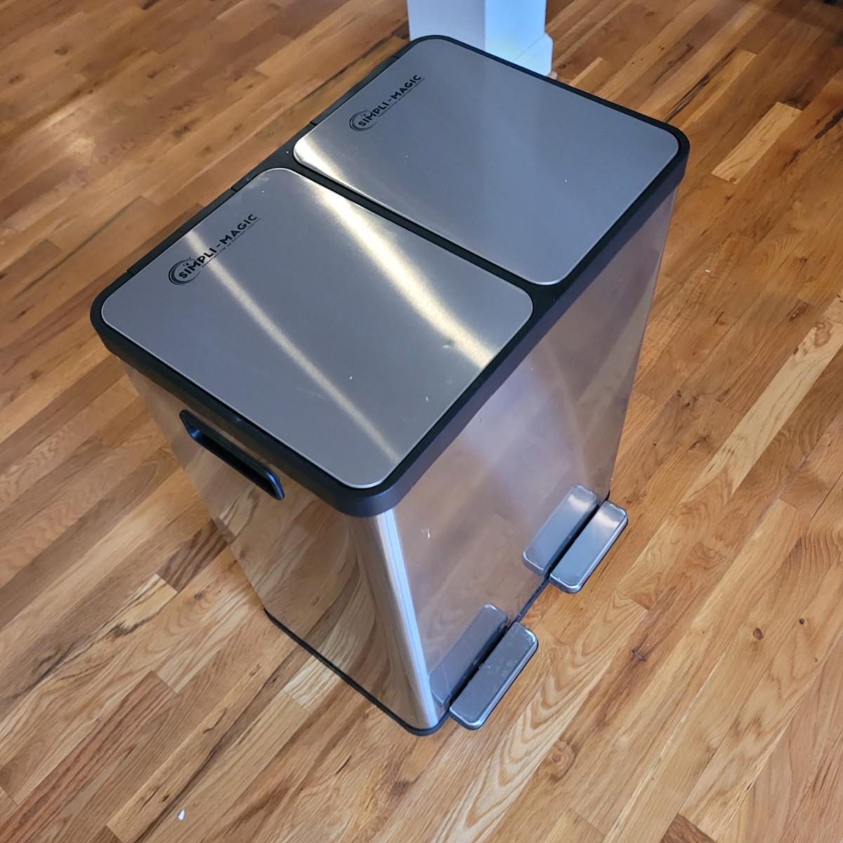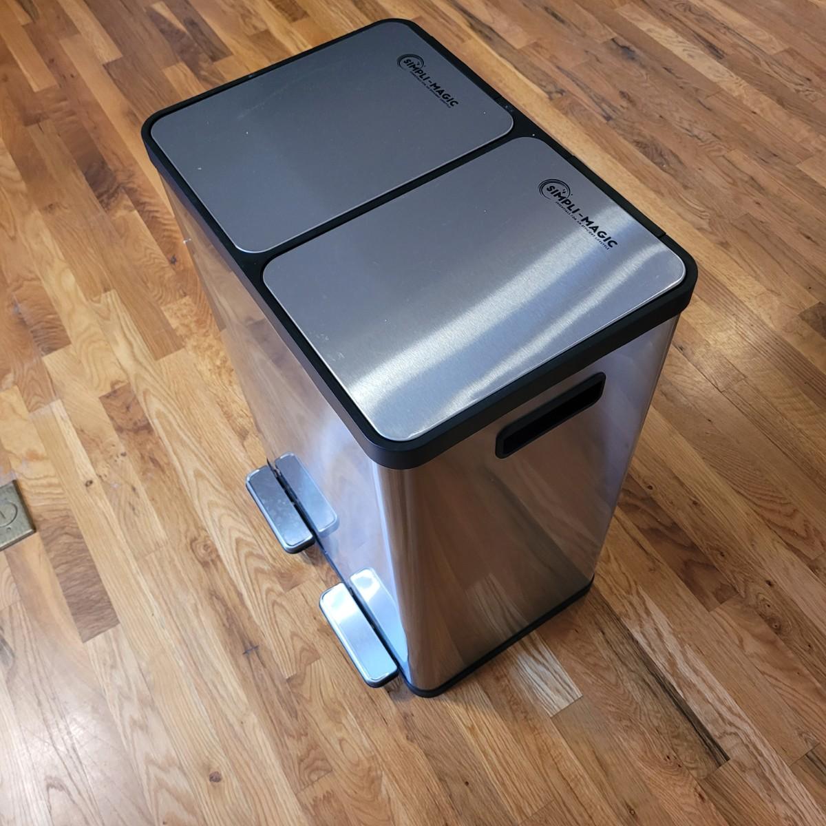 This auction is for a Simpli-Magic brand dual compartment trash and recycling bin. Has a floor pedal for hands free use. Lid is designed to close slowly without slamming. Has carrying handles in the side for easy transport. Made from plastic and metal. Does not have any bad odors. Bin measures 19" x 13" x 29"H.