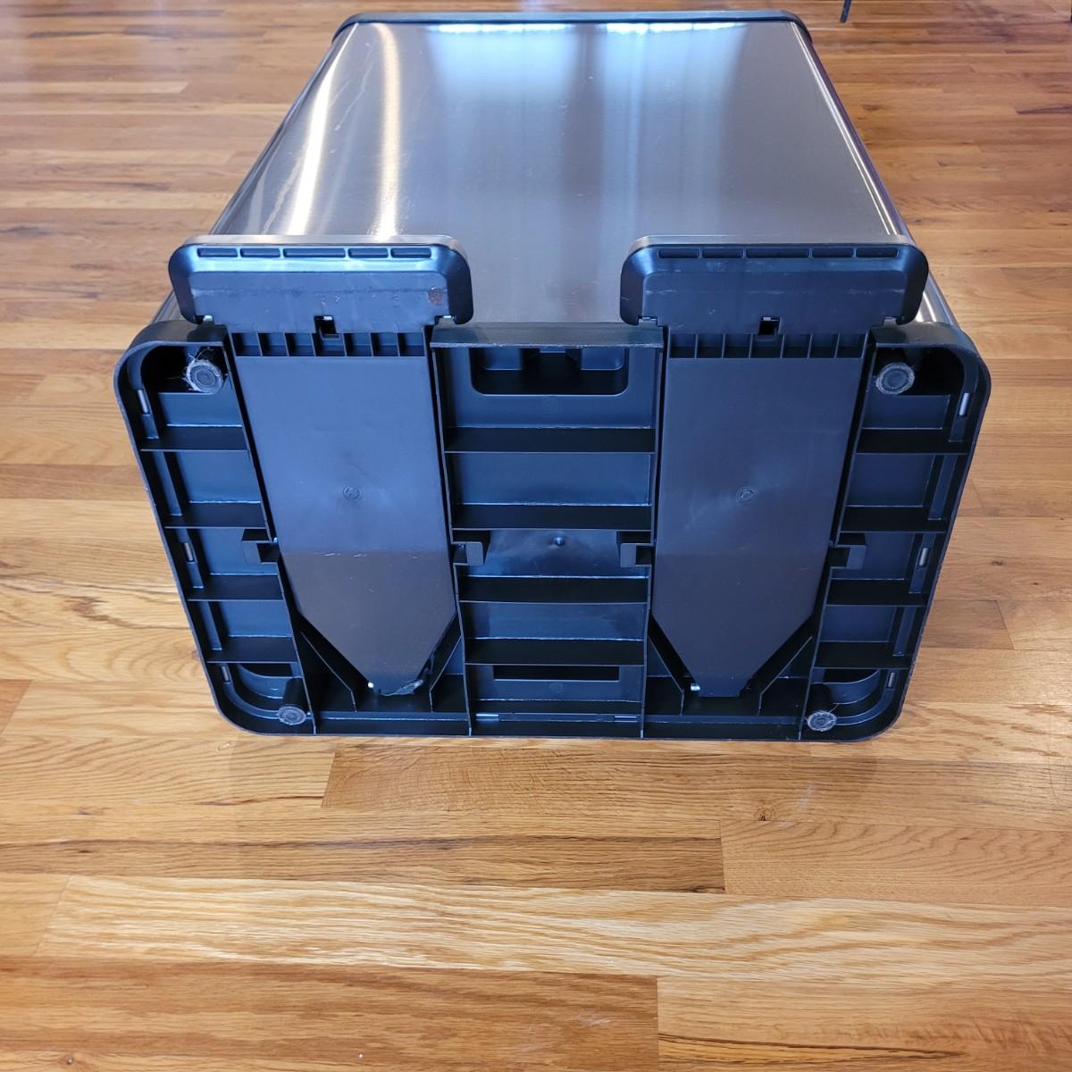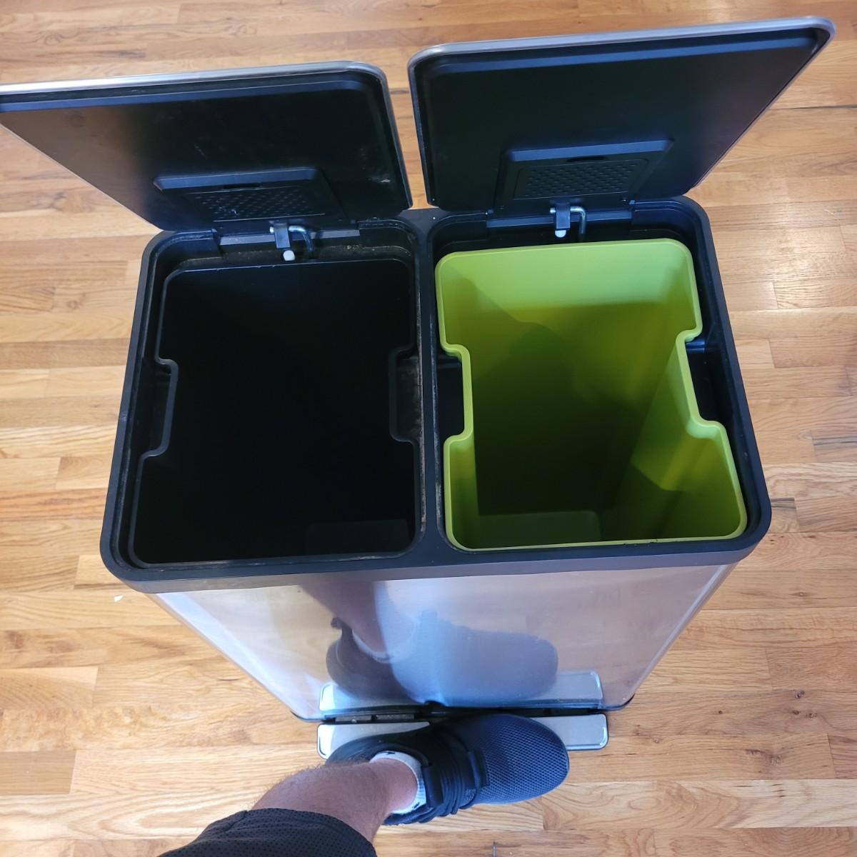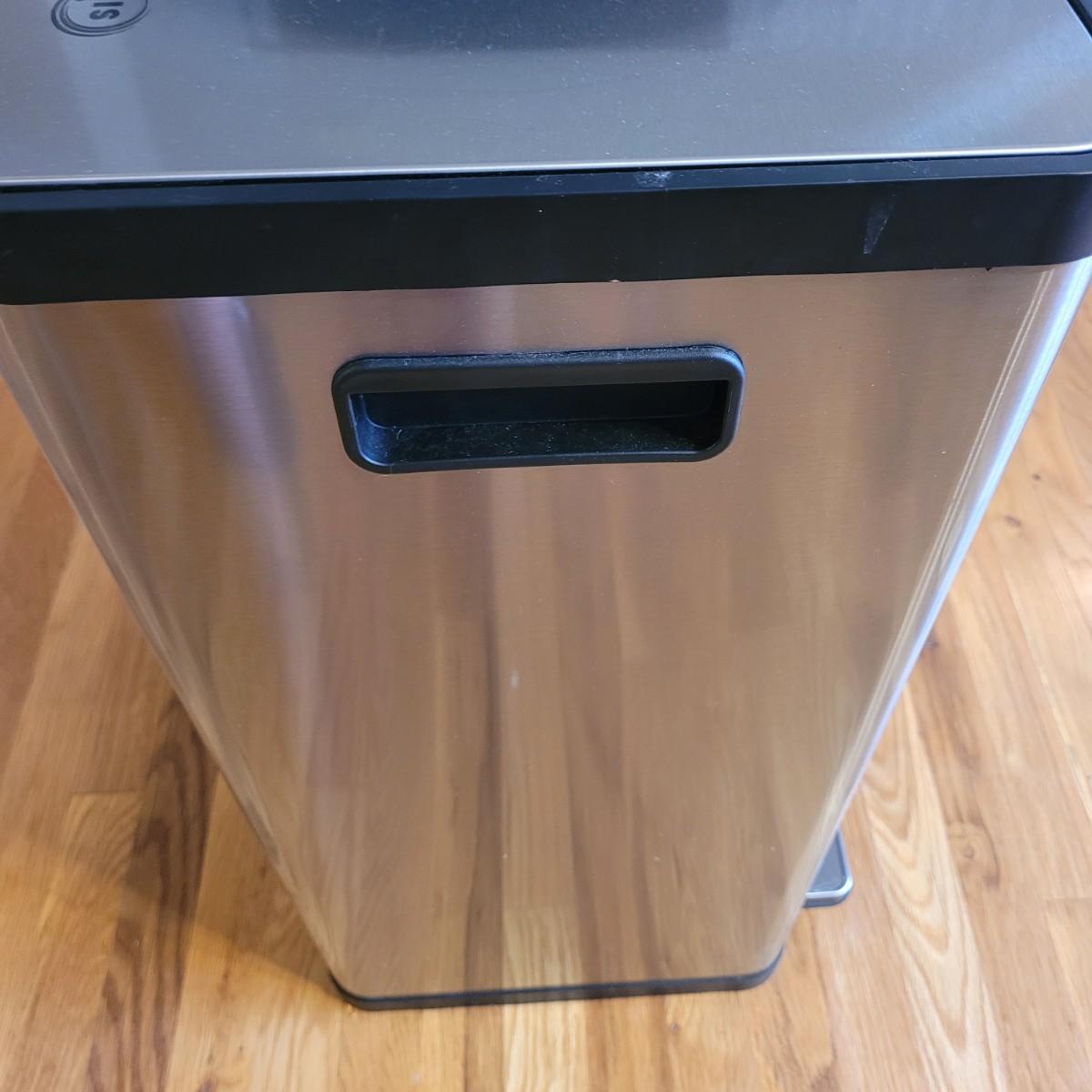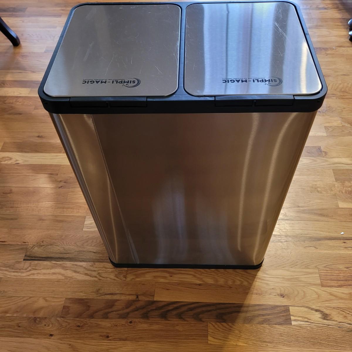 This auction is for a Simpli-Magic brand dual compartment trash and recycling bin. Has a floor pedal for hands free use. Lid is designed to close slowly without slamming. Has carrying handles in the side for easy transport. Made from plastic and metal. Does not have any bad odors. Bin measures 19" x 13" x 29"H.