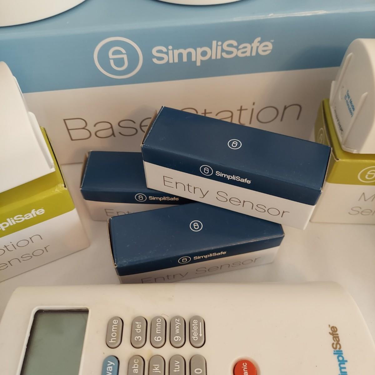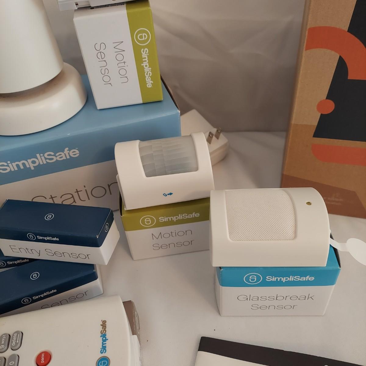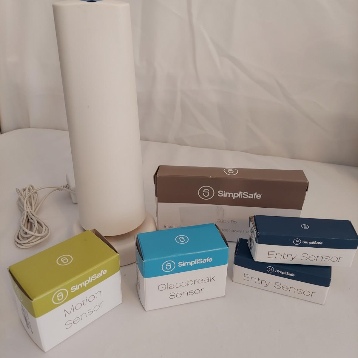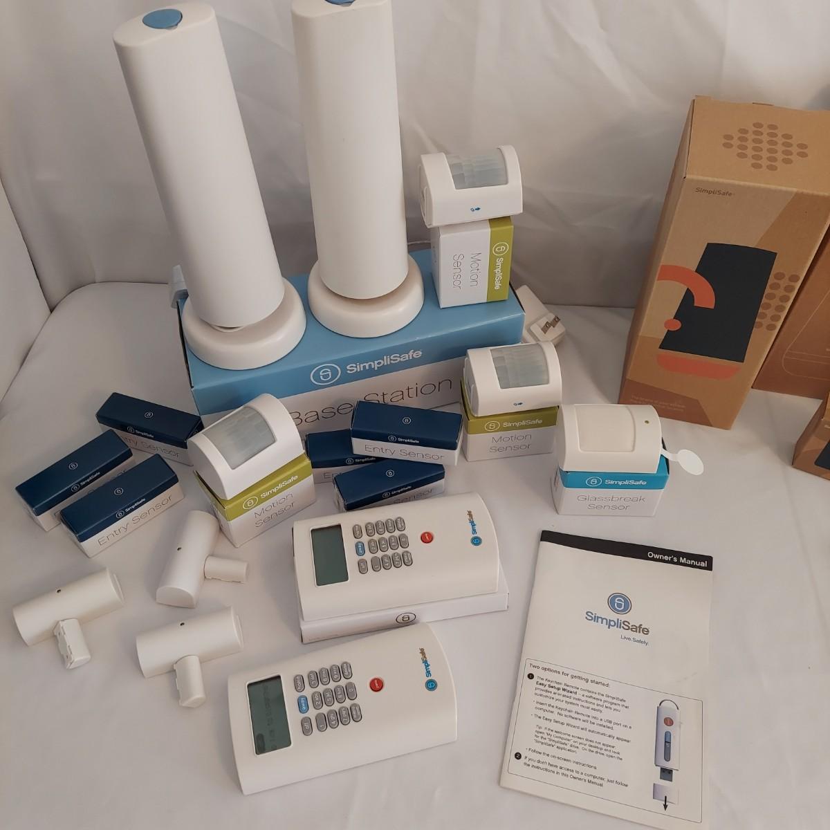 SimpliSafe security system includes two base units, three motion sensors, one glass break sensor, two control panels and five entry sensors with the owners manual. These items were installed and in use. Please see photos for details. Some items in tan boxes can be seen in photos. These items are for sale in another lot with a 3rd generation system. Shipping available.