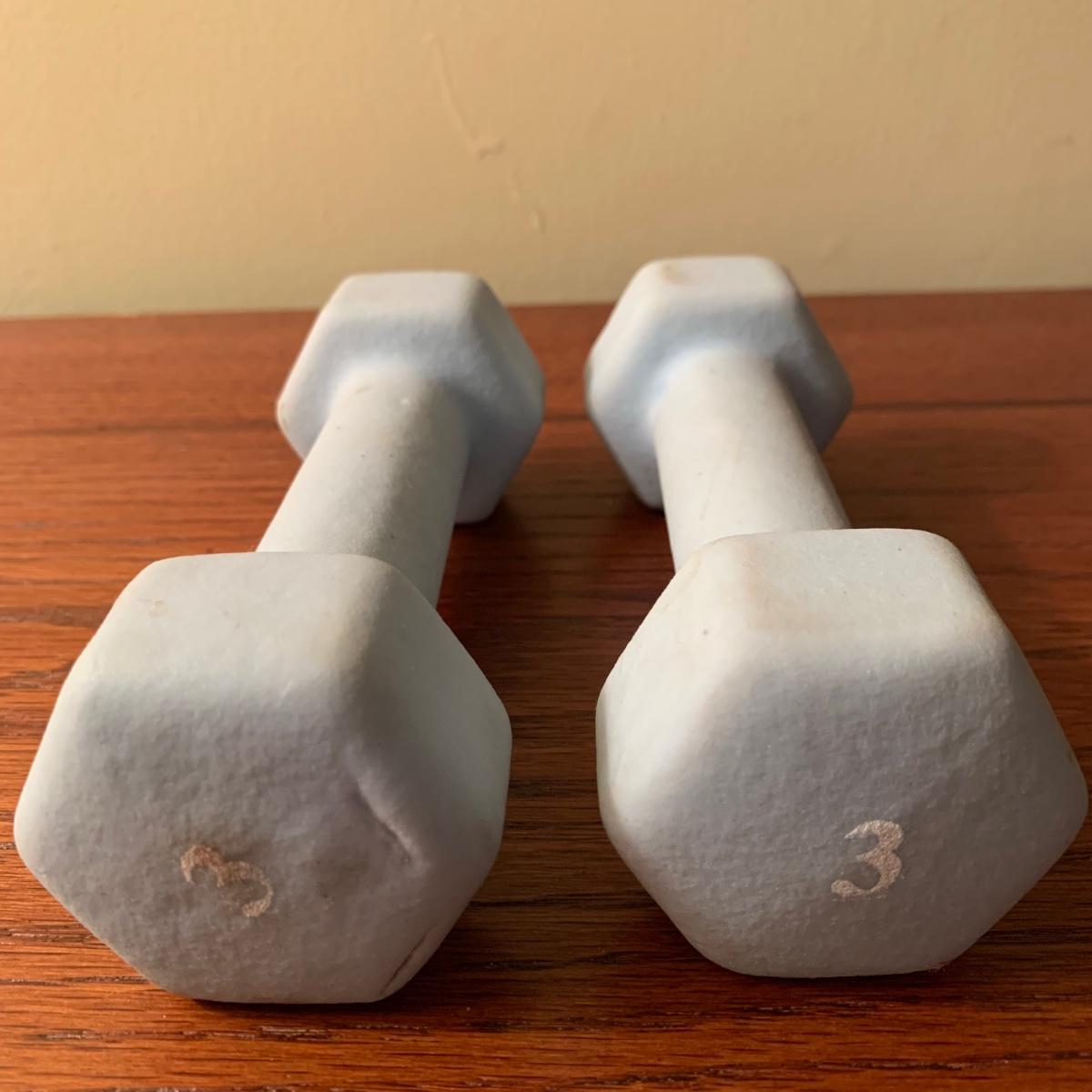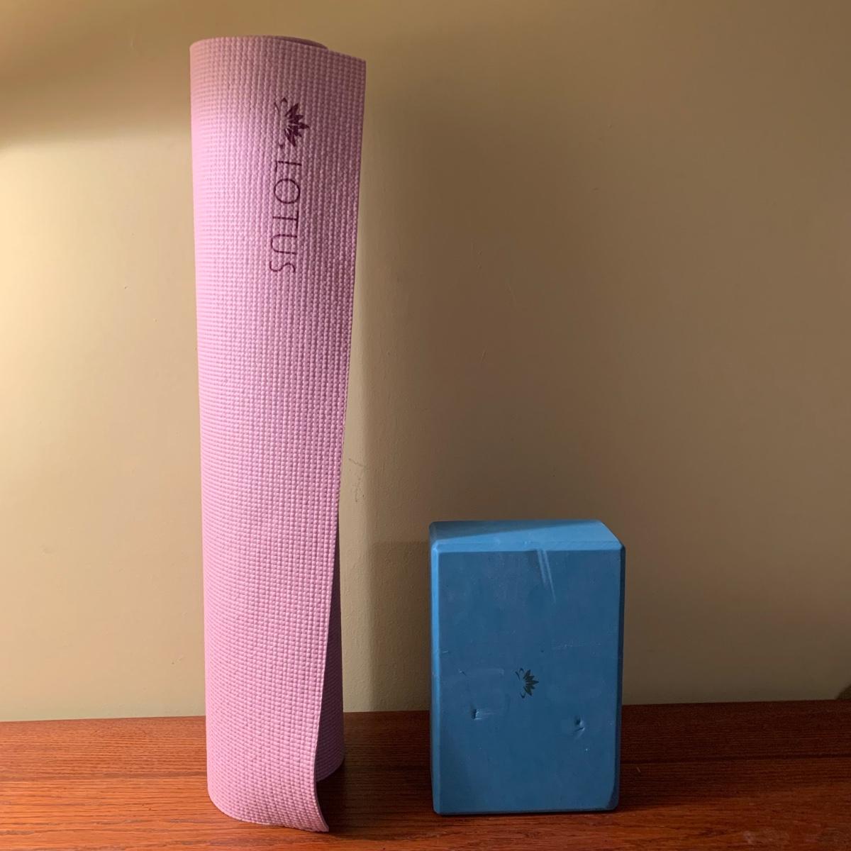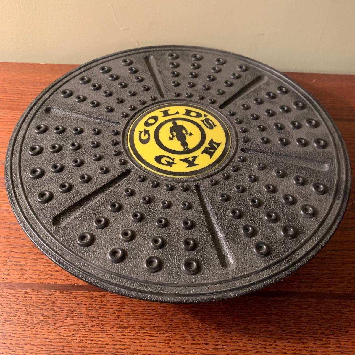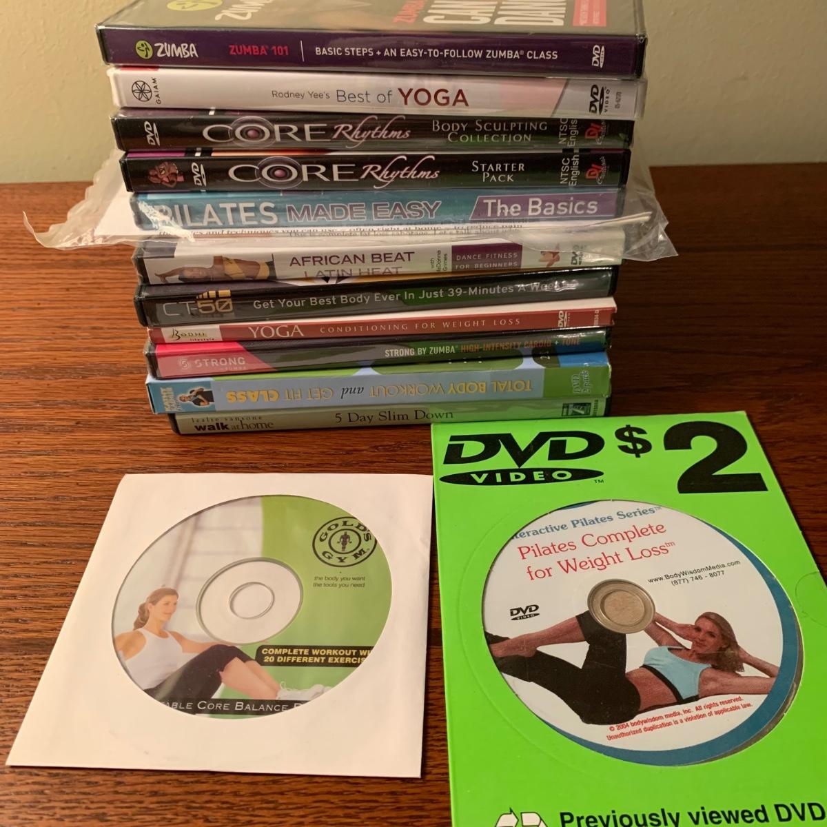 This variety of exercise equipment includes a Simply Fit Board with user guide and workout DVD, a lavender Lotus yoga mat, a Gold’s Gym balance board, a set of Softone wrist weights, three sets of dumbbells, a yoga block, a massager, 13 workout DVDs (many unopened), and a “˜Yoga Burns Fat’ book. The Simply Fit Board is 25.5” x 11.25”. The dumbbells all have some stains and the yoga block has some small indentation blemishes. The massager is battery powered and powered on when tested.