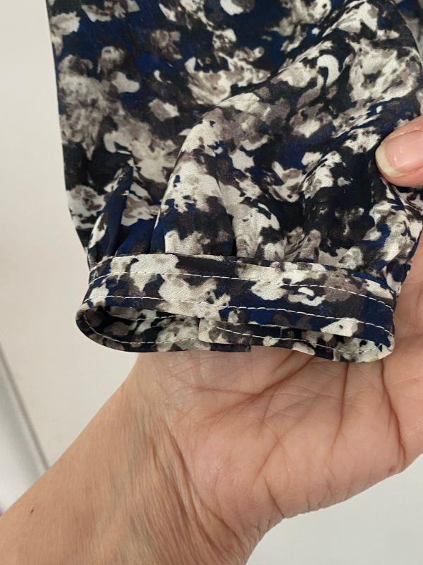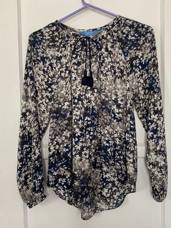 Simply Vera by Vera Wang blue/gray floral pattern peasant blouse. Tie at the collar, flowy fabric. Size PM.