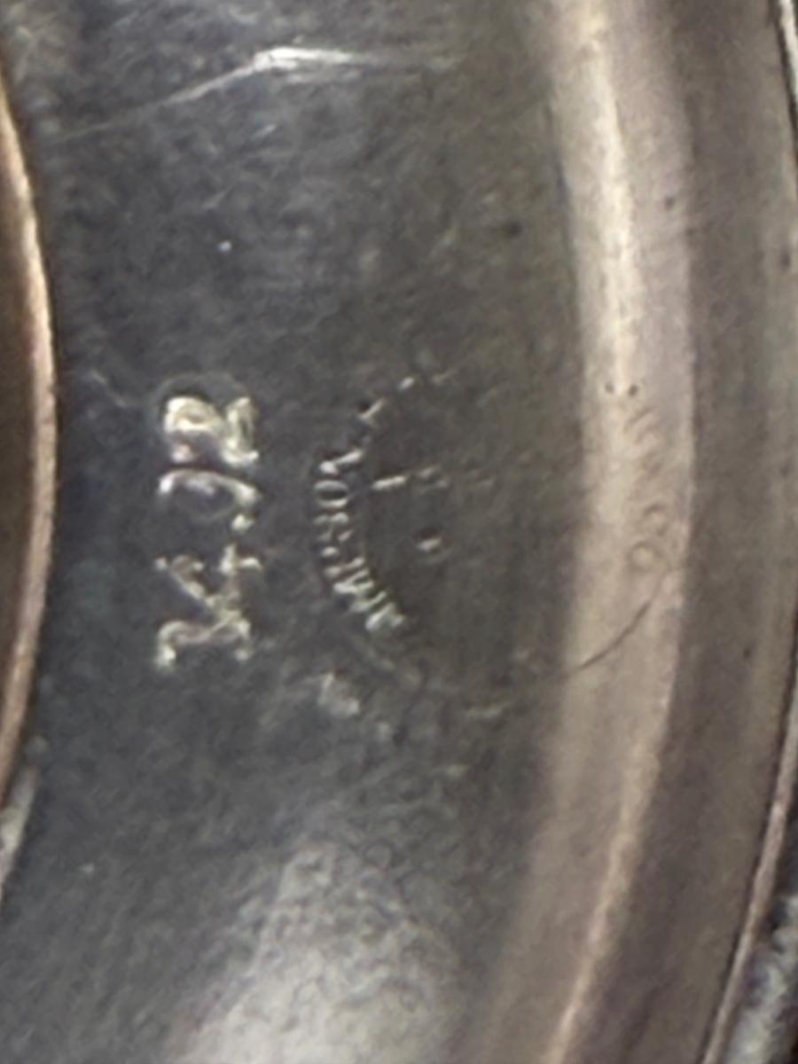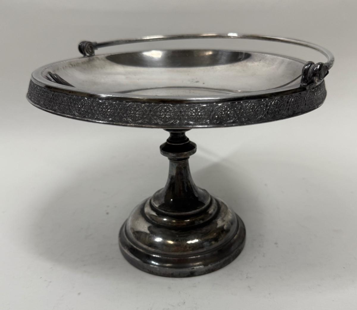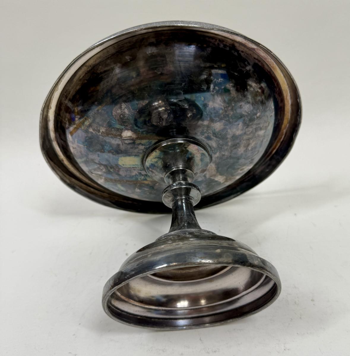 Treble silverplated, good condition. Approx. 7" high and 9.5" across. Stamped "1492" on the bottom of the pedestal. Heavy. Likely dates to the 1890's.