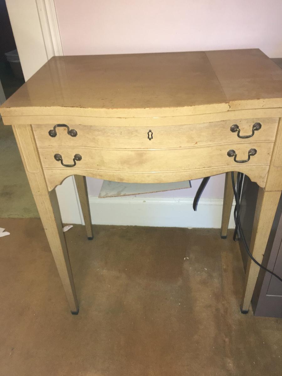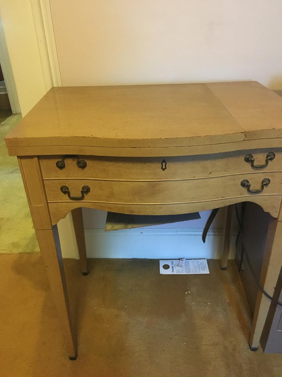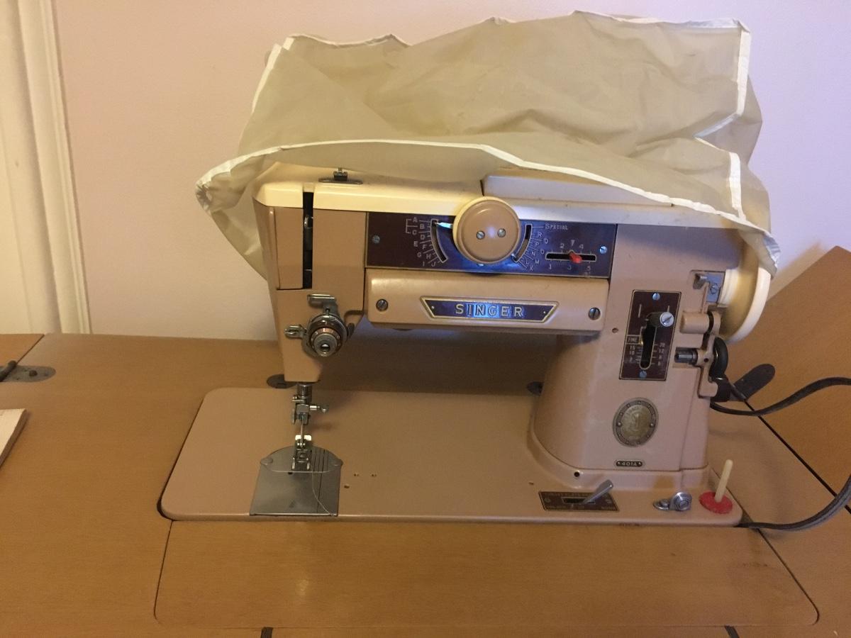 THI Singer sewing machine comes with it's own cabinet. In working conditionalthough coulduse a tune up as it has not been used for a while. Plastic cover. Knee pedal.