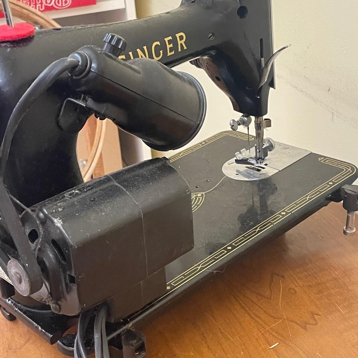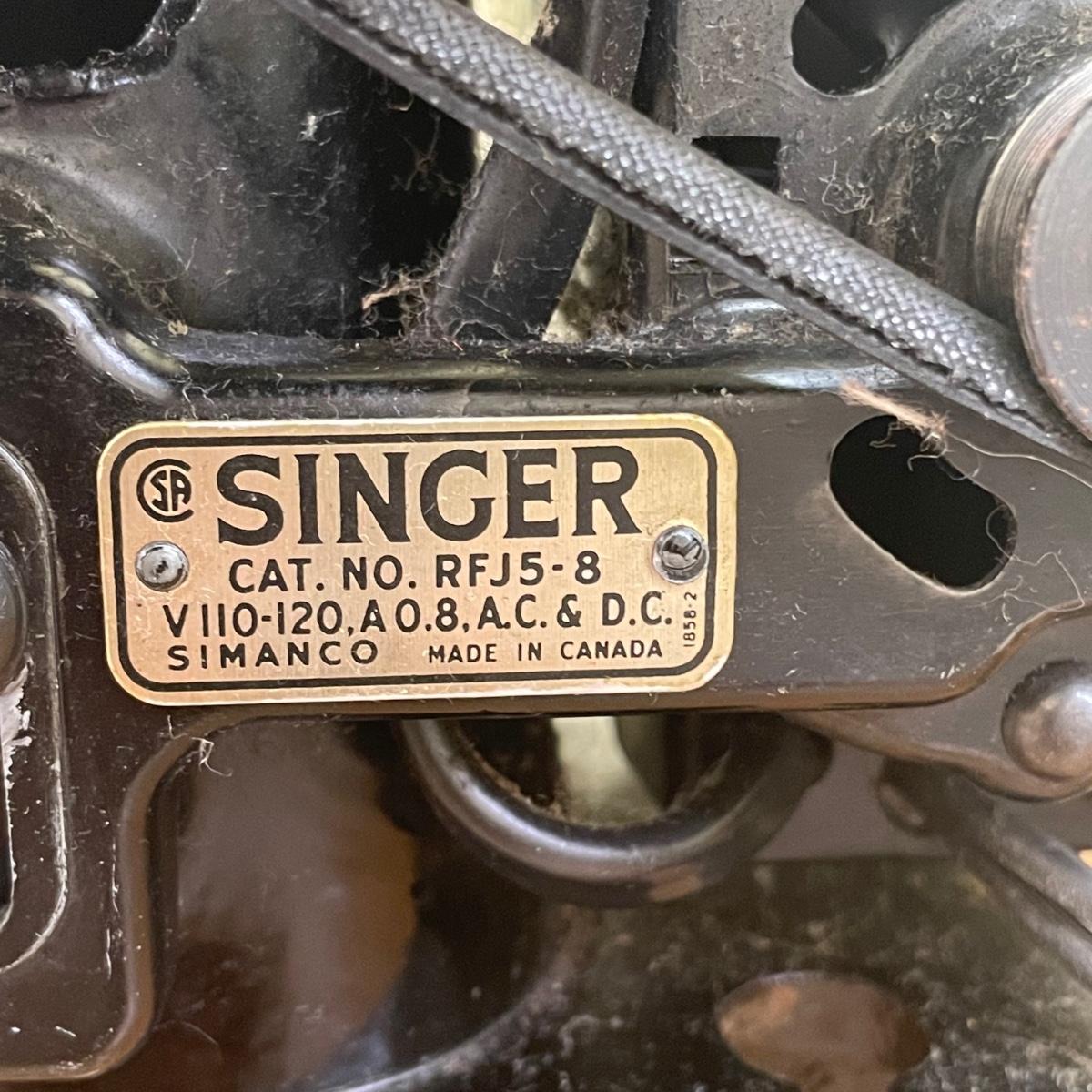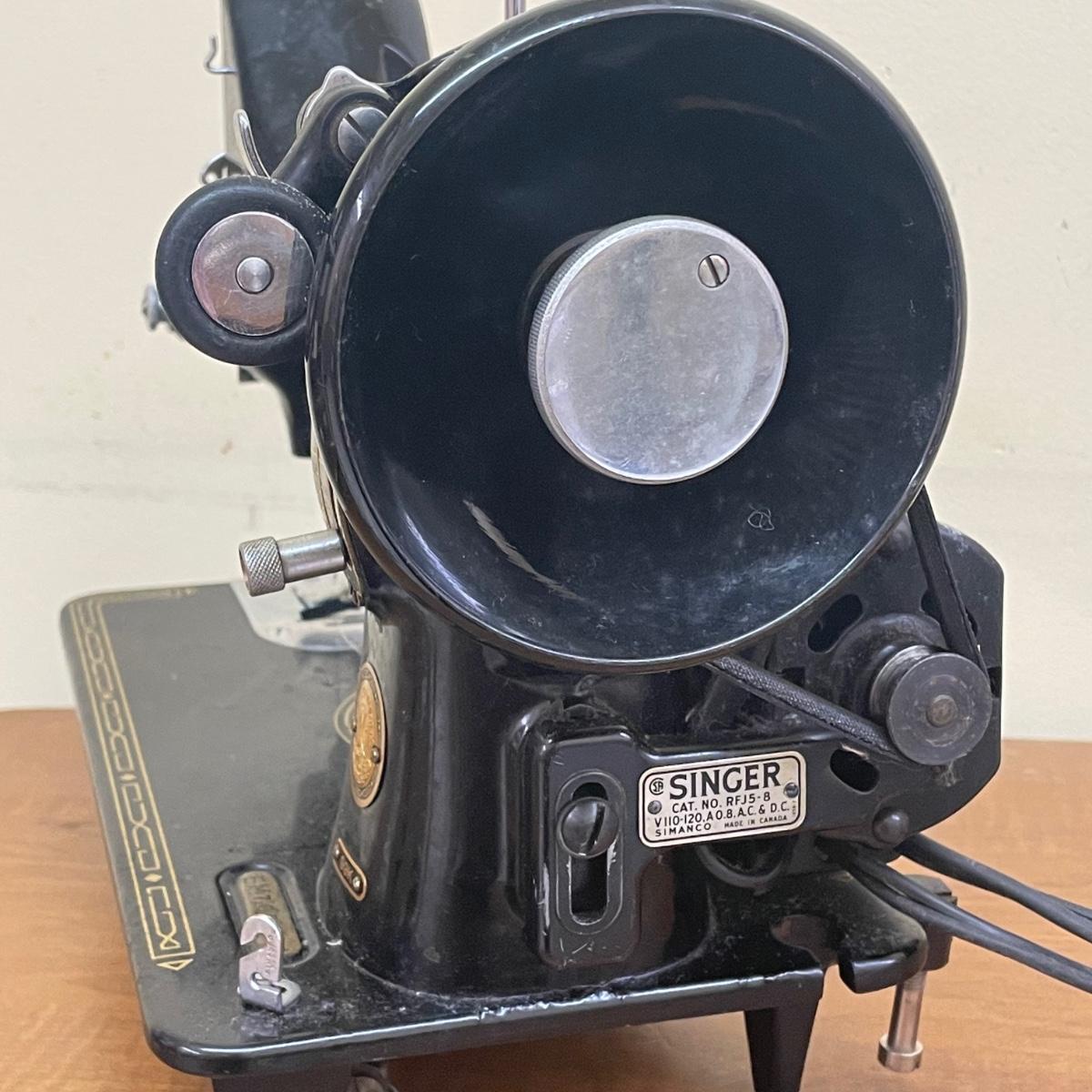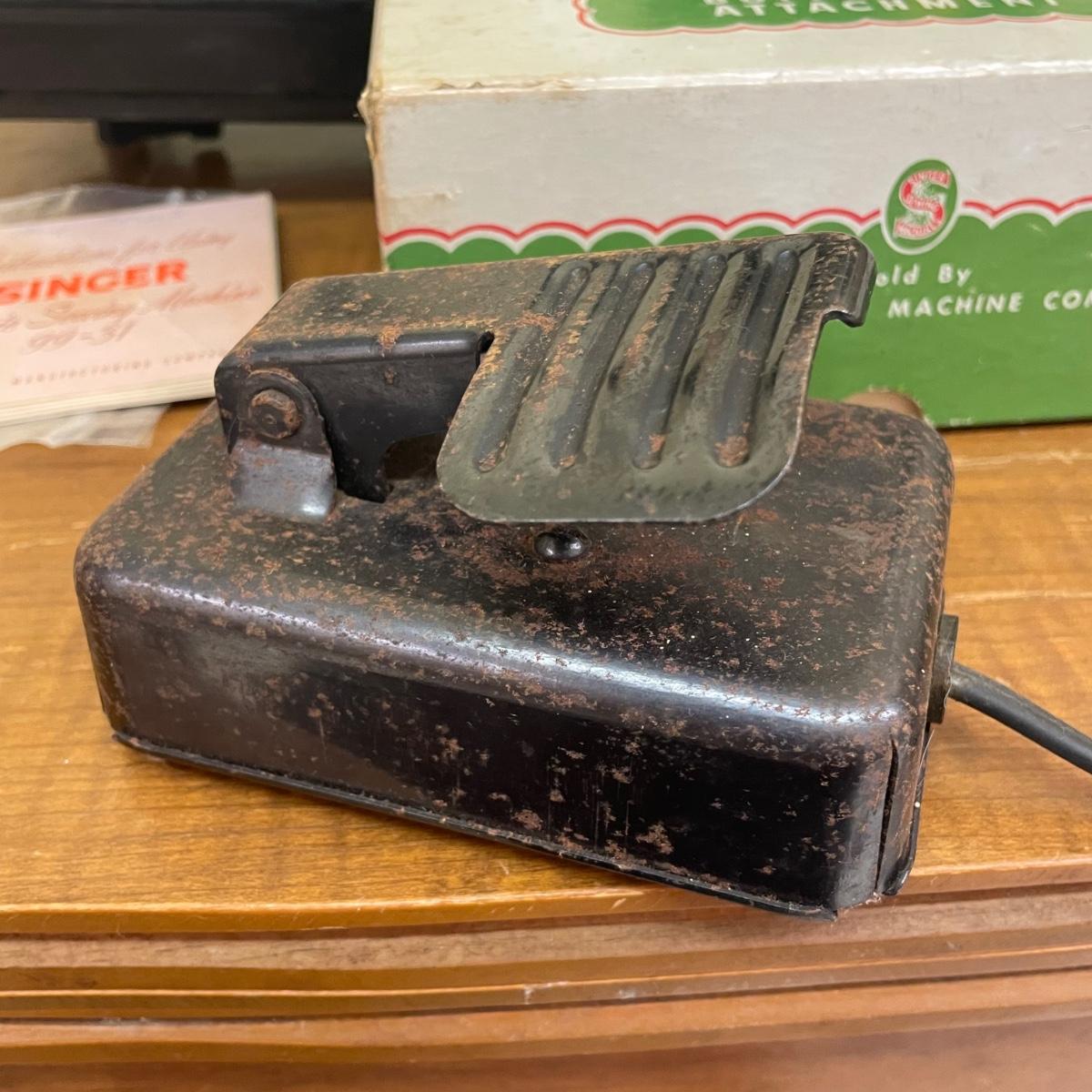 This handsome Singer sewing machine, made in 1955, powered on when plugged in. Pedal moves freely and easily and all parts got to work immediately including the spotlight lamp. The belt is frayed but a new replacement is included. Also included is the manual, a buttonhole attachment that's in its original box, and more.