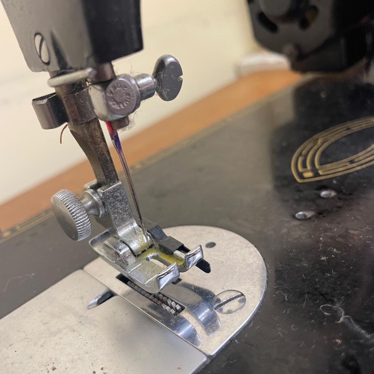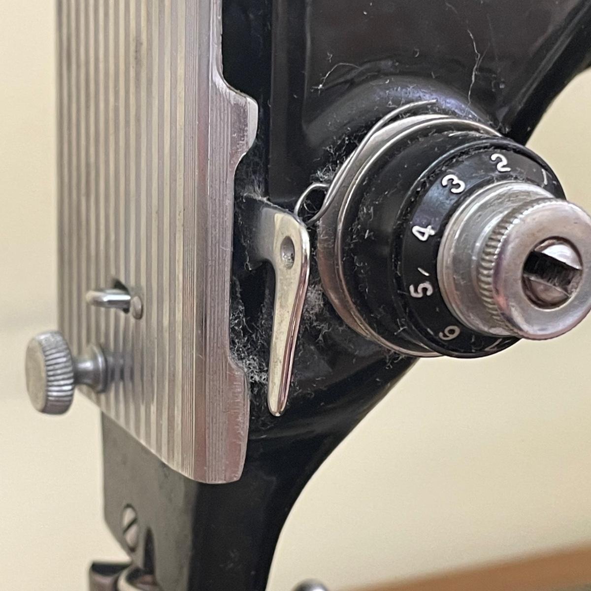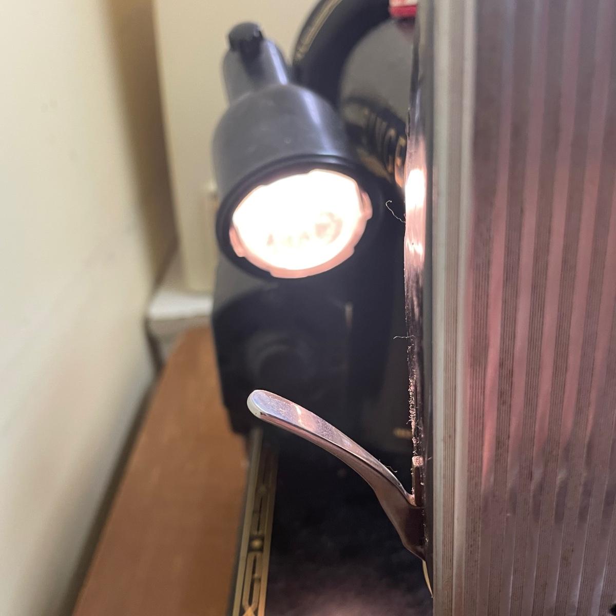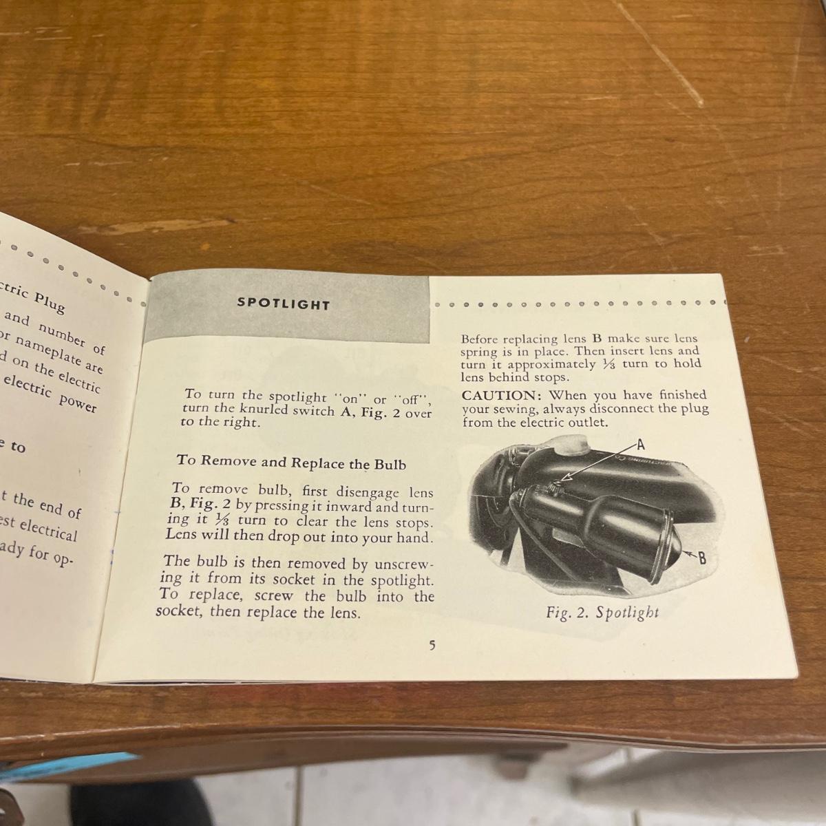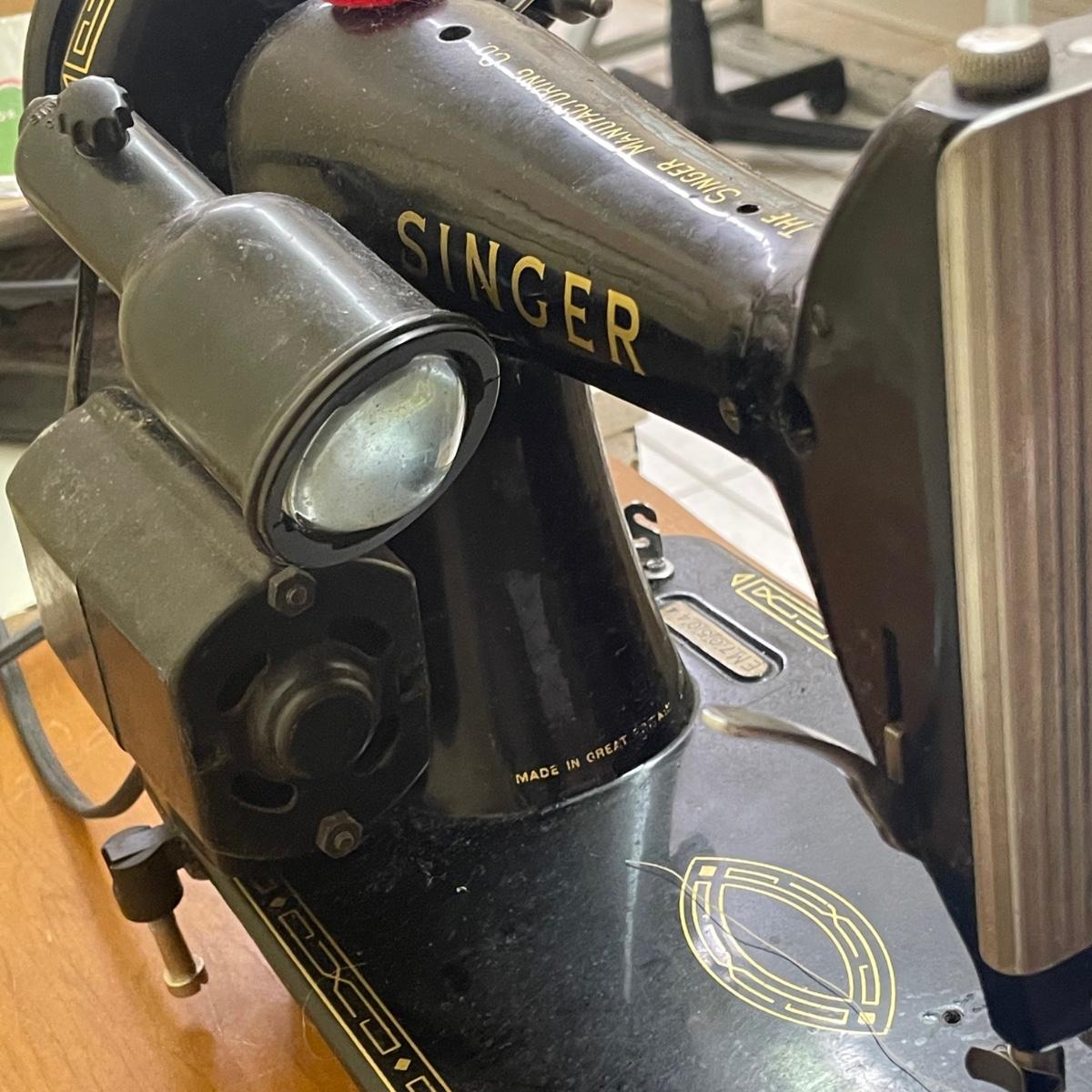 This handsome Singer sewing machine, made in 1955, powered on when plugged in. Pedal moves freely and easily and all parts got to work immediately including the spotlight lamp. The belt is frayed but a new replacement is included. Also included is the manual, a buttonhole attachment that's in its original box, and more.