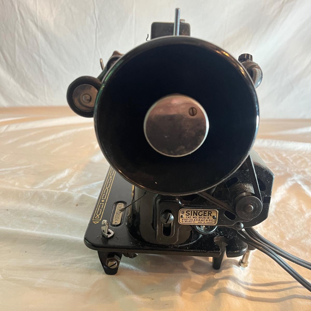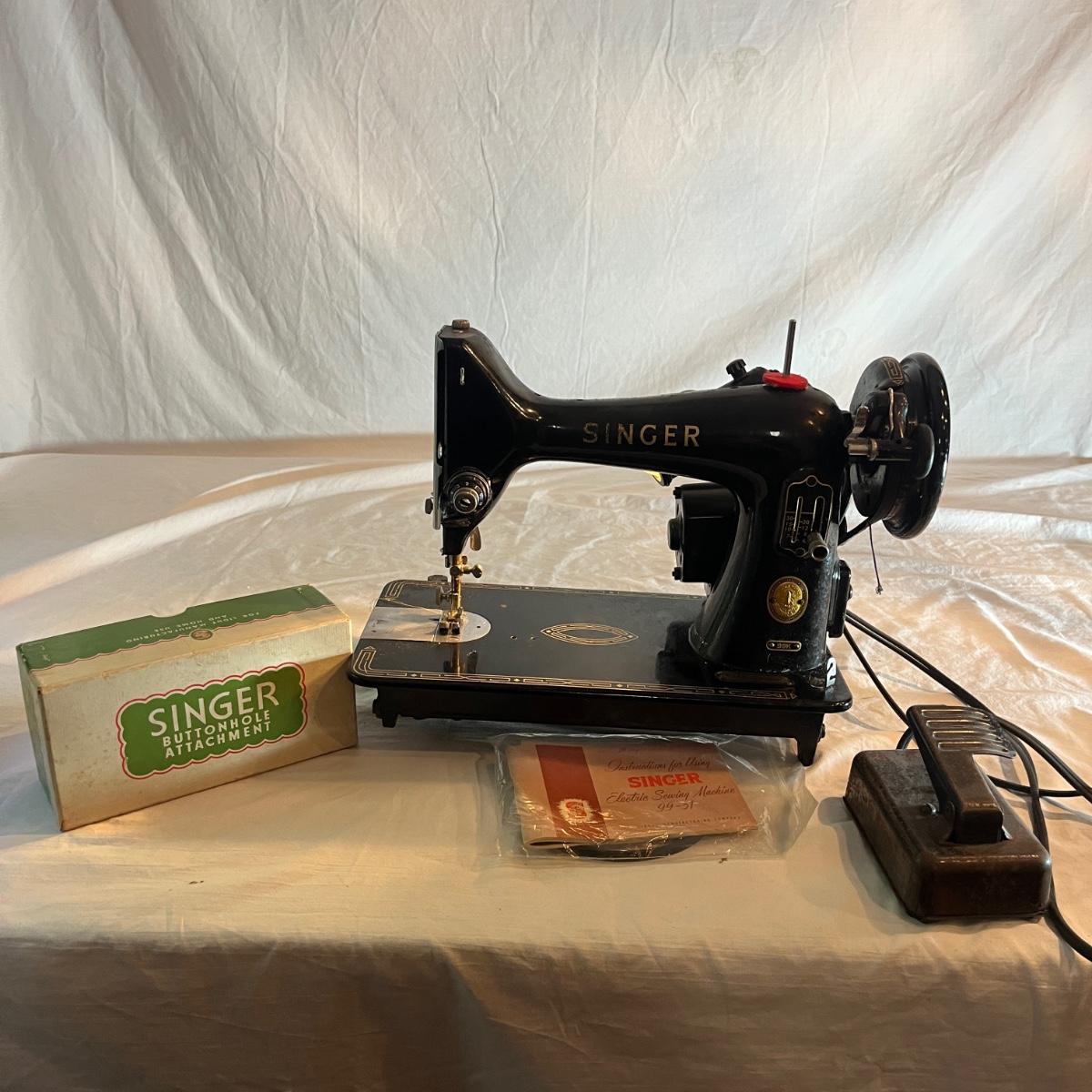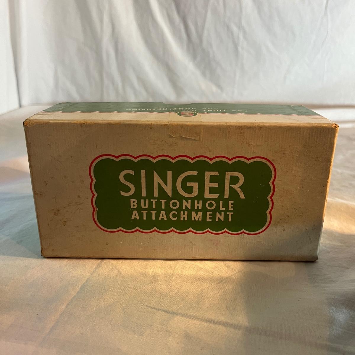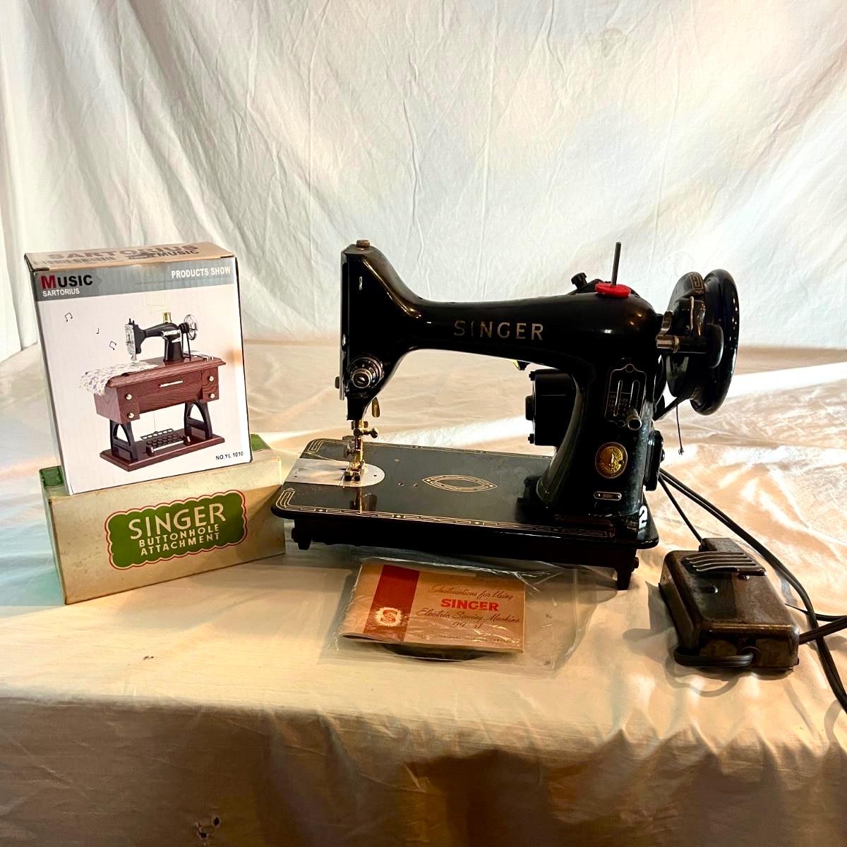 This Singer sewing machine has attached foot pedal, buttonhole attachment and instruction manual. Machine does not have case. Machine powered on when plugged in. Also includes NIB sewing machine music box. Singer machine measures 14” x 7.25” x 11.5”H.