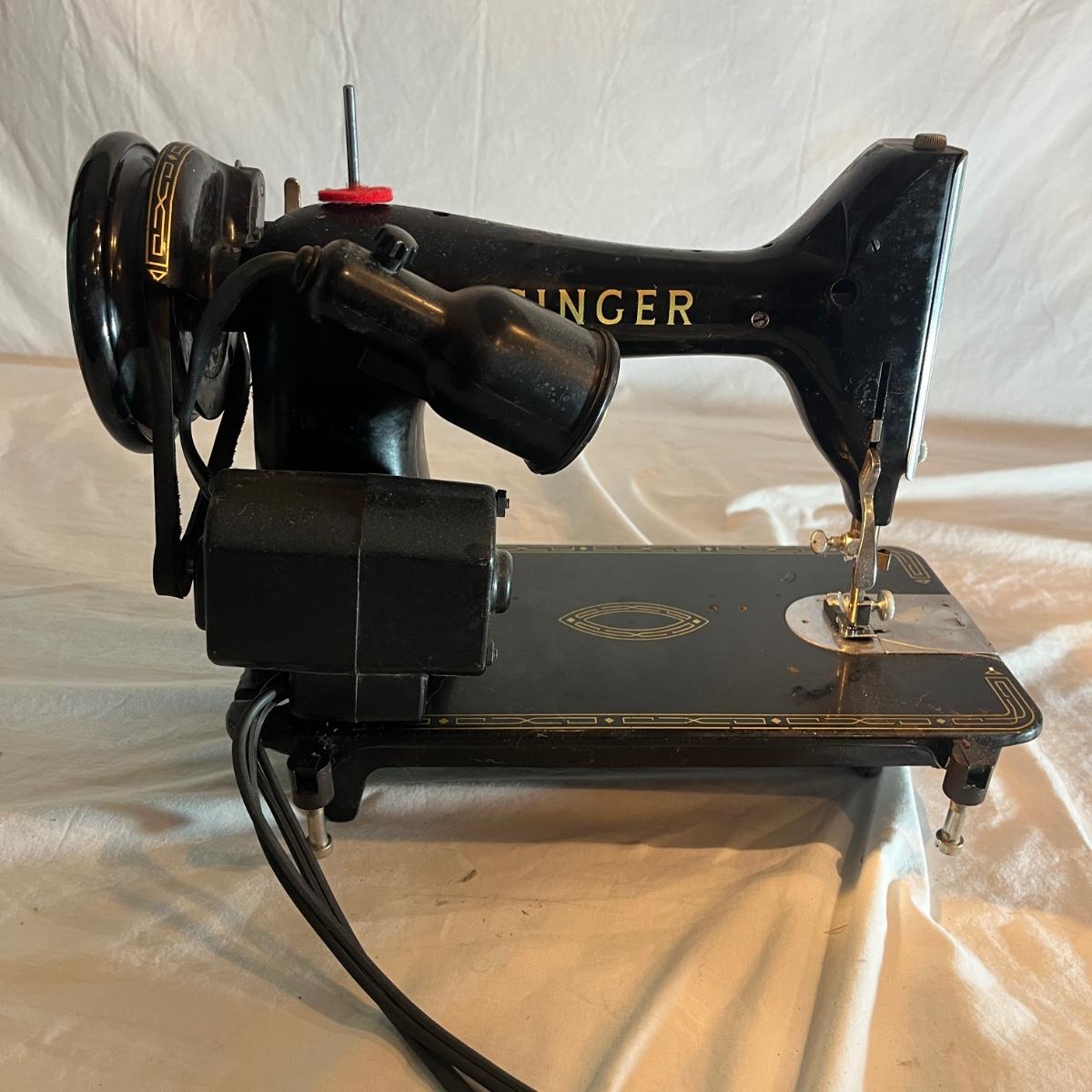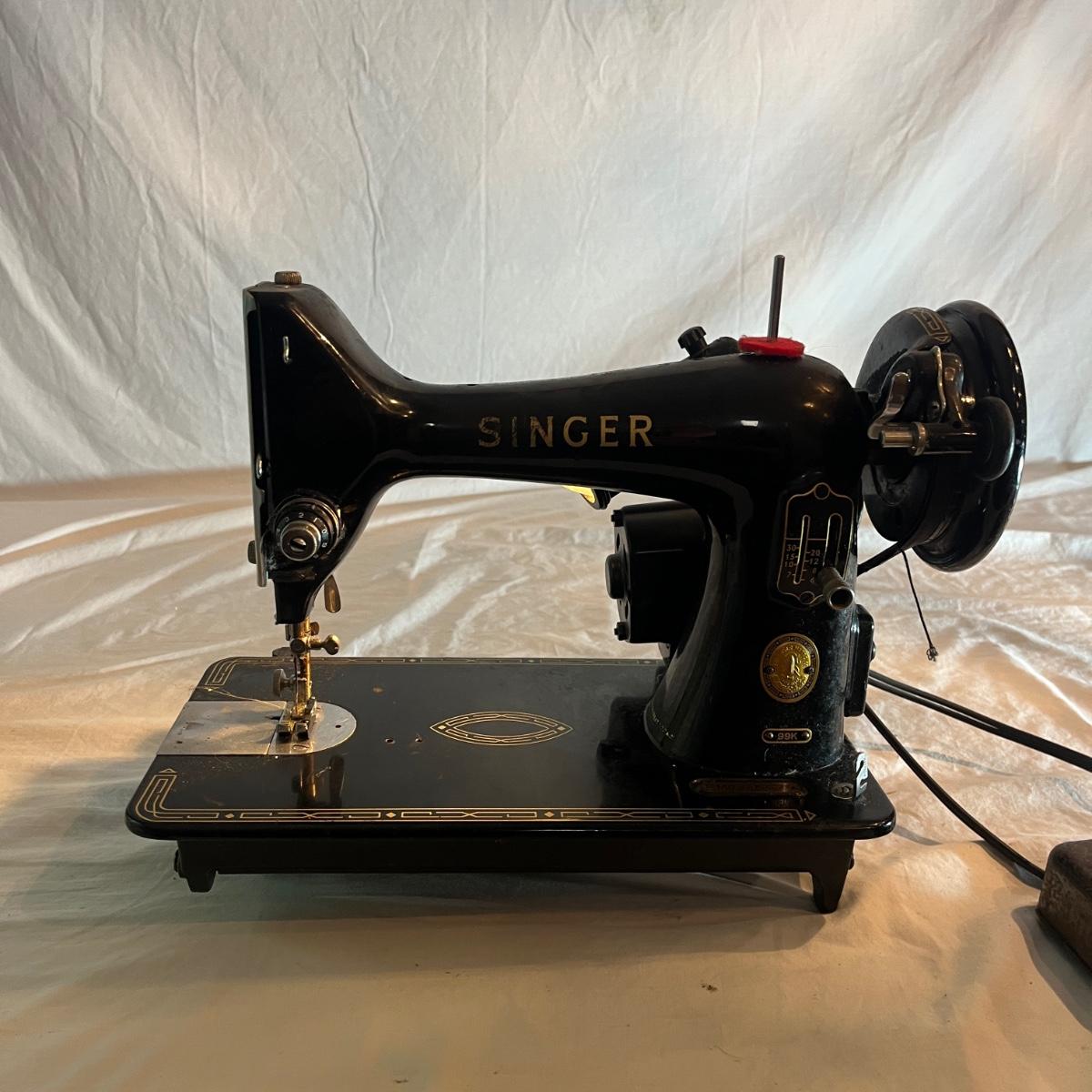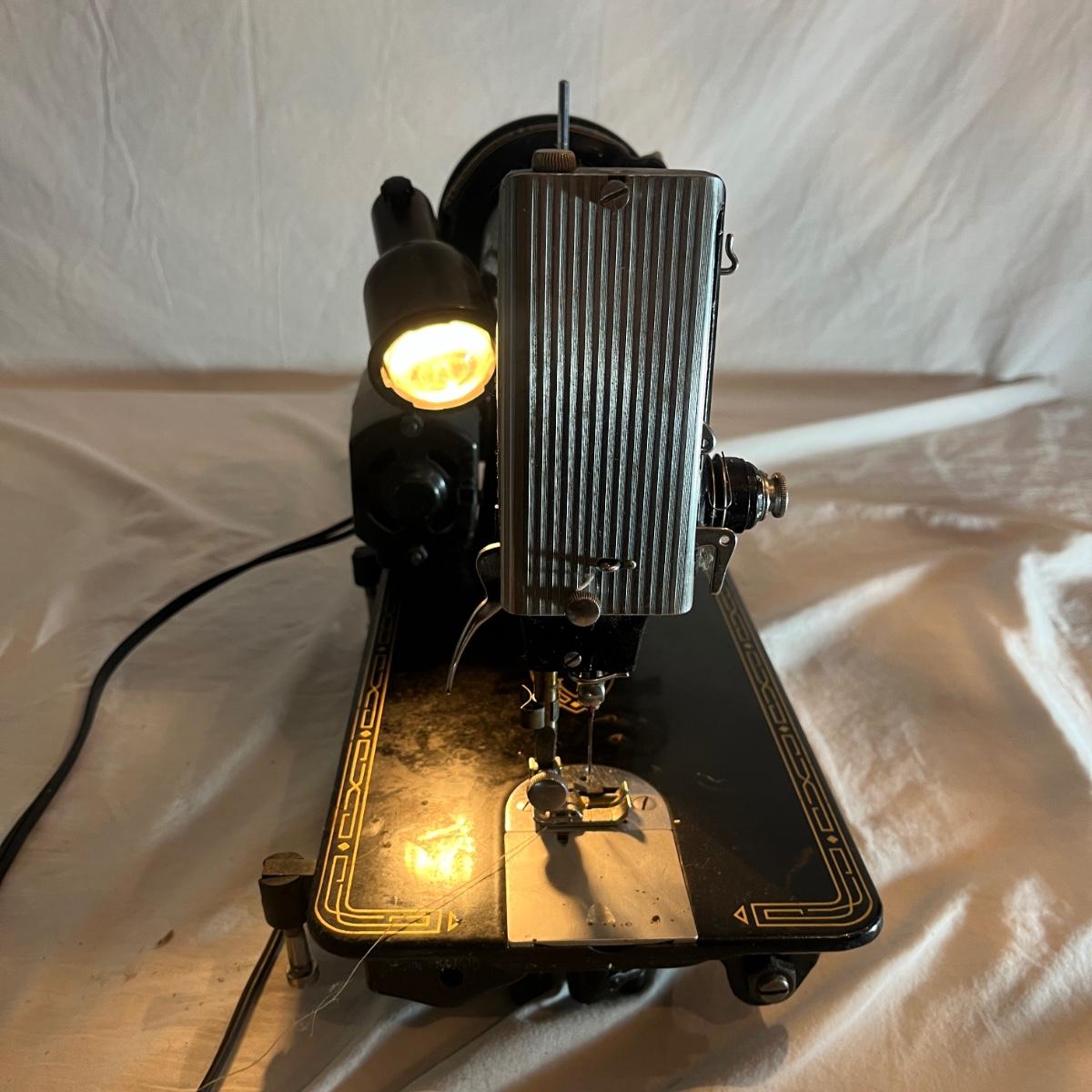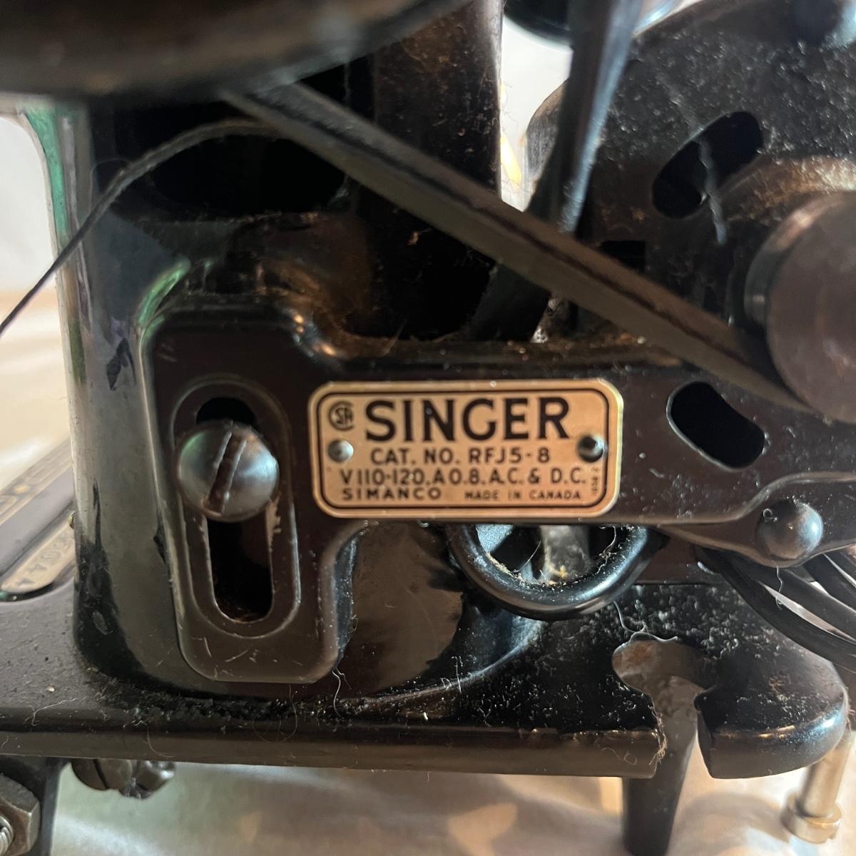 This Singer sewing machine has attached foot pedal, buttonhole attachment and instruction manual. Machine does not have case. Machine powered on when plugged in. Also includes NIB sewing machine music box. Singer machine measures 14” x 7.25” x 11.5”H.