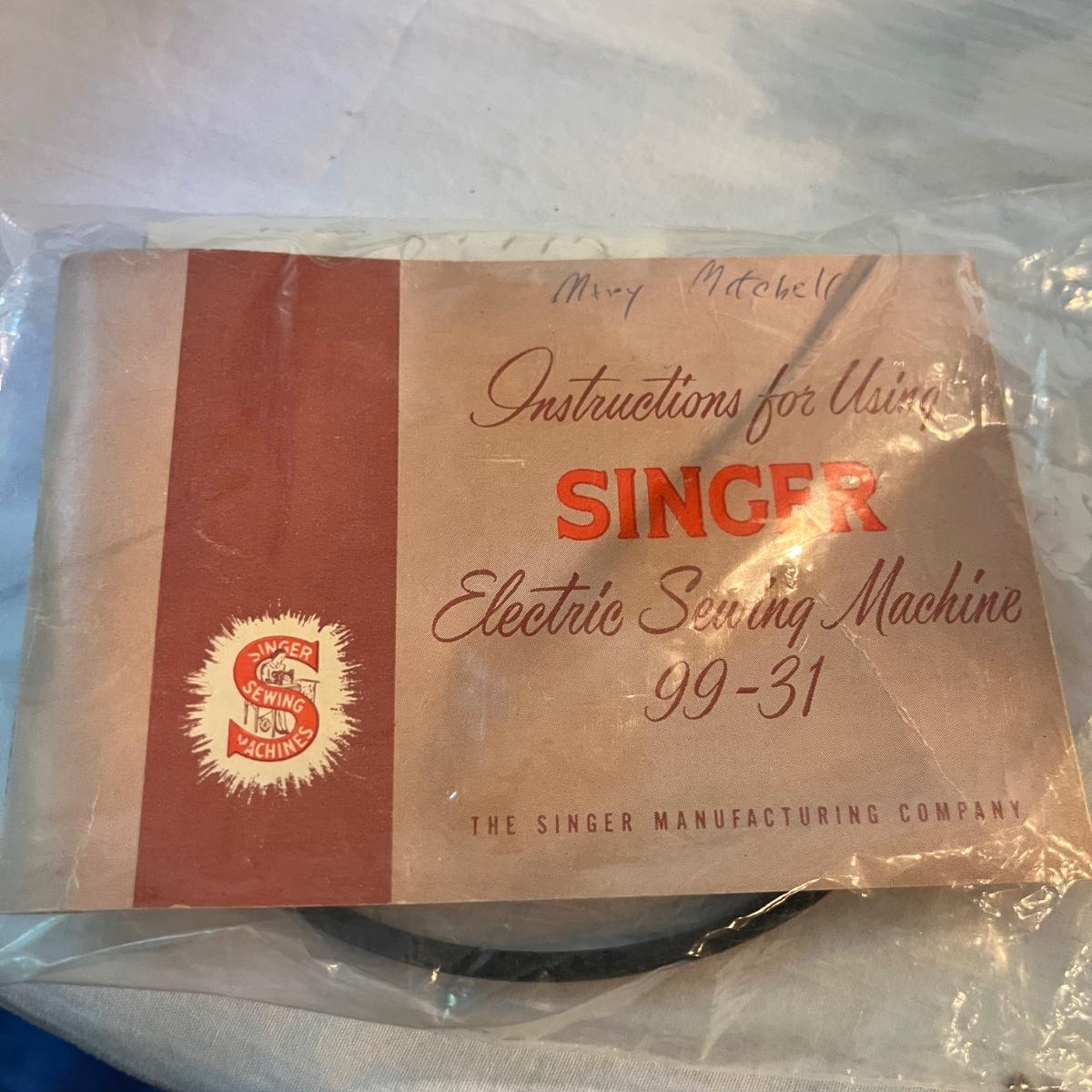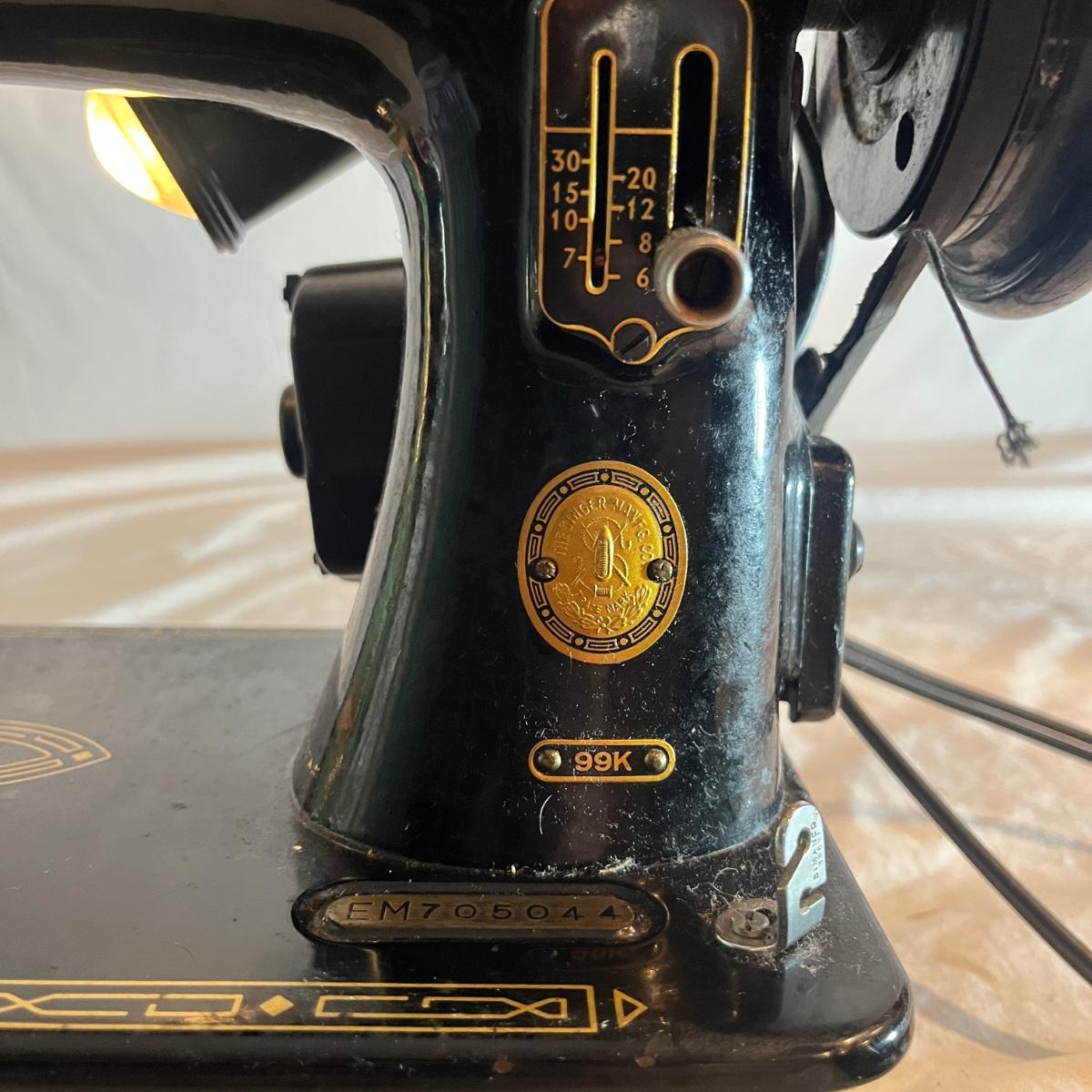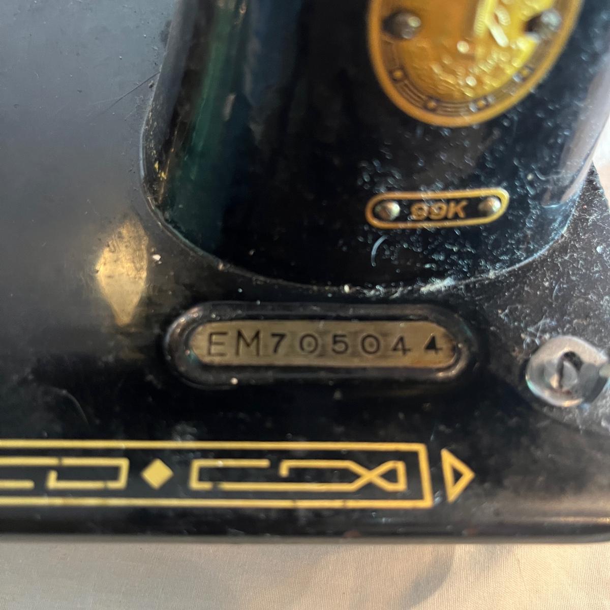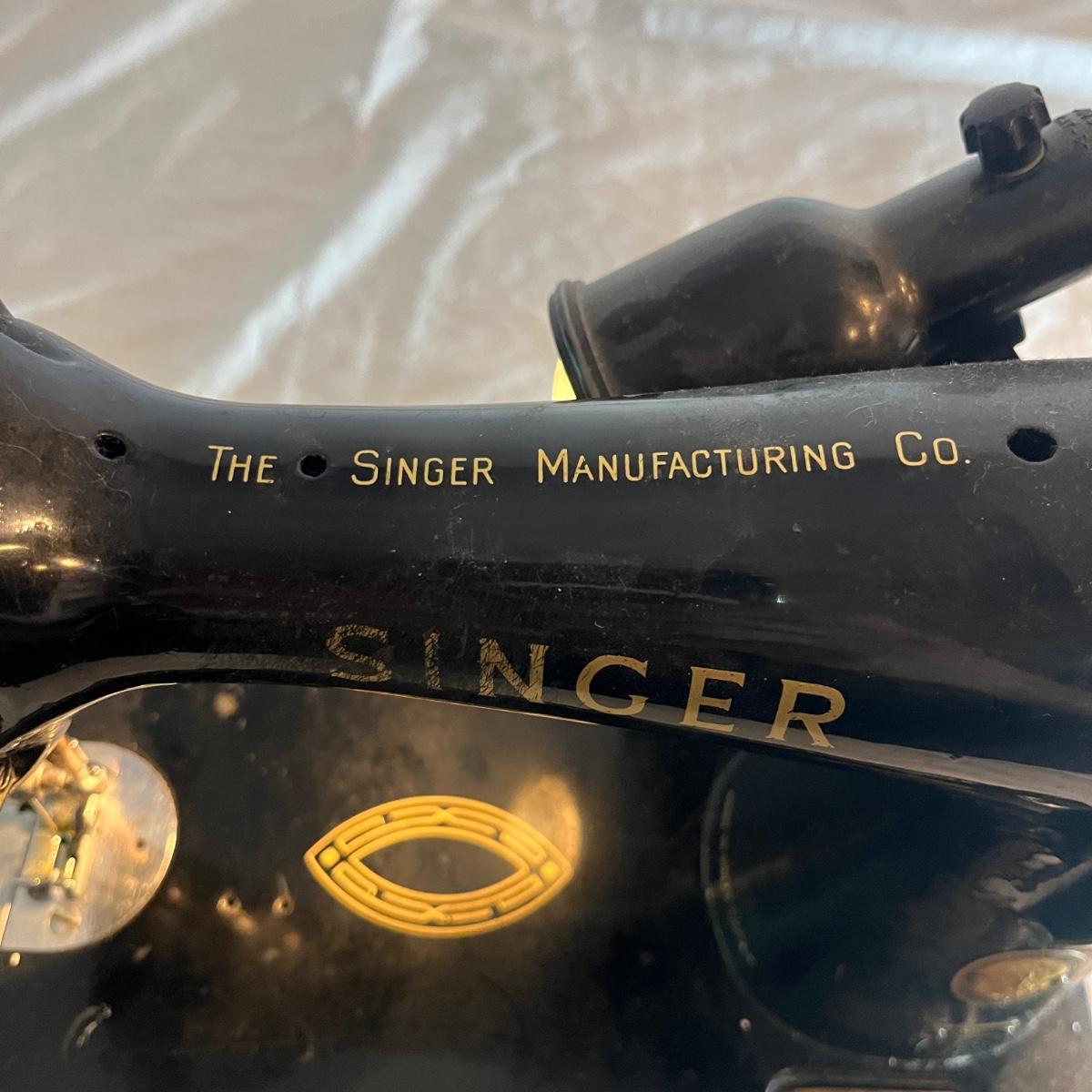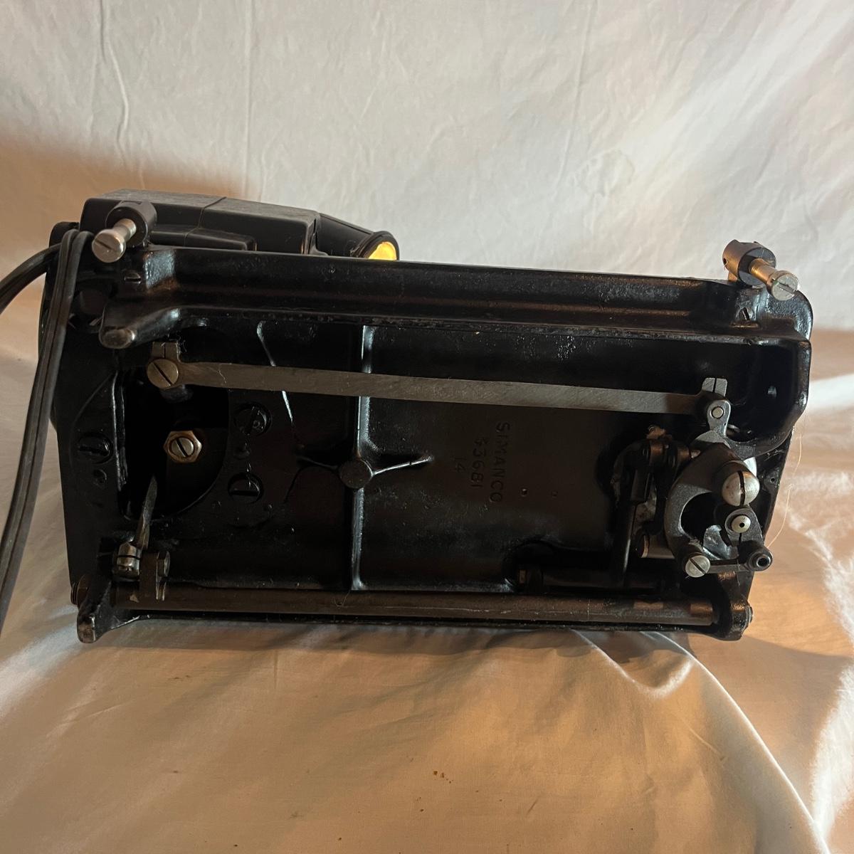 This Singer sewing machine has attached foot pedal, buttonhole attachment and instruction manual. Machine does not have case. Machine powered on when plugged in. Also includes NIB sewing machine music box. Singer machine measures 14” x 7.25” x 11.5”H.