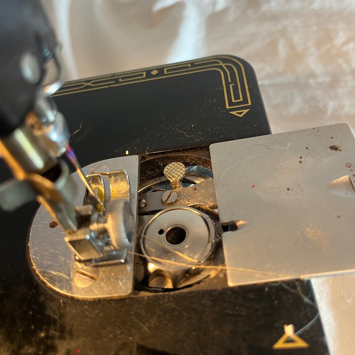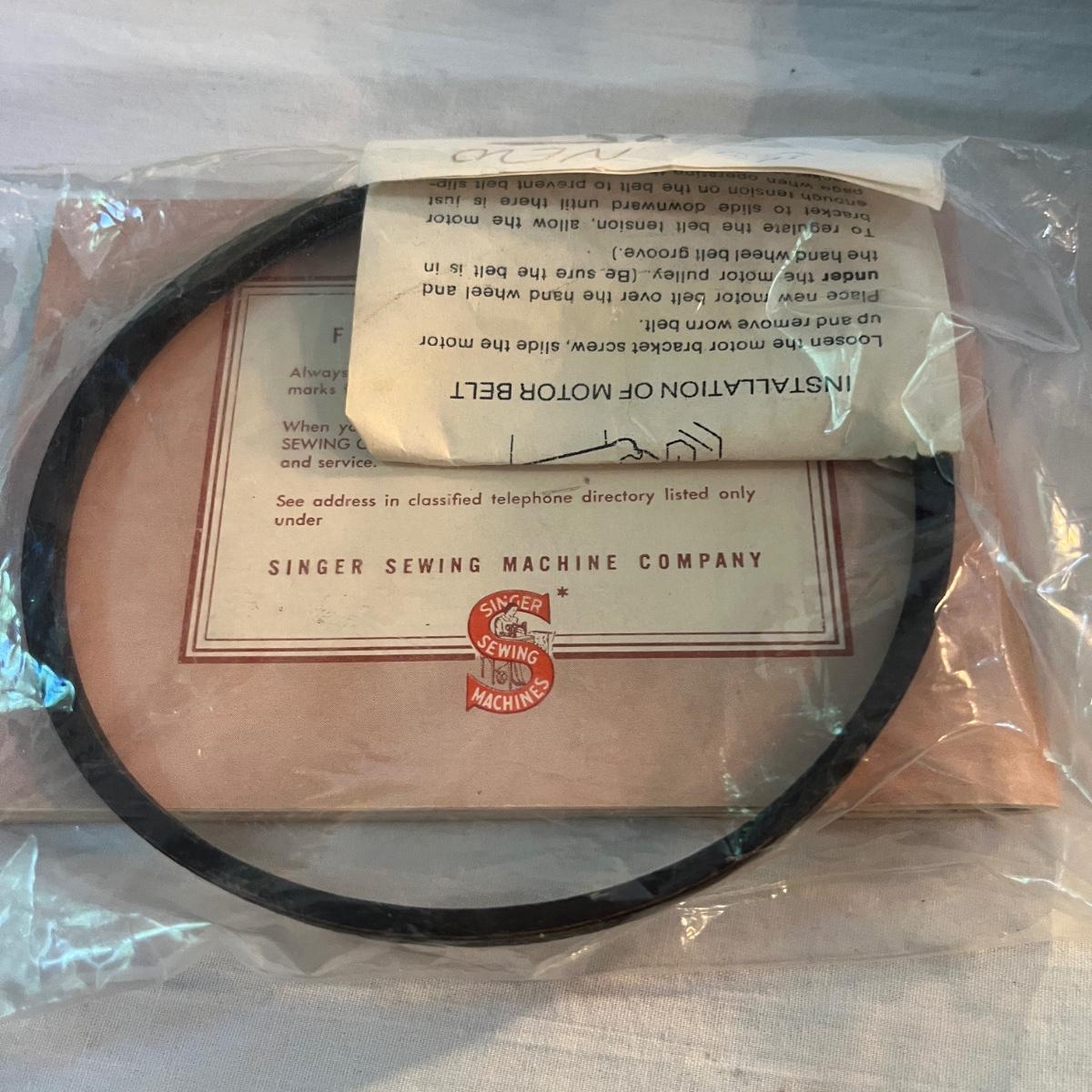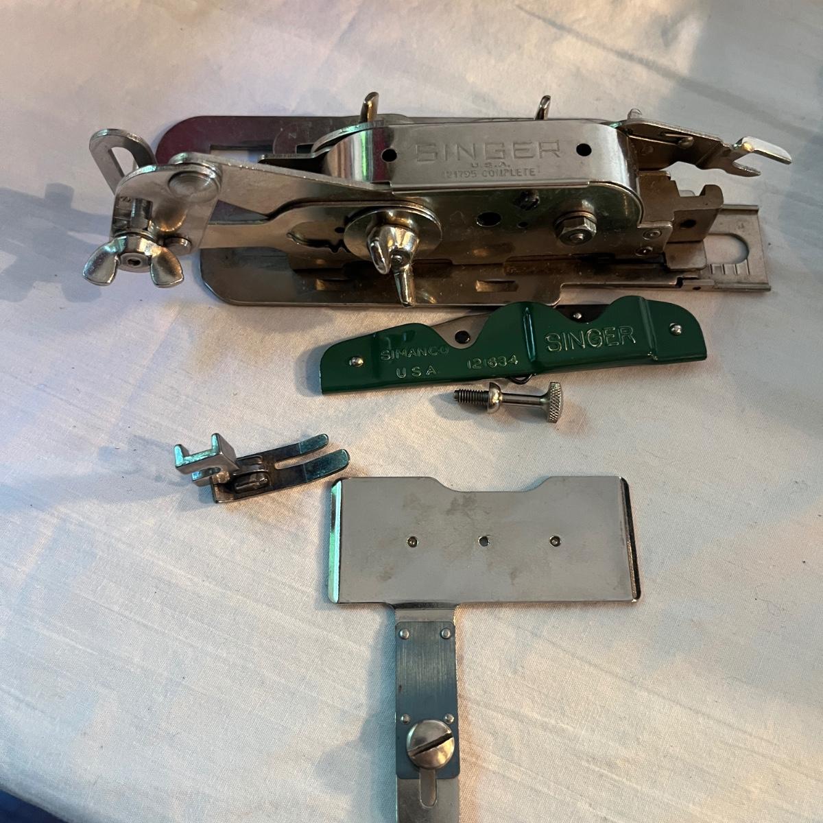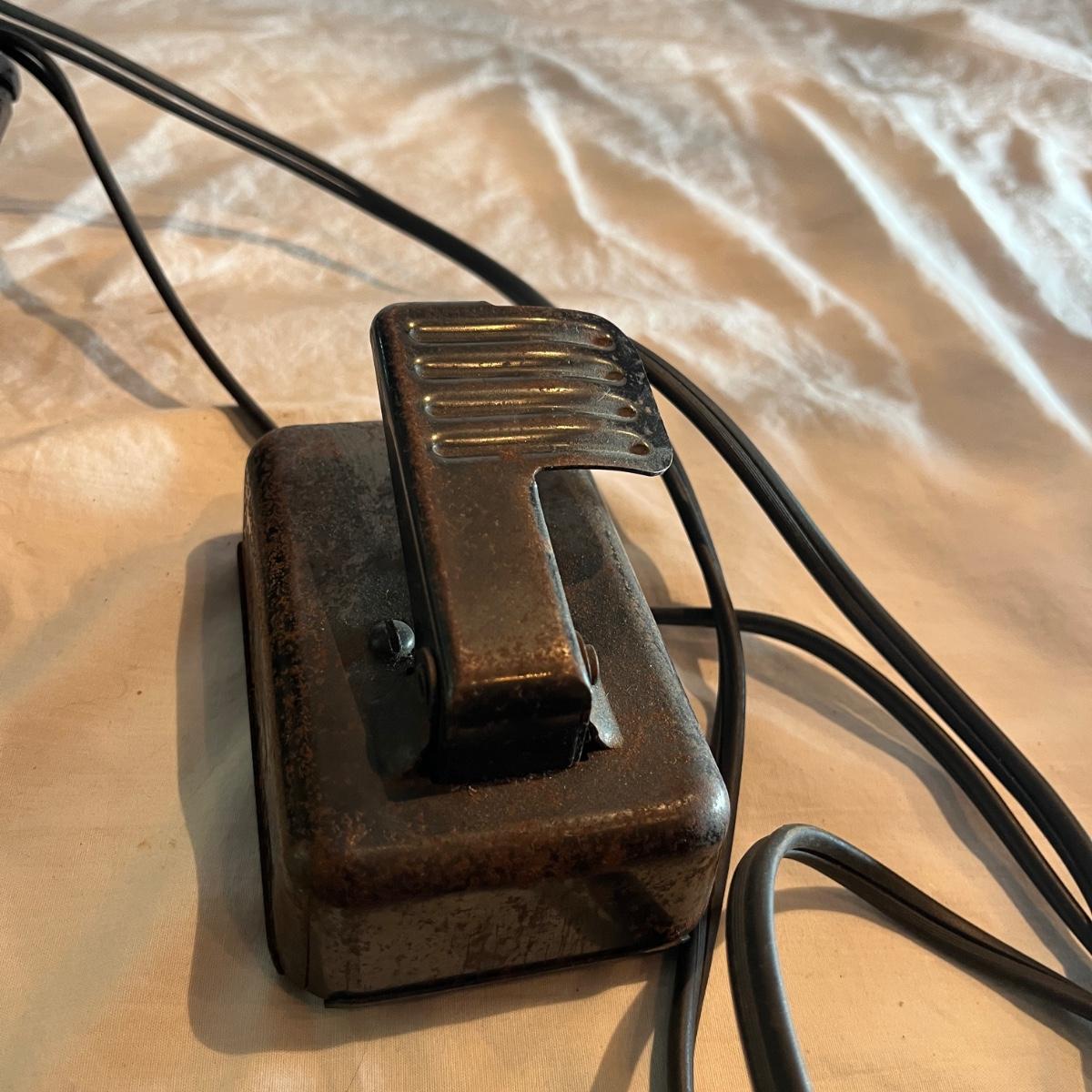 This Singer sewing machine has attached foot pedal, buttonhole attachment and instruction manual. Machine does not have case. Machine powered on when plugged in. Also includes NIB sewing machine music box. Singer machine measures 14” x 7.25” x 11.5”H.