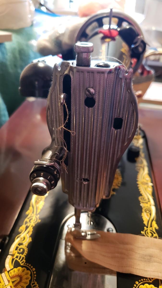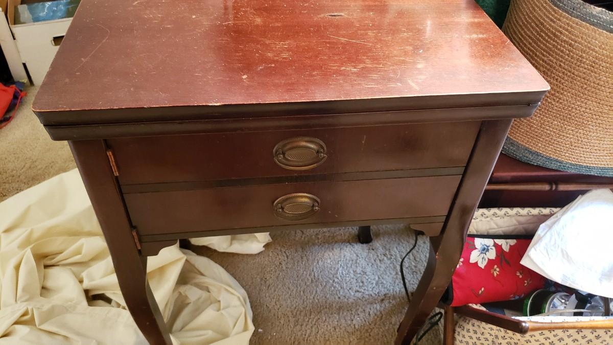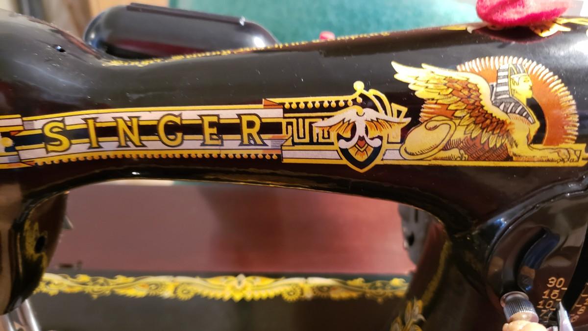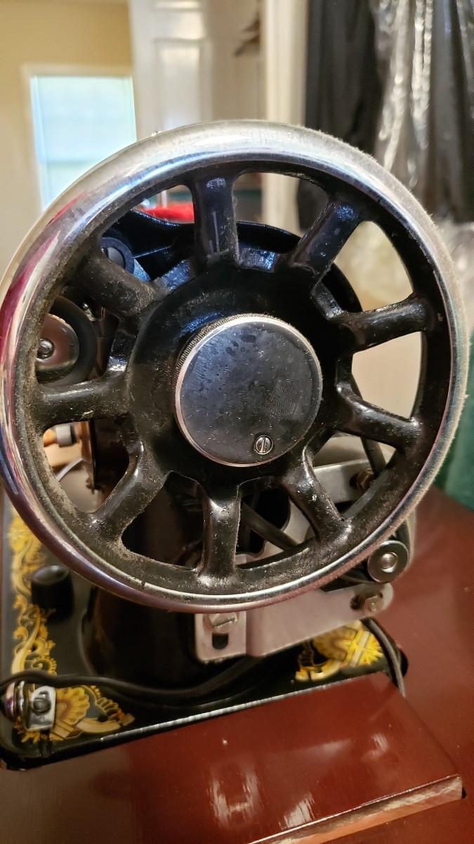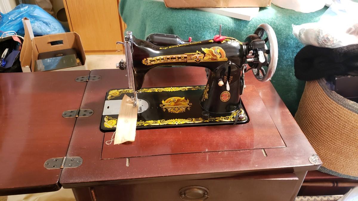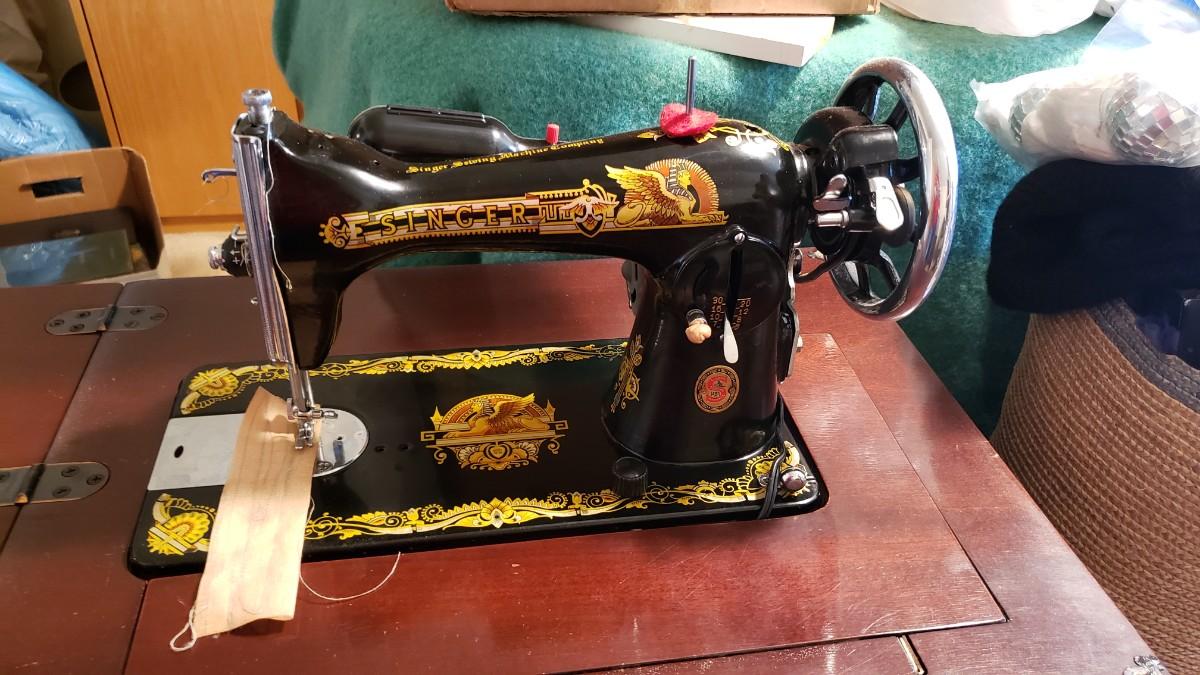 Antique singer sewing machine electrified with foot pedal.