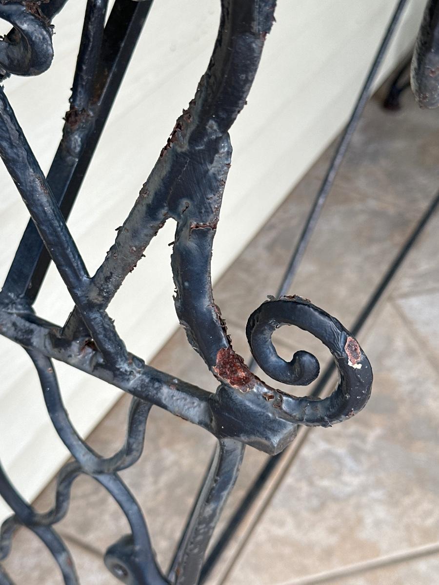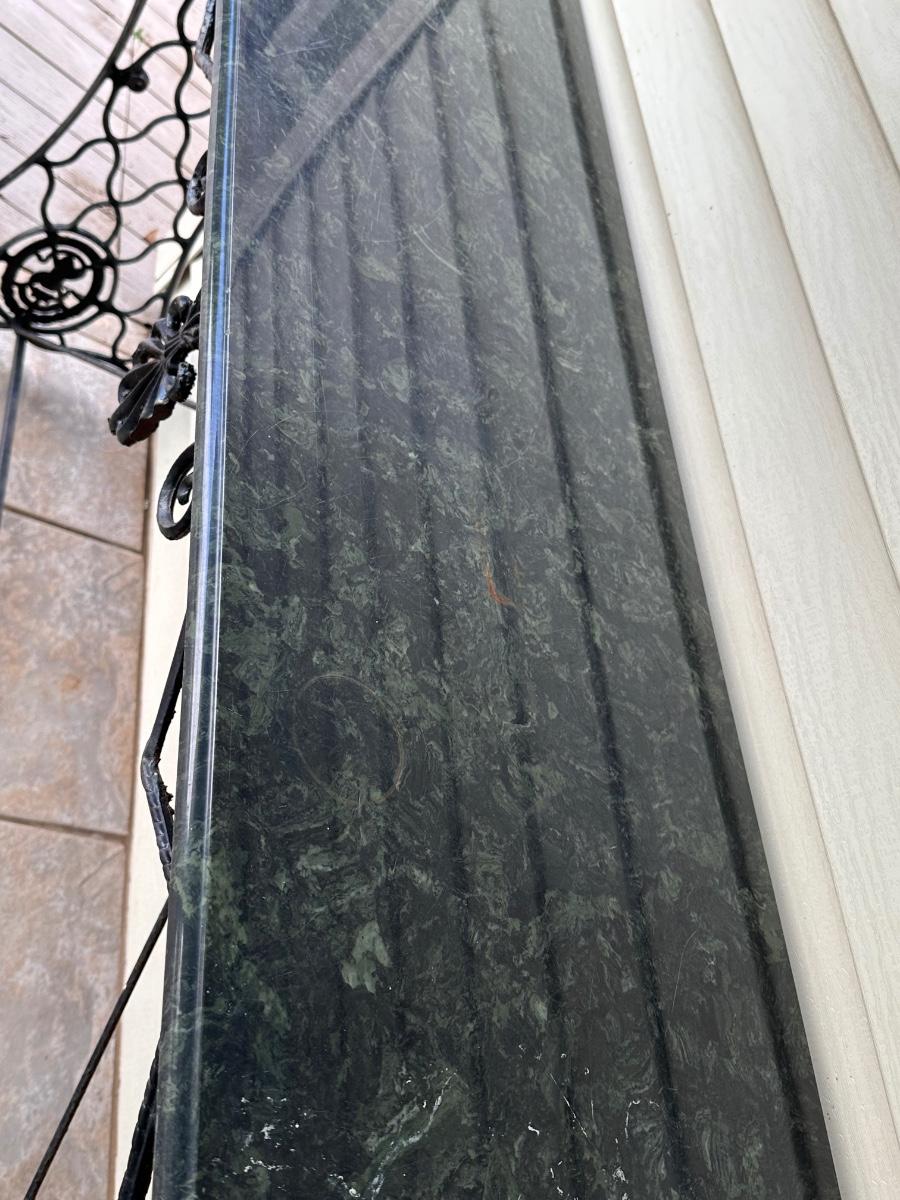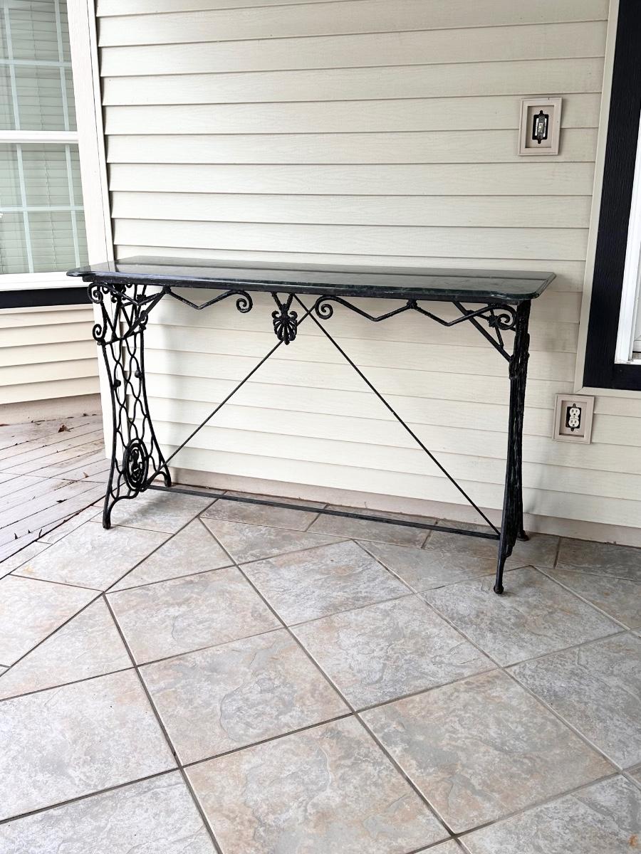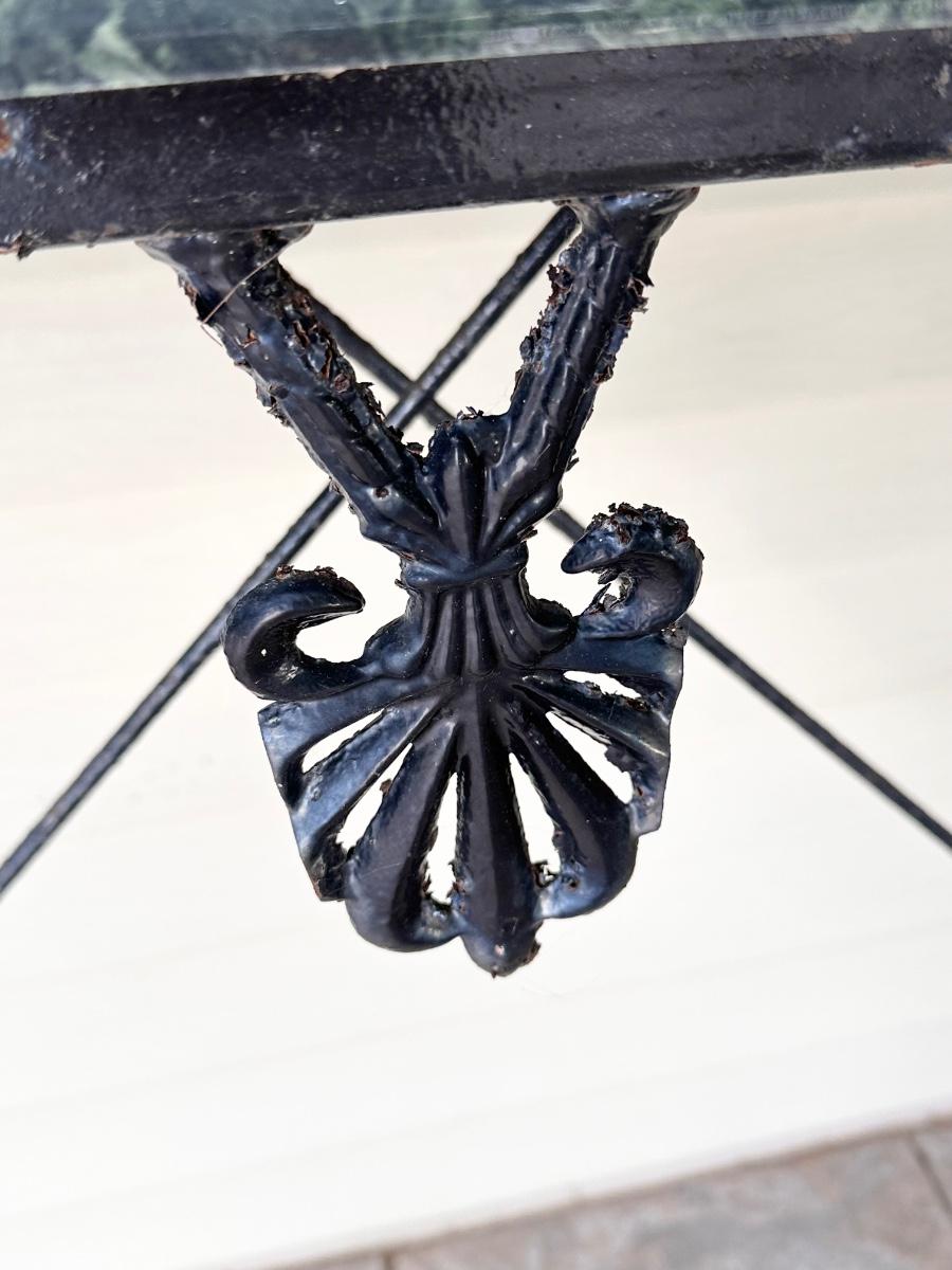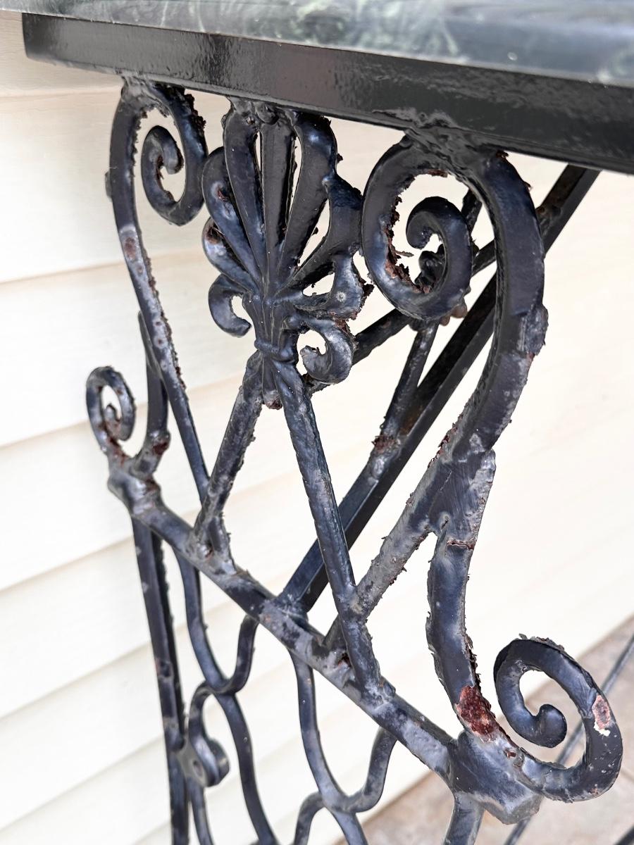 Has Green Marble Top ~ Has been porch kept outside ~ top has surface scratches from plants ~ used a a plant table ~ iron has some surface rusting (see photo) ~ could use some TLC ~ 38.5” H x 64” W x 19” D ~ The bottom rod needs a screw on one side.